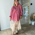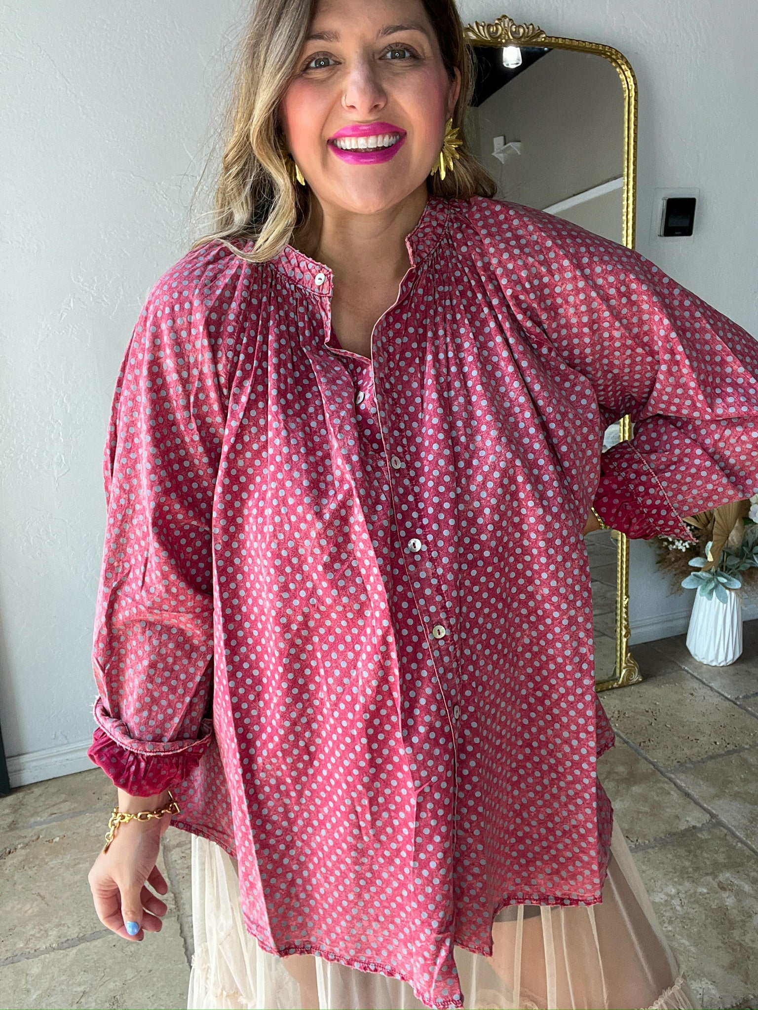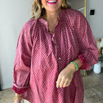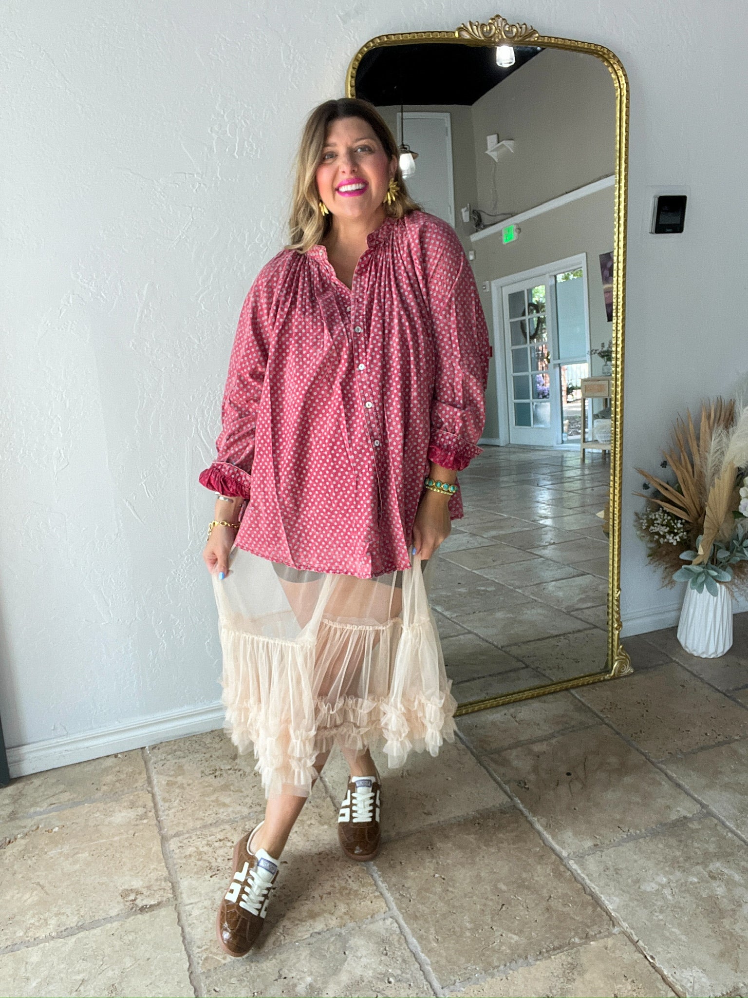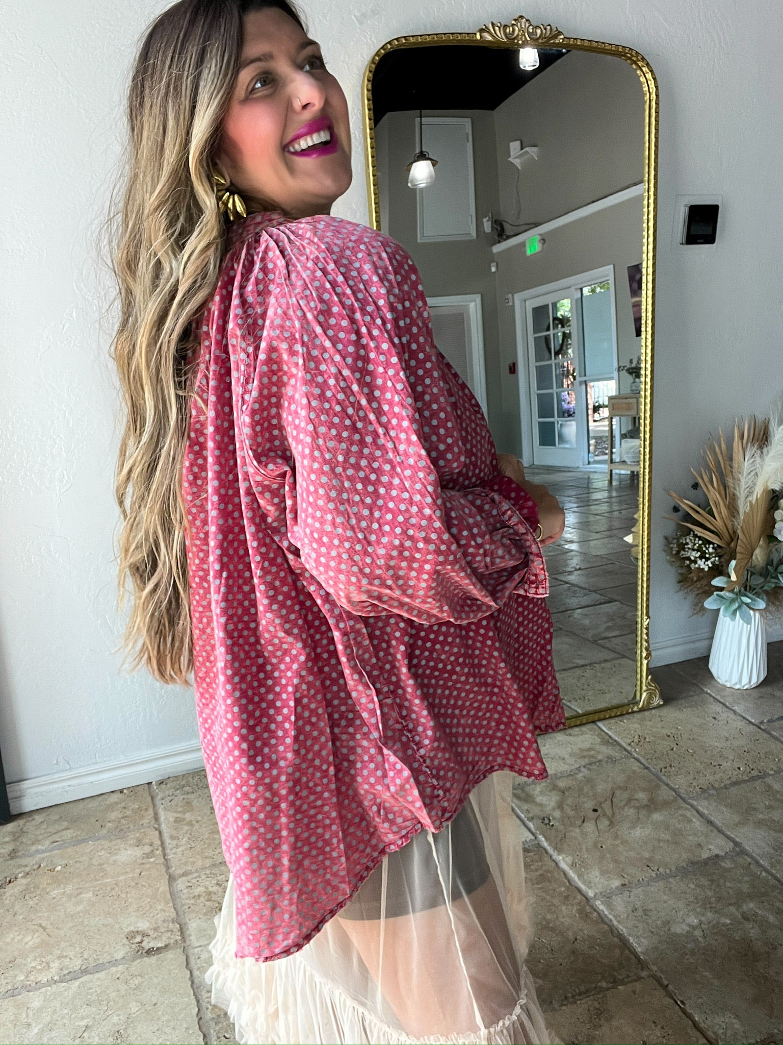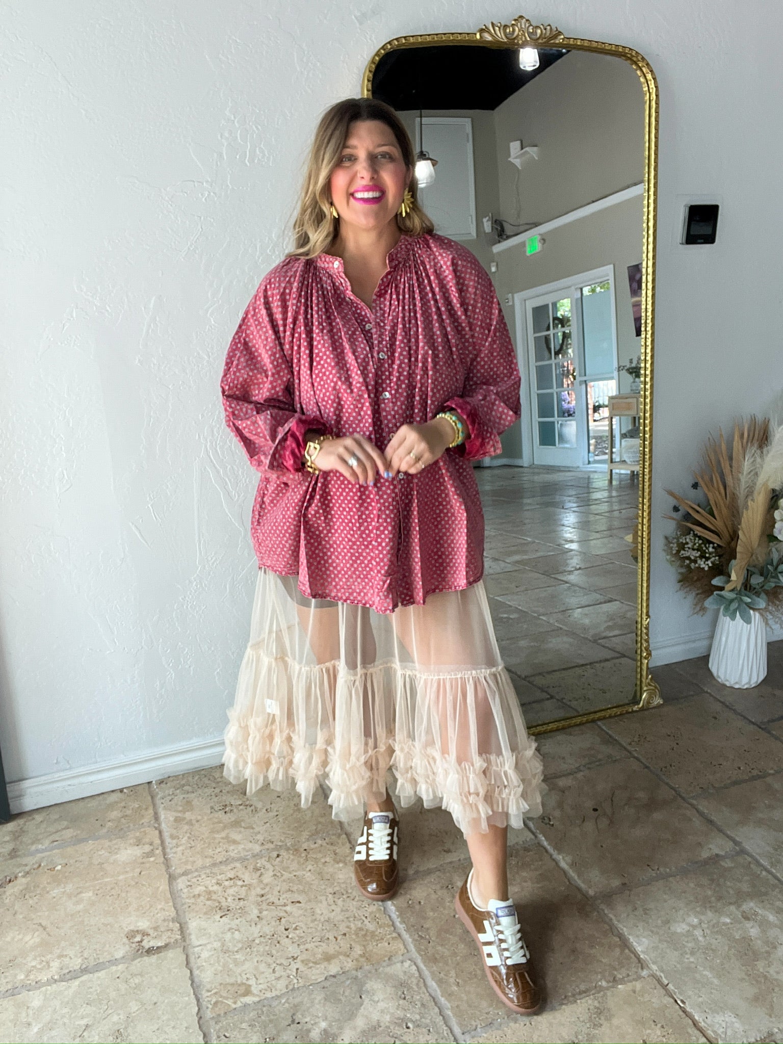 Fall for every dot and detail—our Heart’s Desire Button-Up by Jaded Gypsy is a lightweight cotton dream with all the charm of a vintage find. In a washed brick red with sweet polka dots throughout, it’s got that easy, oversized fit you’ll want to live in. Wear it buttoned as a top, open as a layer, or knotted at the waist. One top, endless stories.