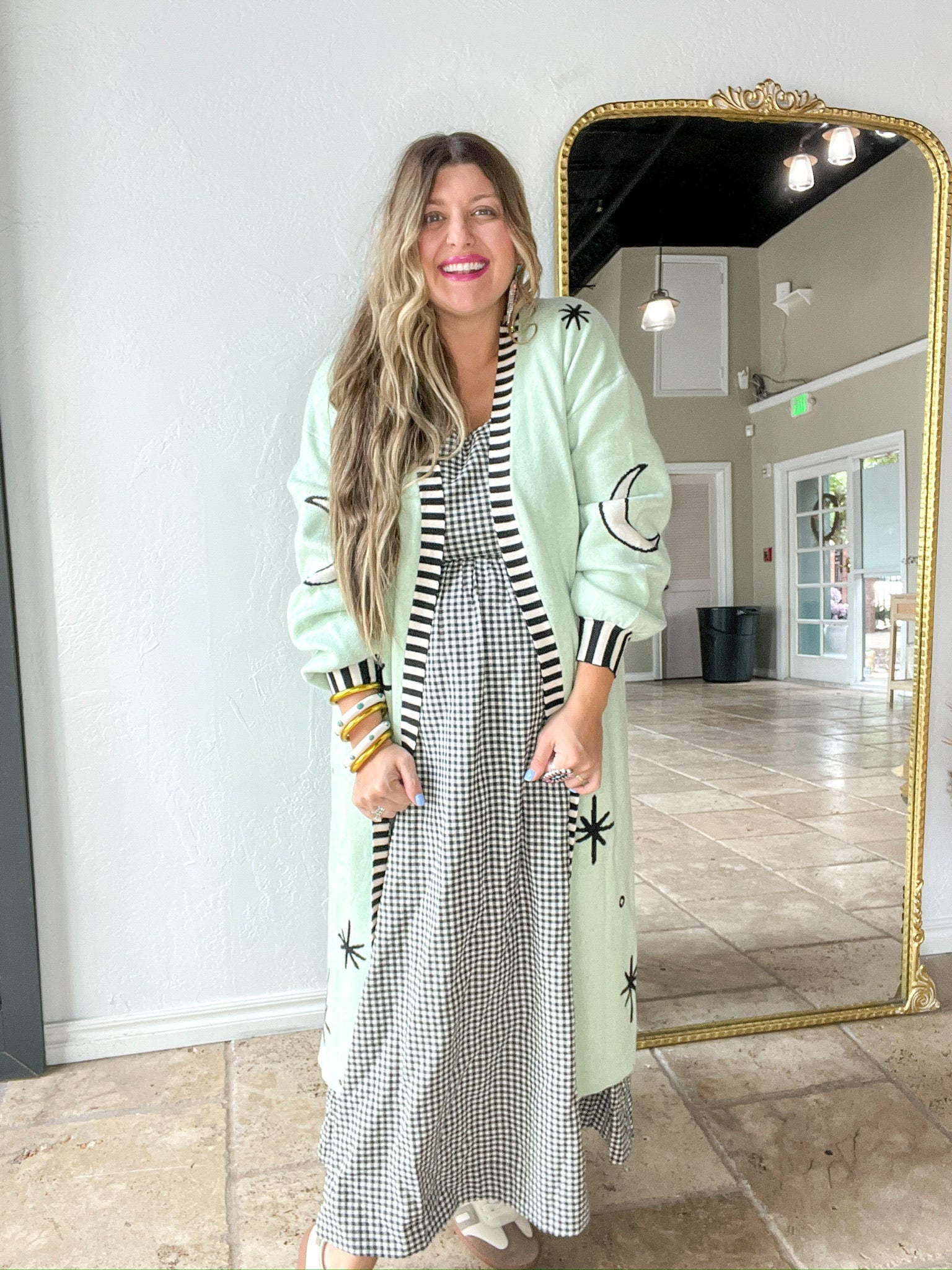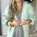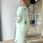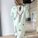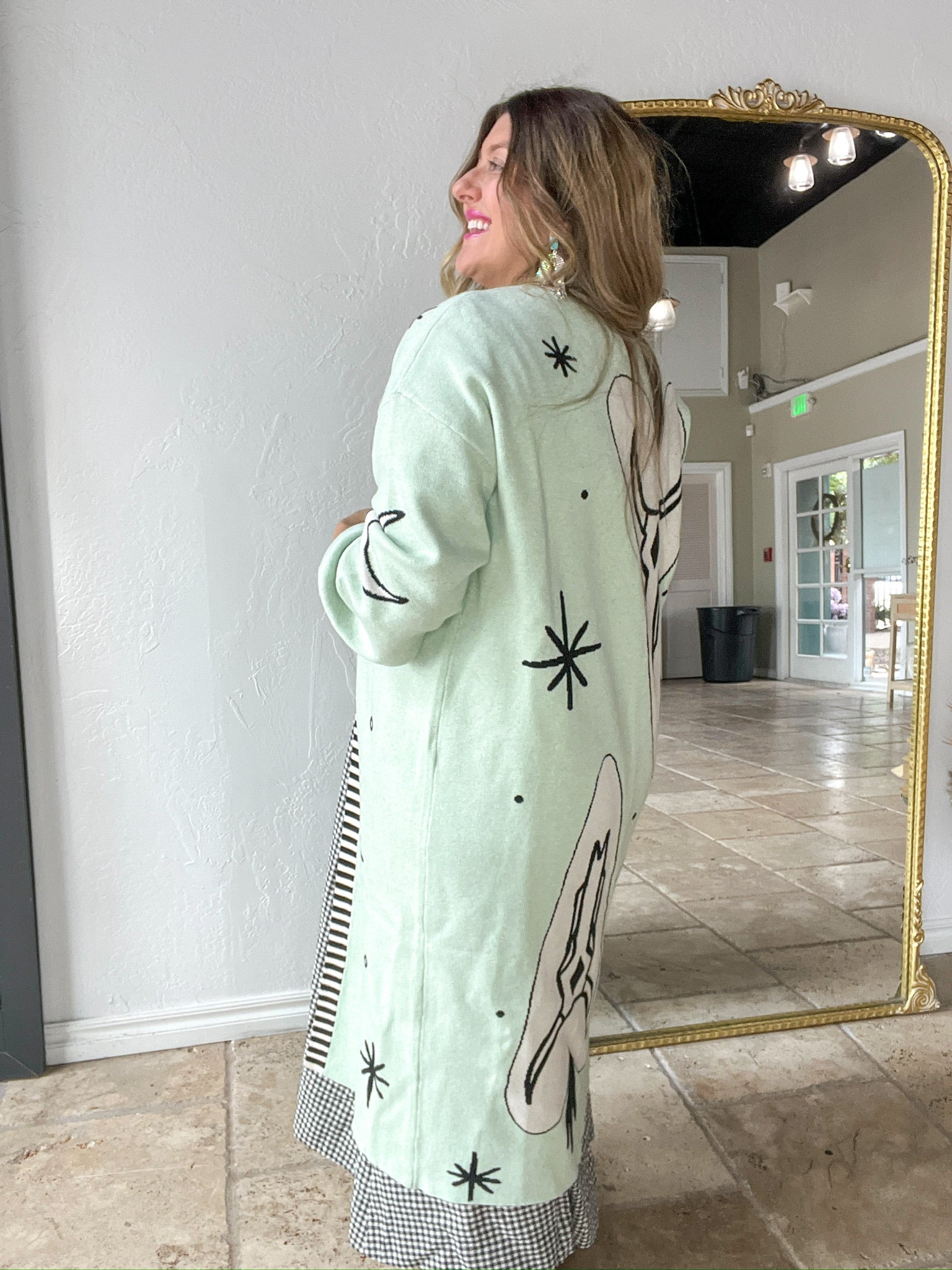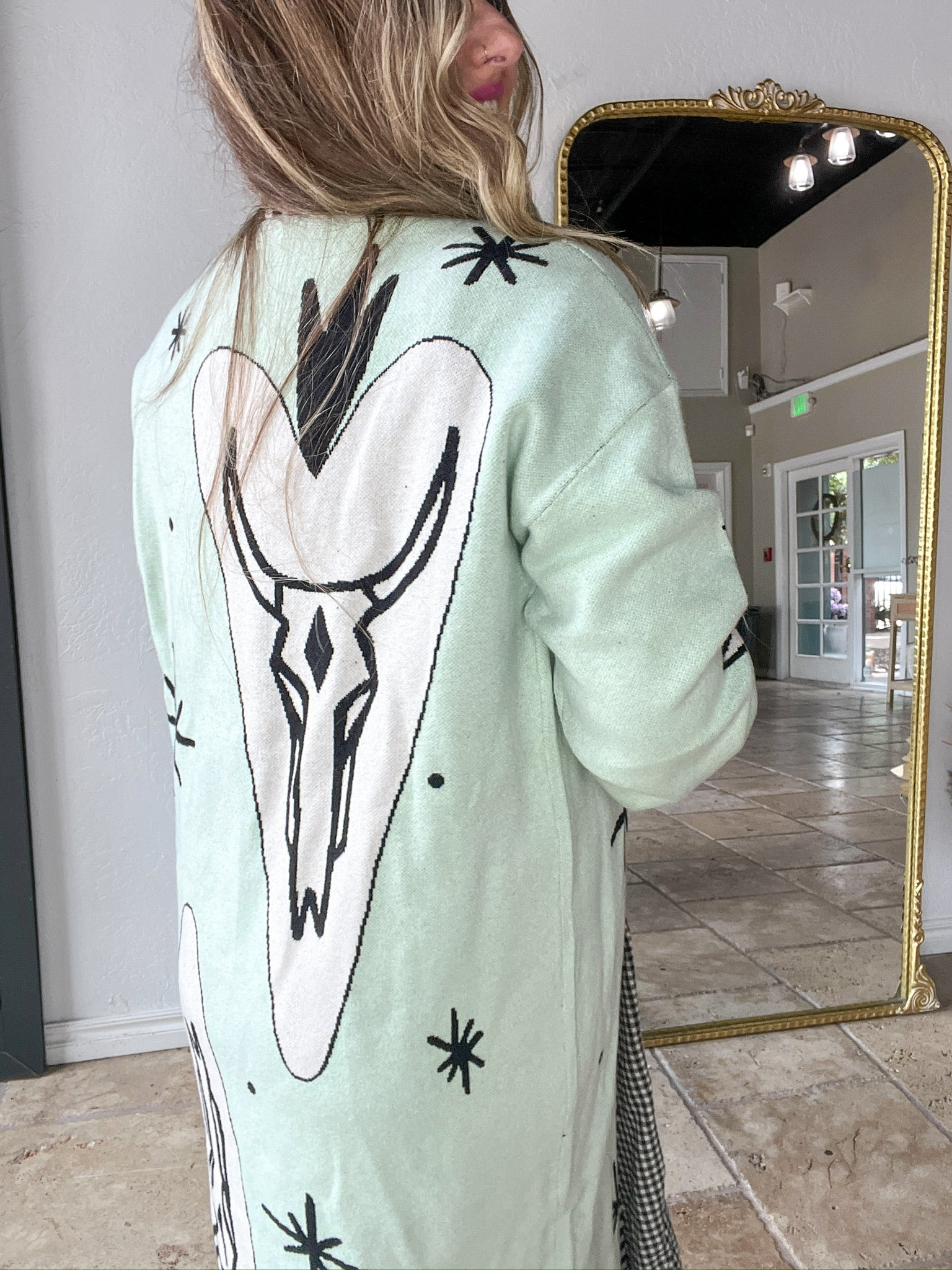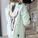 For the ones who wear their passion proudly—this desert dream by Allie Falcon sets your heart ablaze. With bold stitched hearts, bull skull motifs, and cosmic bursts across a sunset canvas, this cardigan doesn’t whisper Western—it shouts it. Whether you’re headed to the rodeo or just chasing good energy, this one’s got main character energy.