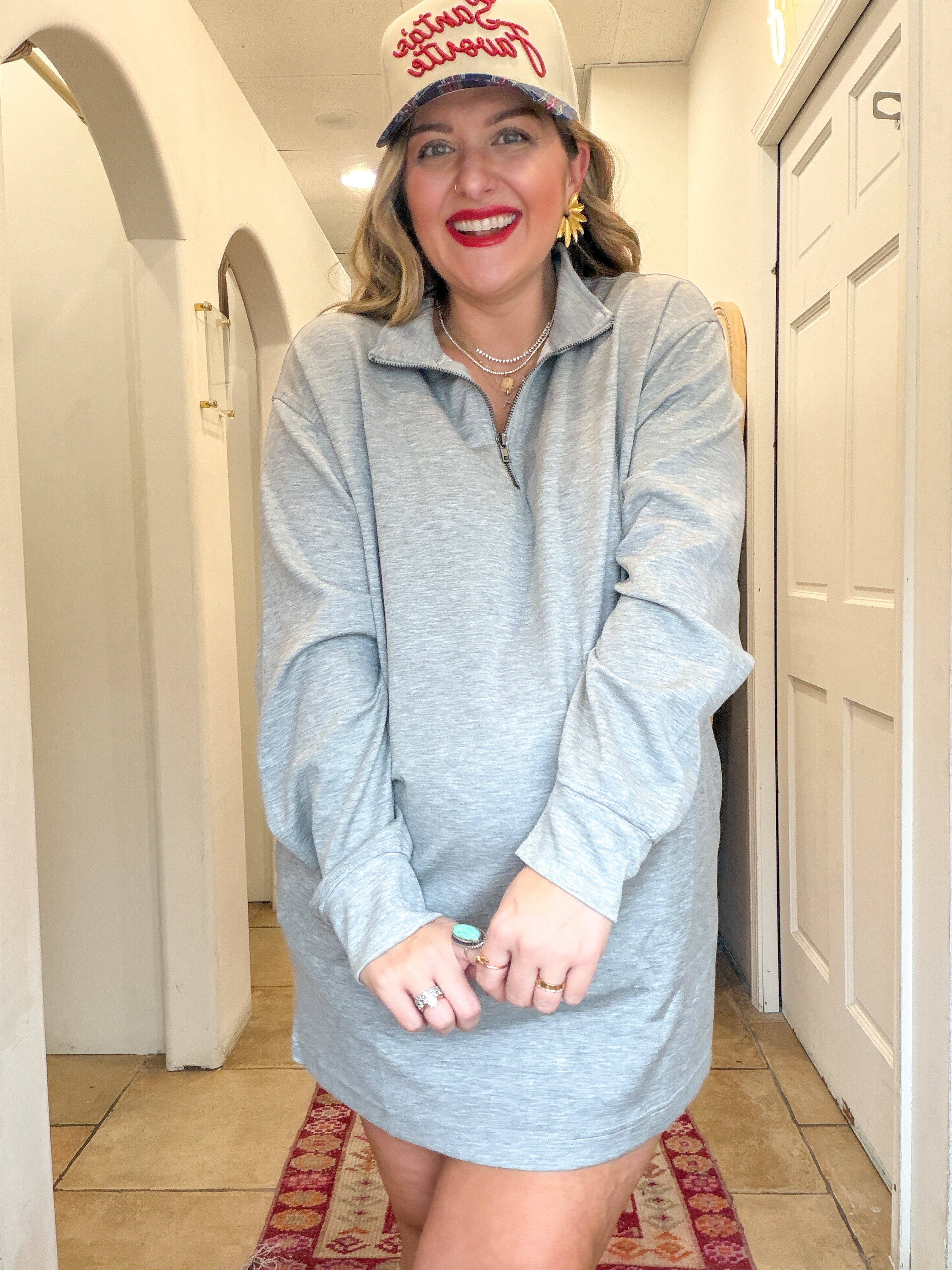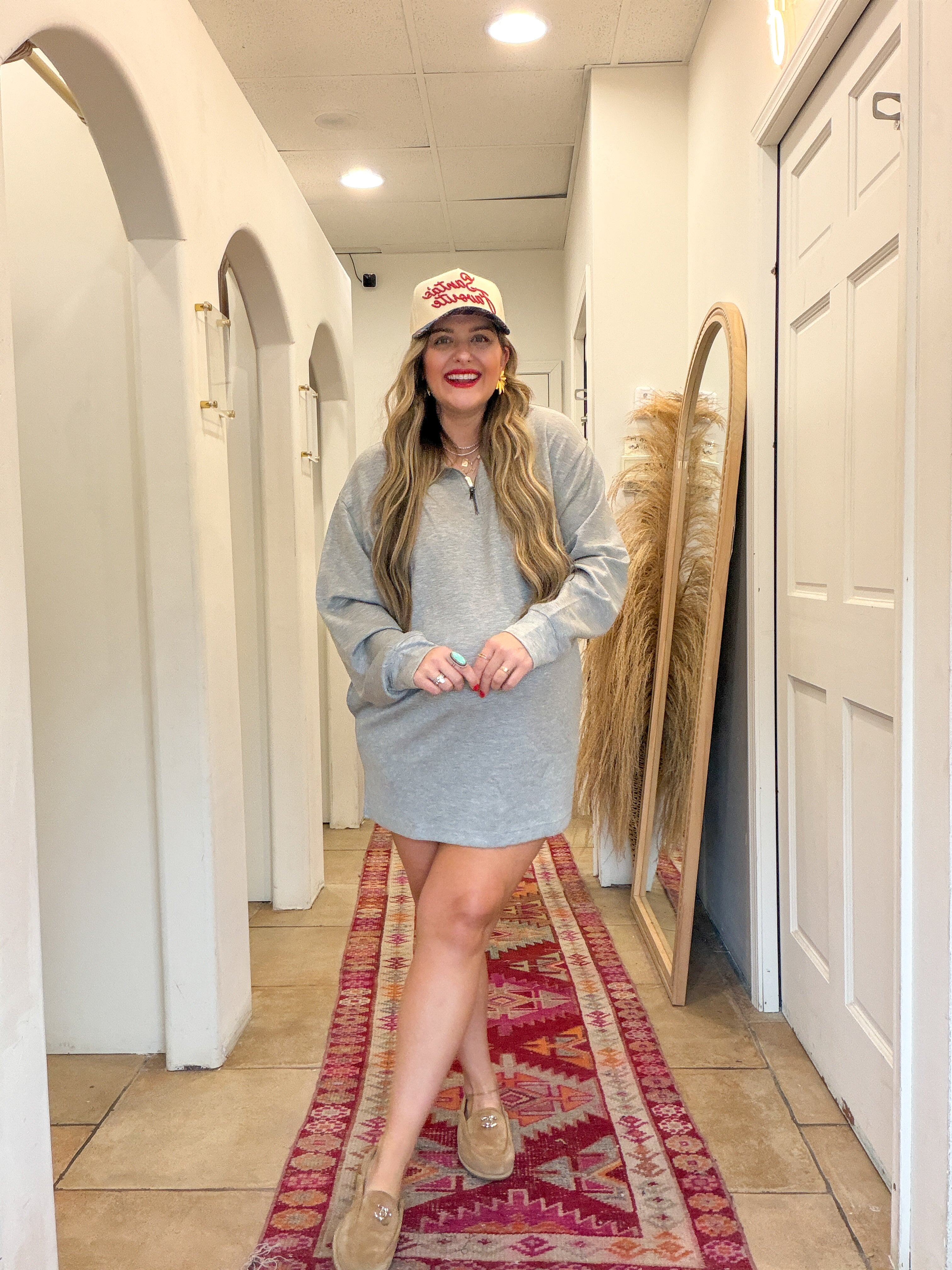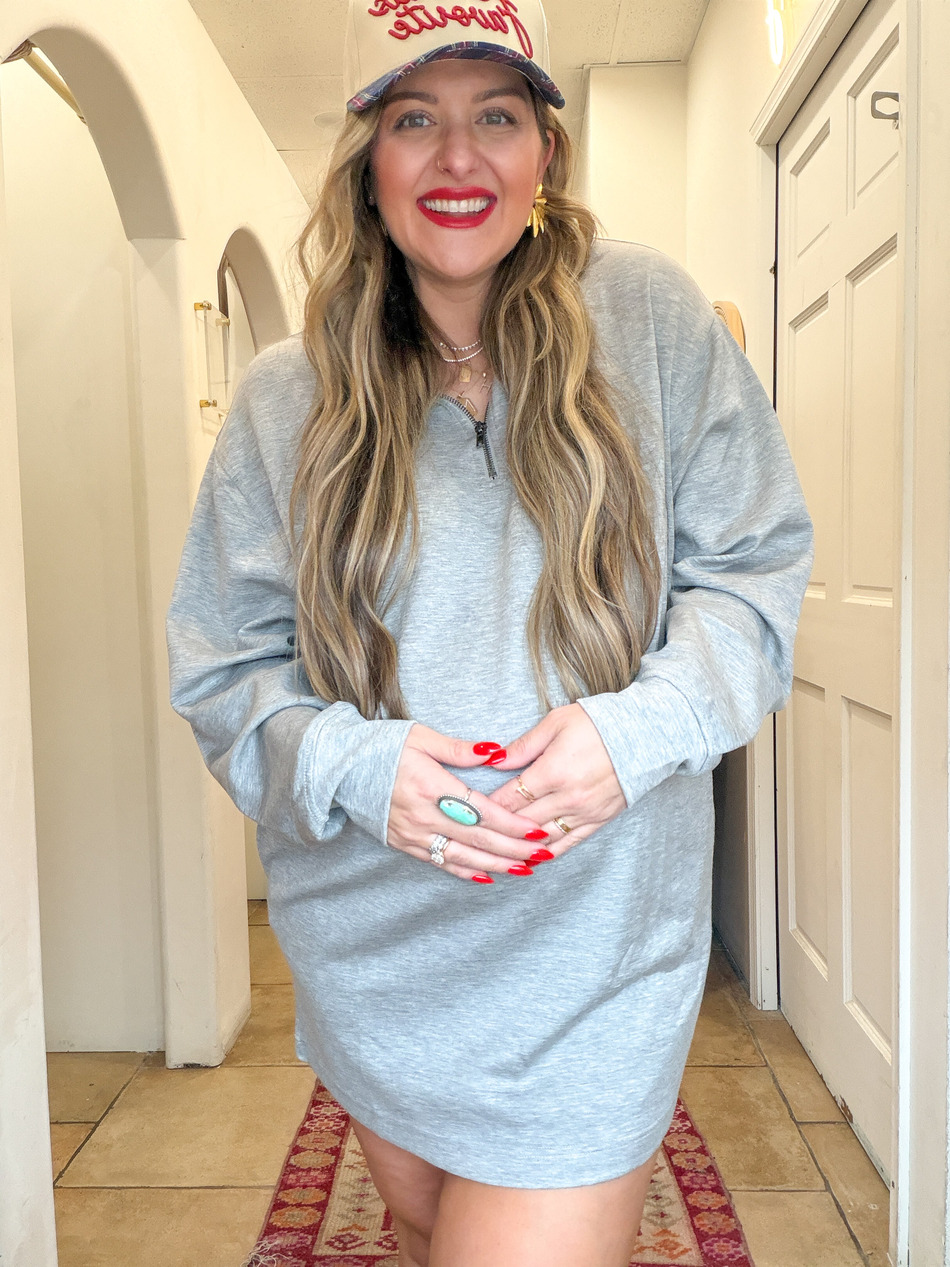 If athleisure and chic had a baby, it would be this dress. This heather gray half-zip mini is soft, stretchy, and built for the girl who wants to look put-together without actually trying. It’s basically your favorite sweatshirt… leveled up into a full outfit.
