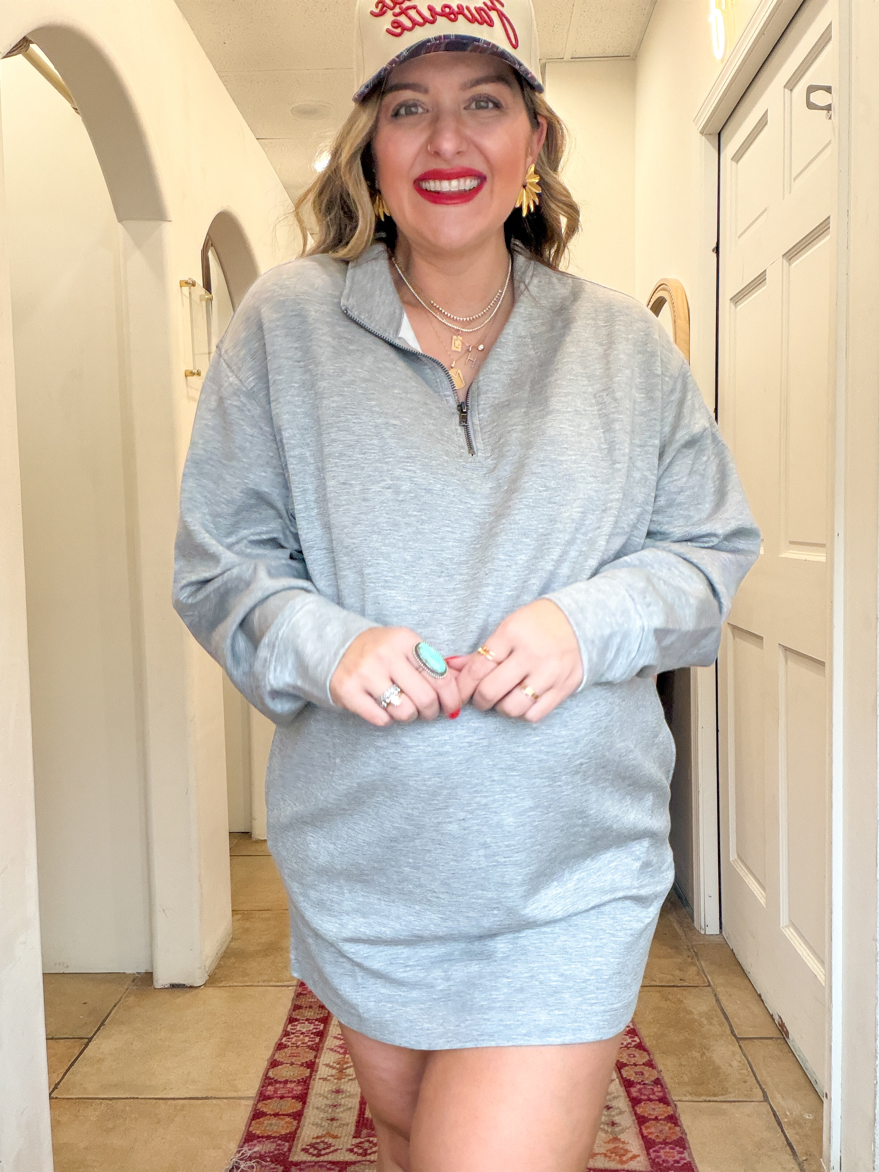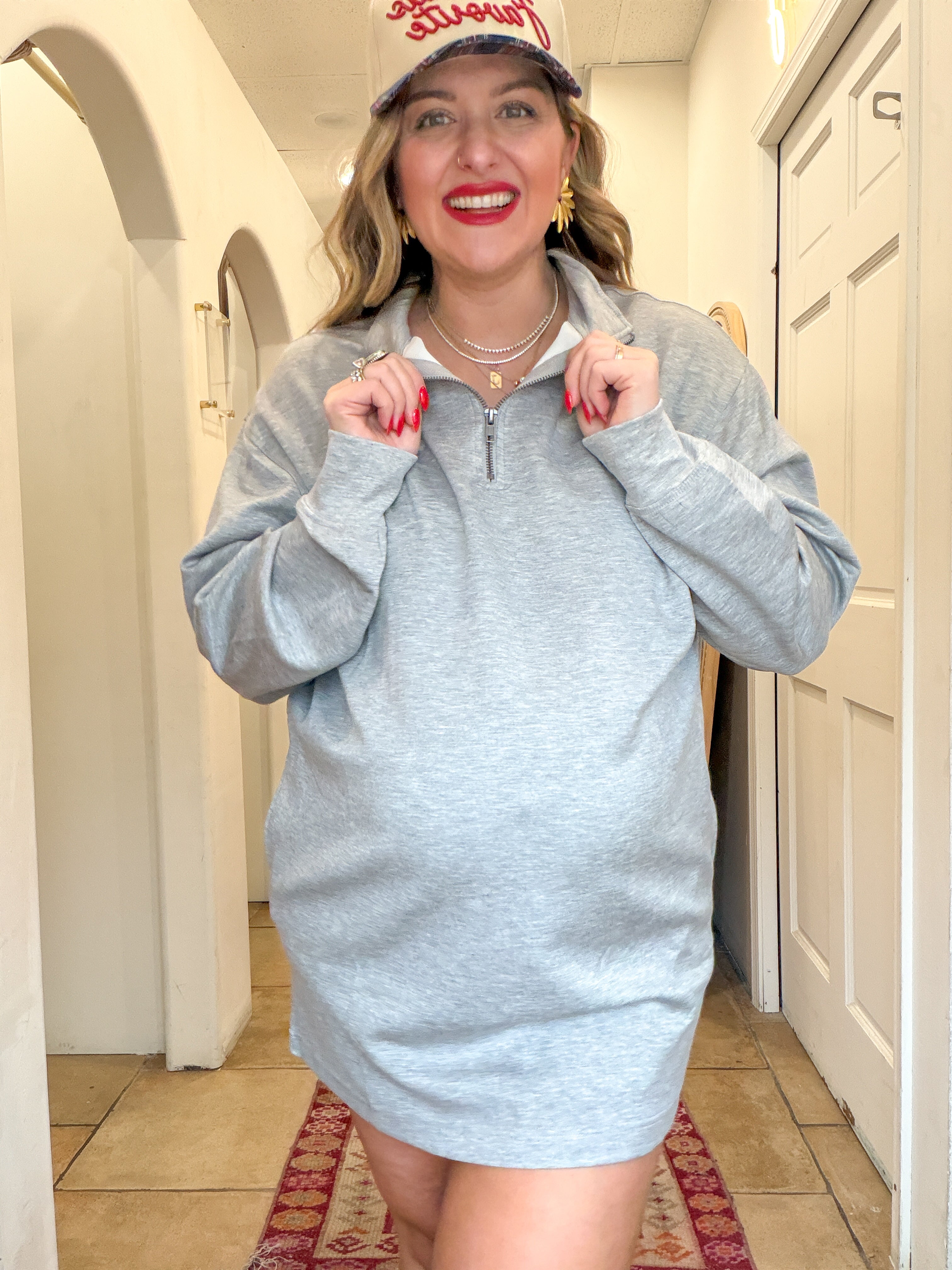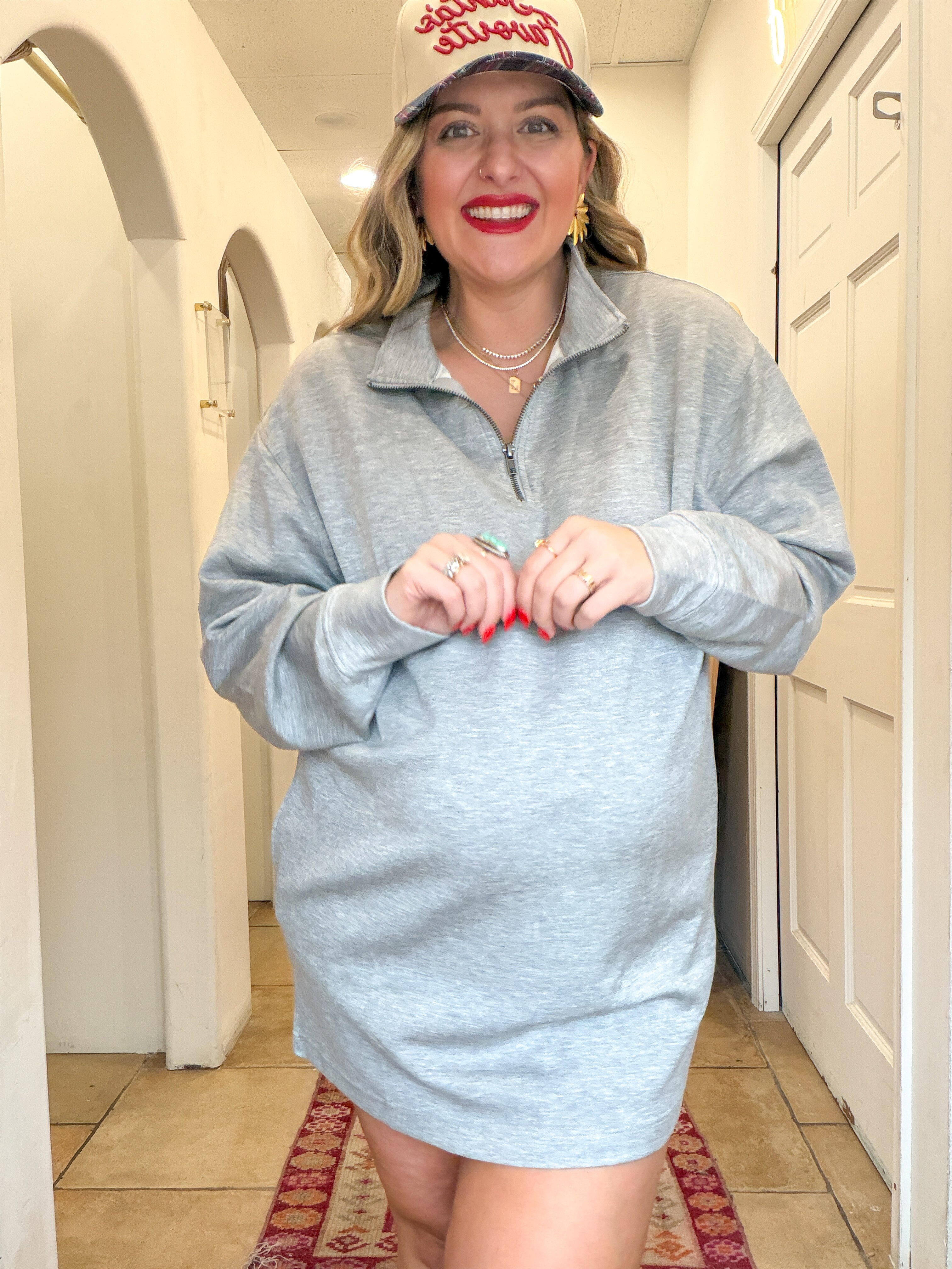 If athleisure and chic had a baby, it would be this dress. This heather gray half-zip mini is soft, stretchy, and built for the girl who wants to look put-together without actually trying. It’s basically your favorite sweatshirt… leveled up into a full outfit.