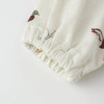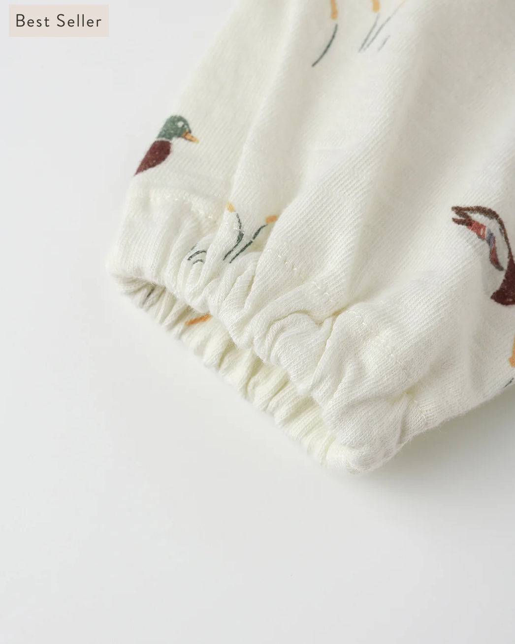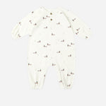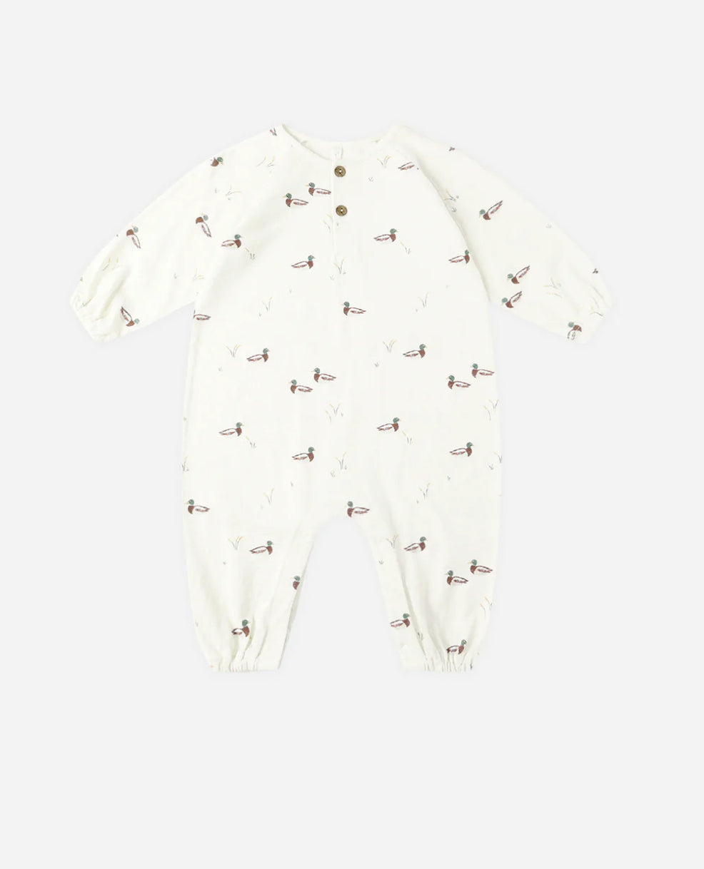 Our Henley Jumpsuit features a bubble silhouette with elasticized wrist and ankle openings, a two-button front placket, and bottom snaps for easy changes.