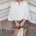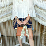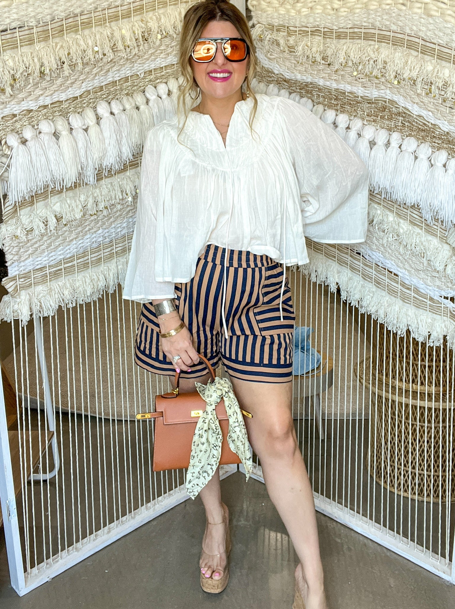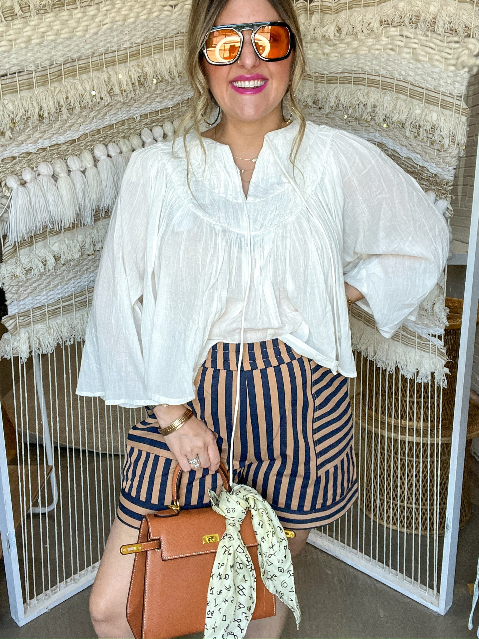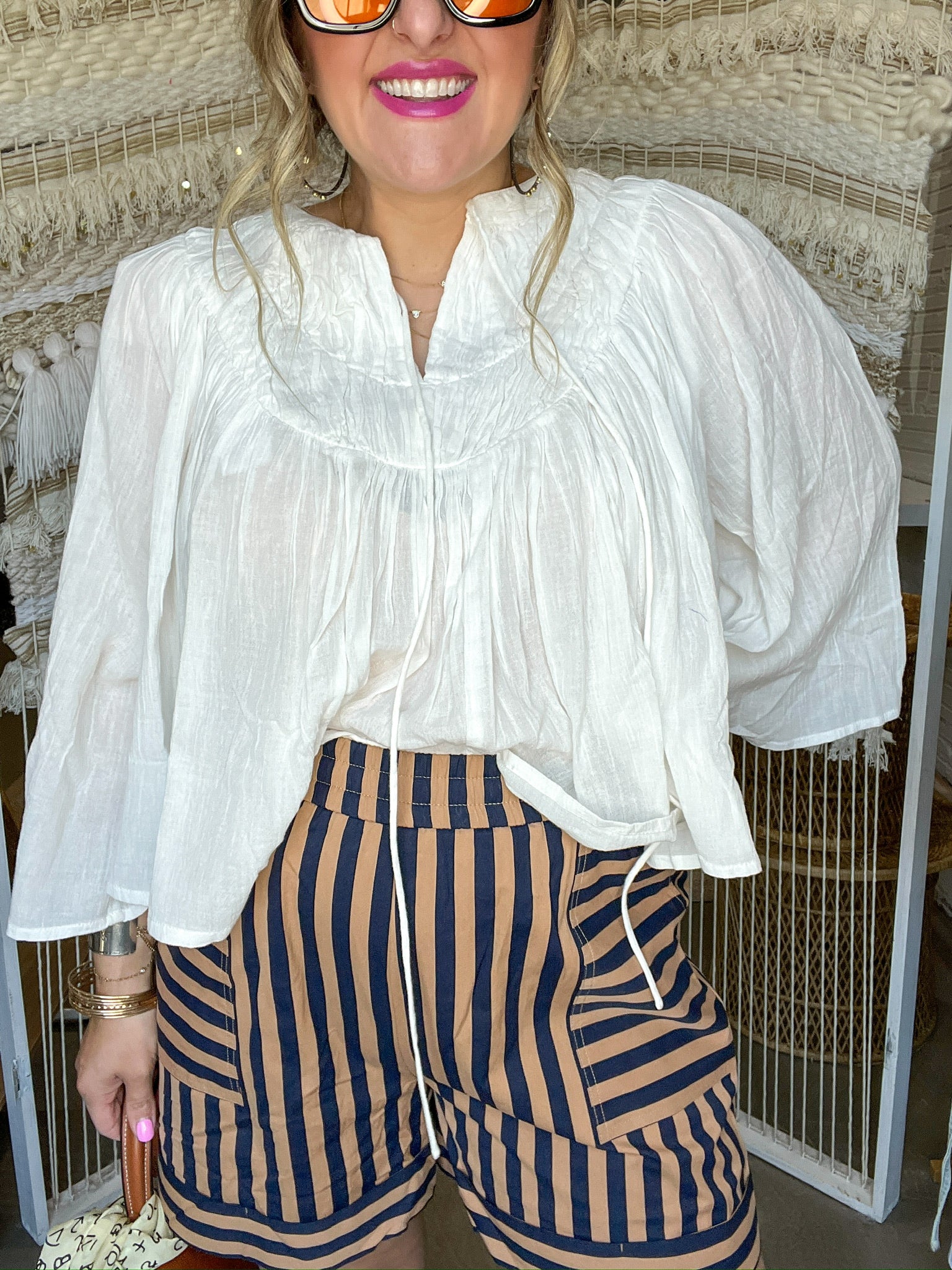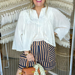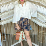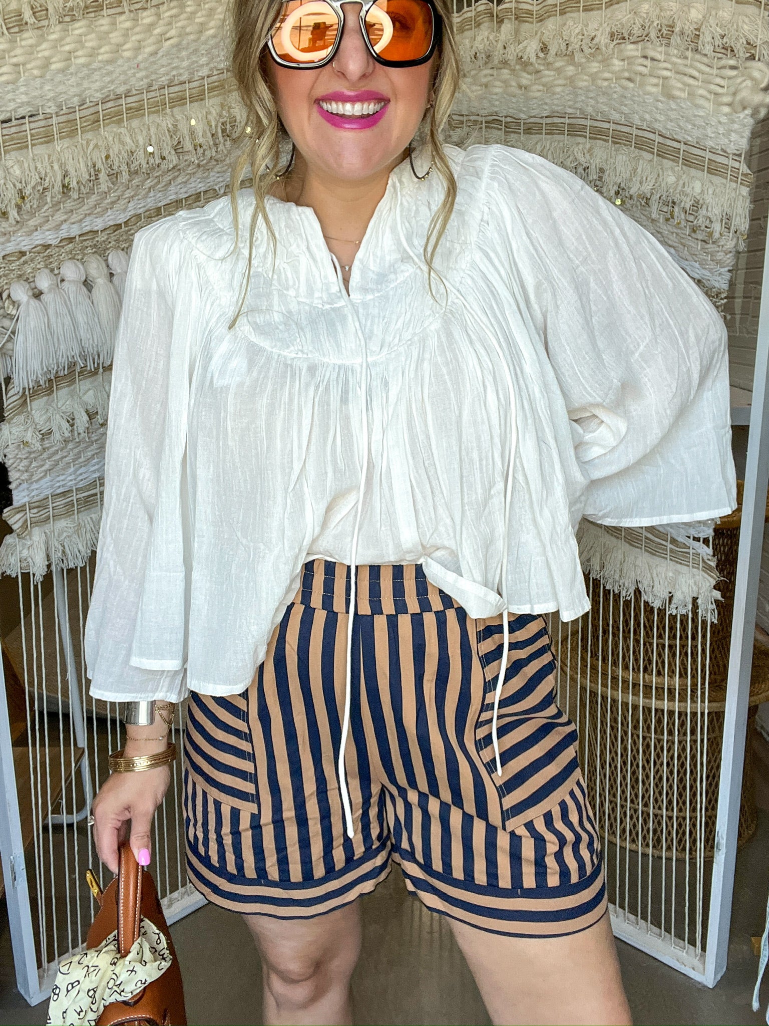A little western, a little retro, a whole lotta cool—these striped shorts are giving Johnny Cash meets Saturday soul train. With bold navy and rust stripes and oversized patch pockets, they’re ready to two-step through summer in true groovy fashion. Inspired by the iconic song Hey Porter, they’ve got that “catch the train, chase the sun” kind of energy.