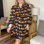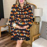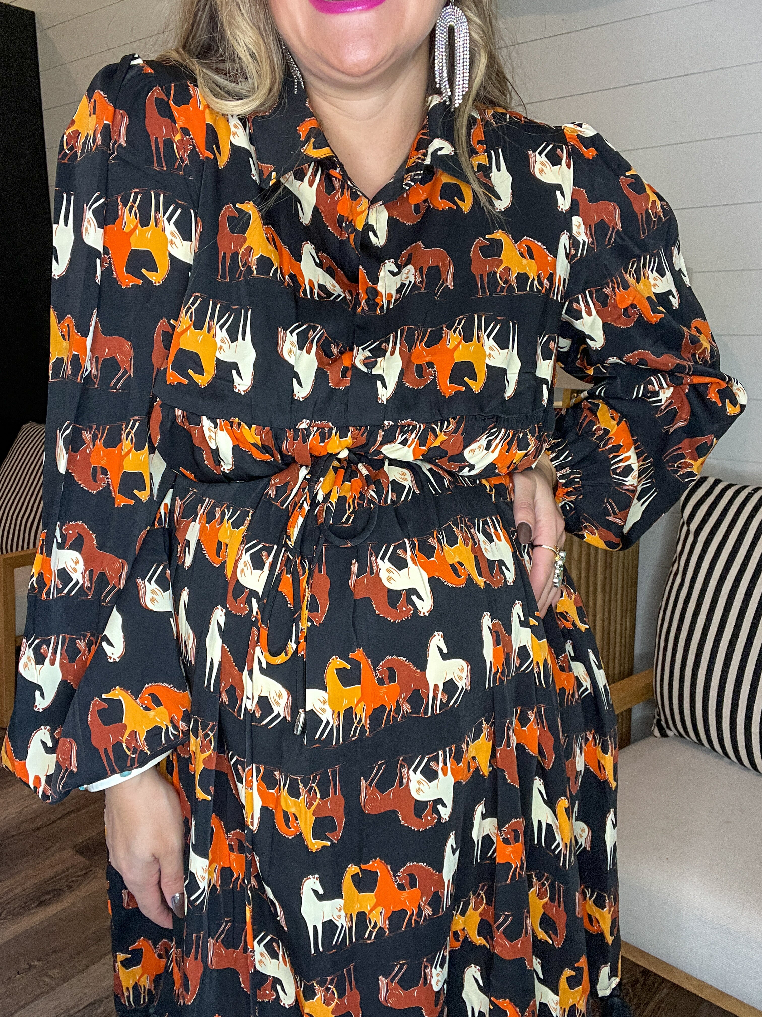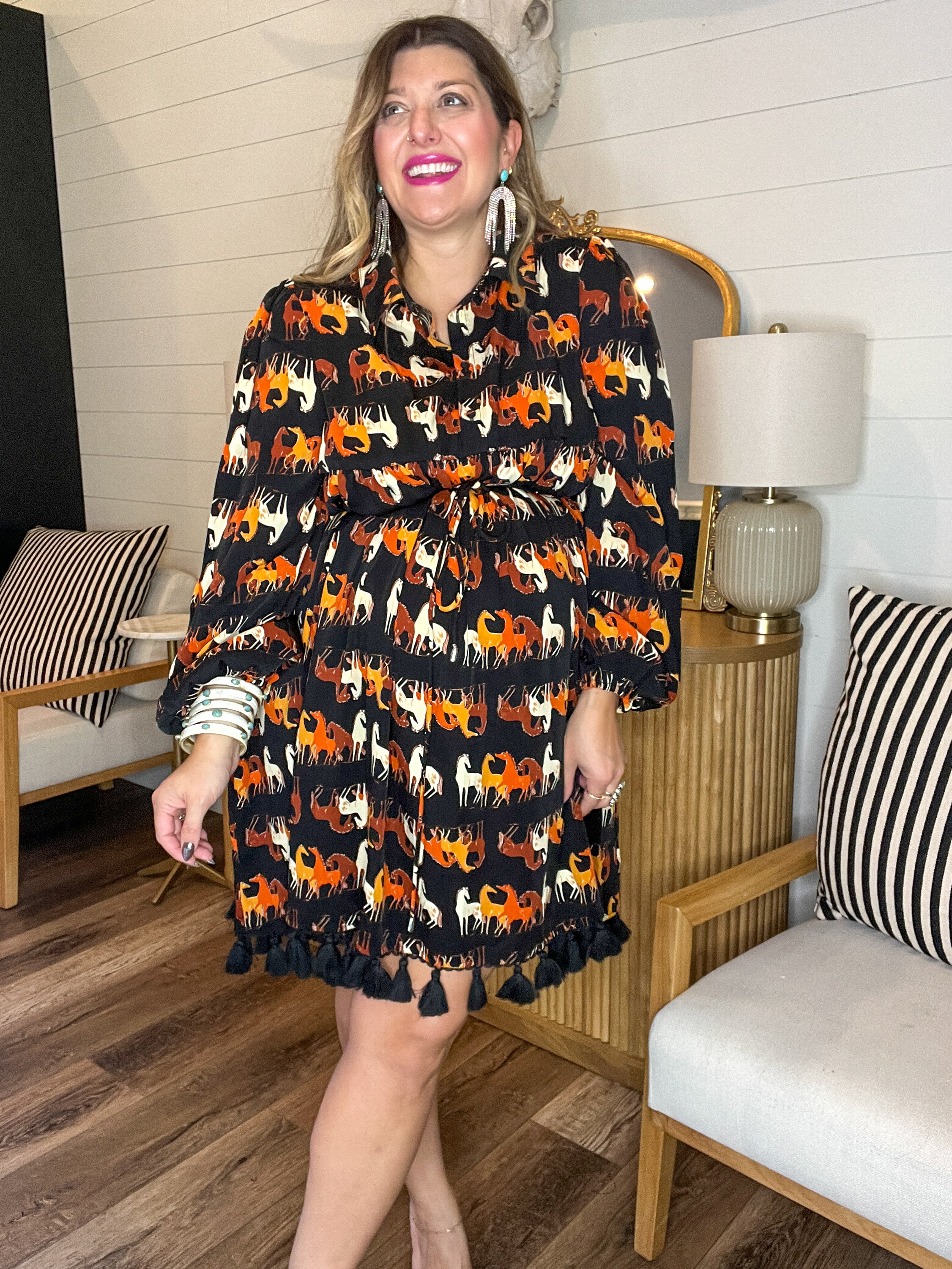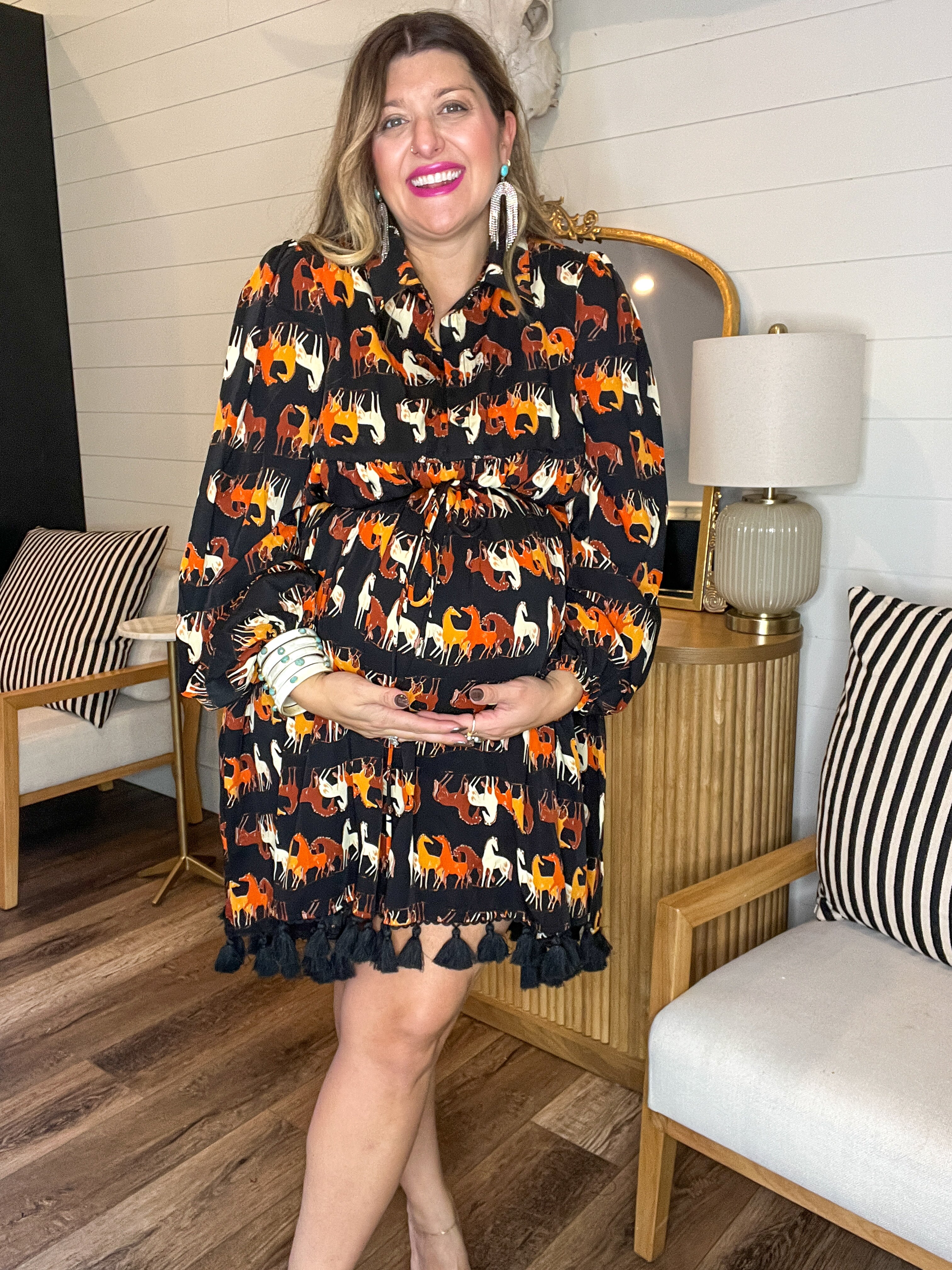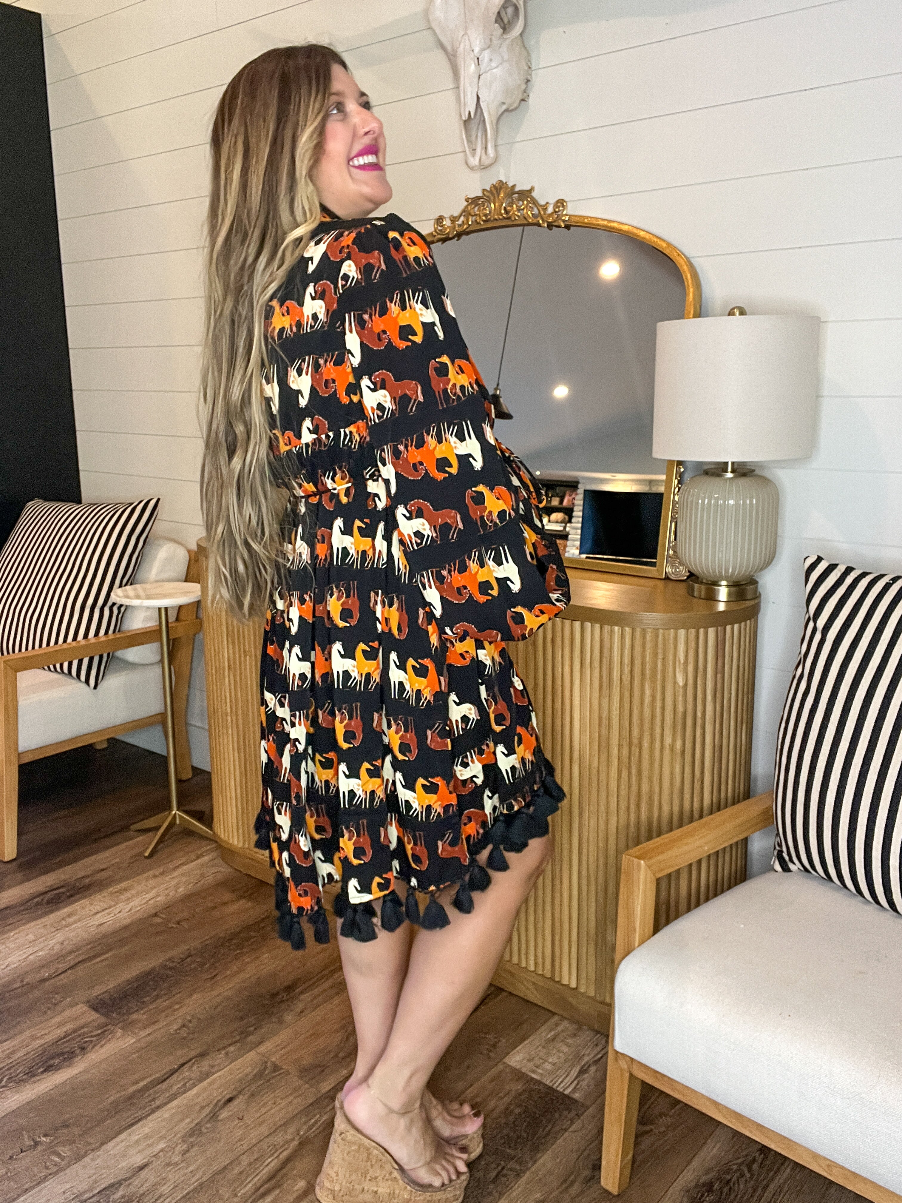 Wild hearts, saddle up—this playful western mini is giving rodeo queen meets high-fashion art teacher. Featuring an allover horse print in sunset tones and the most fun fringe hem, it’s flirty, free-spirited, and made for stealing the show. The puffed sleeves, cinched waist, and tiered skirt pull it all together like a good barrel run. Major main character energy.