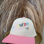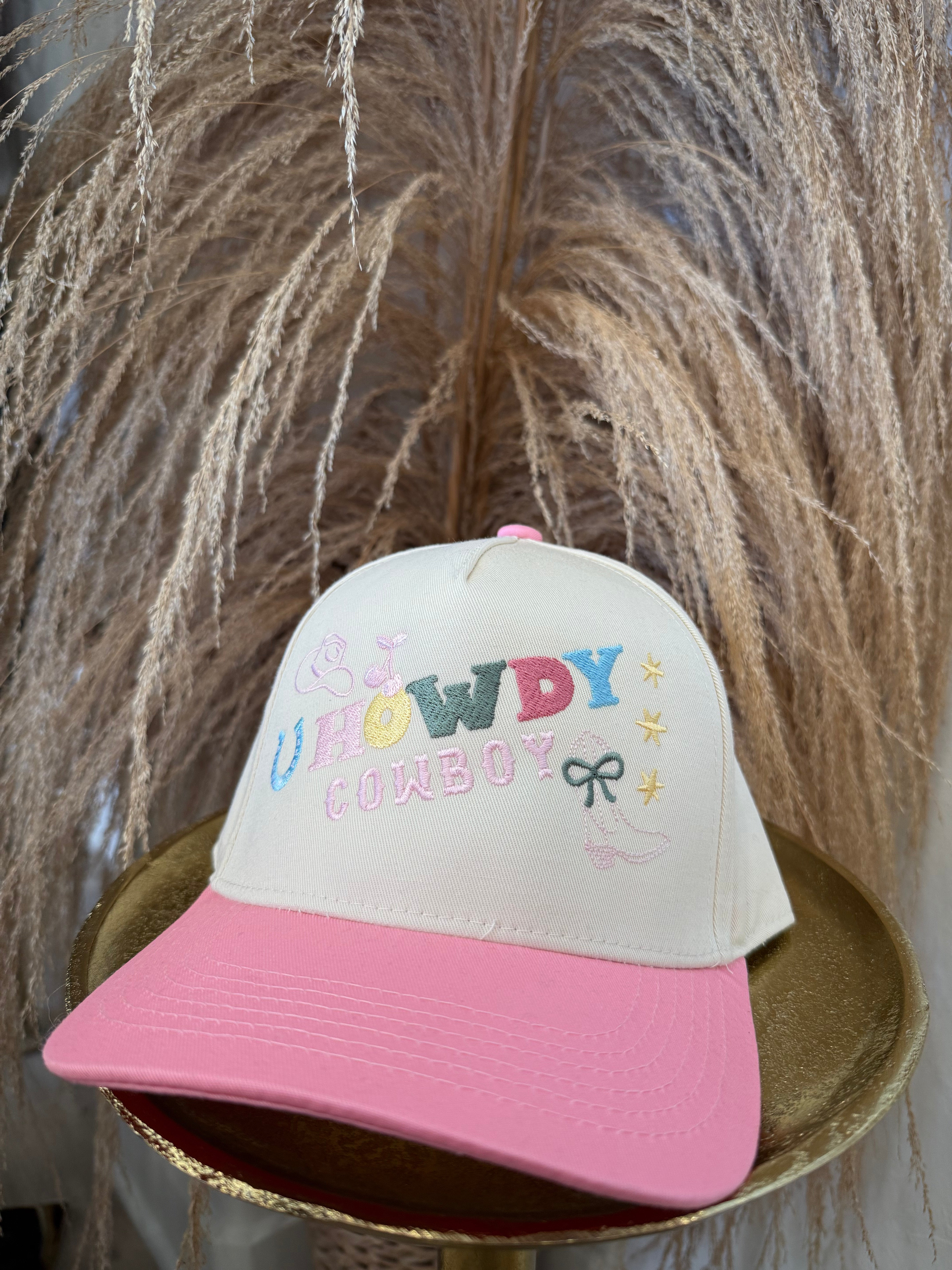 Cutest cowgirl in the county? That’s you. This pastel dream of a trucker hat is embroidered with a playful “Howdy Cowboy” graphic in the happiest mix of colors and icons—boots, stars, bows, and even a little lasso moment. It’s giving rodeo Barbie meets Y2K cutie, and we’re here for every second of it.