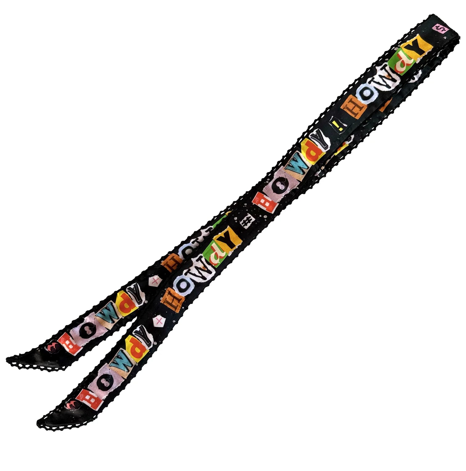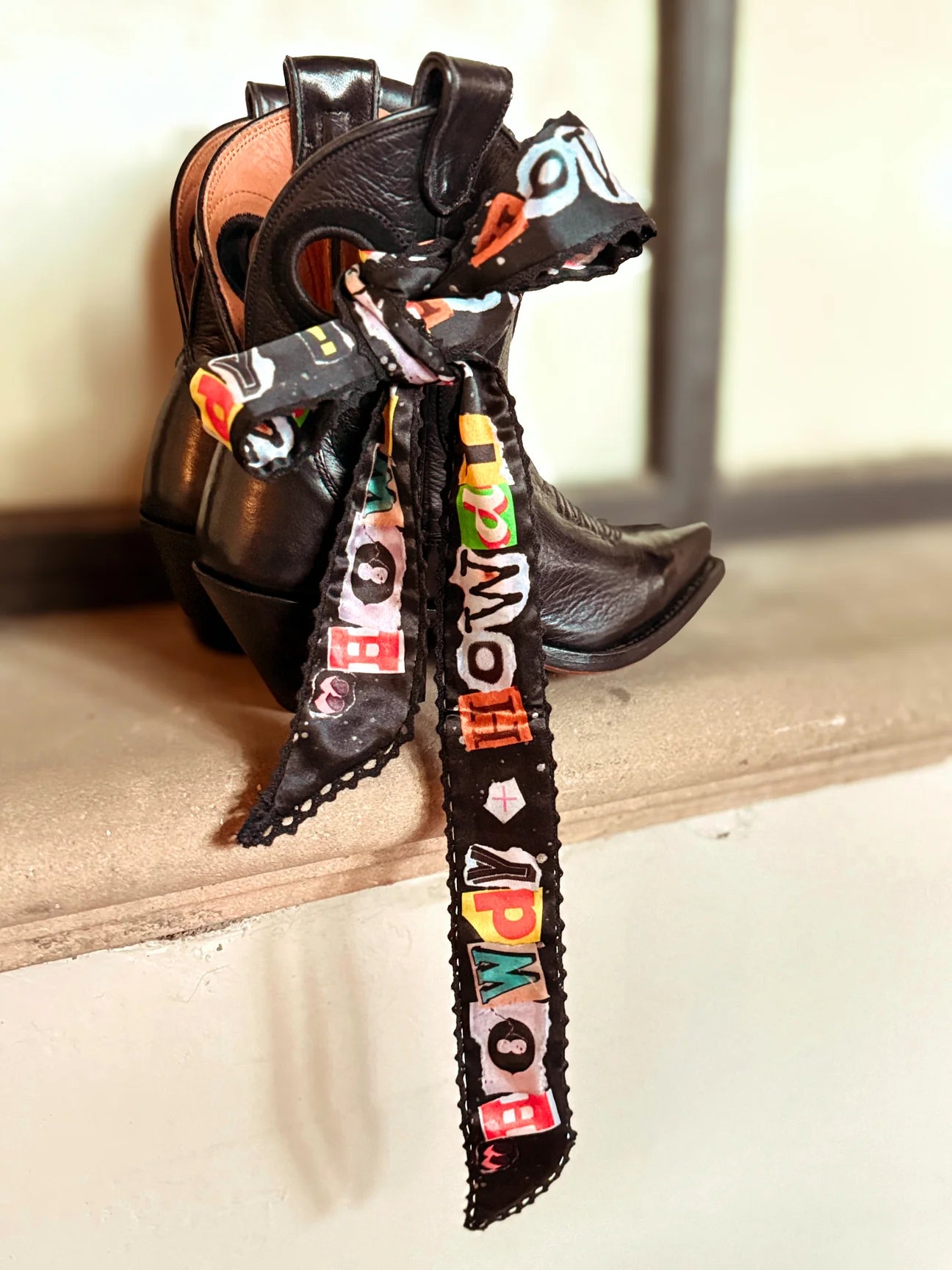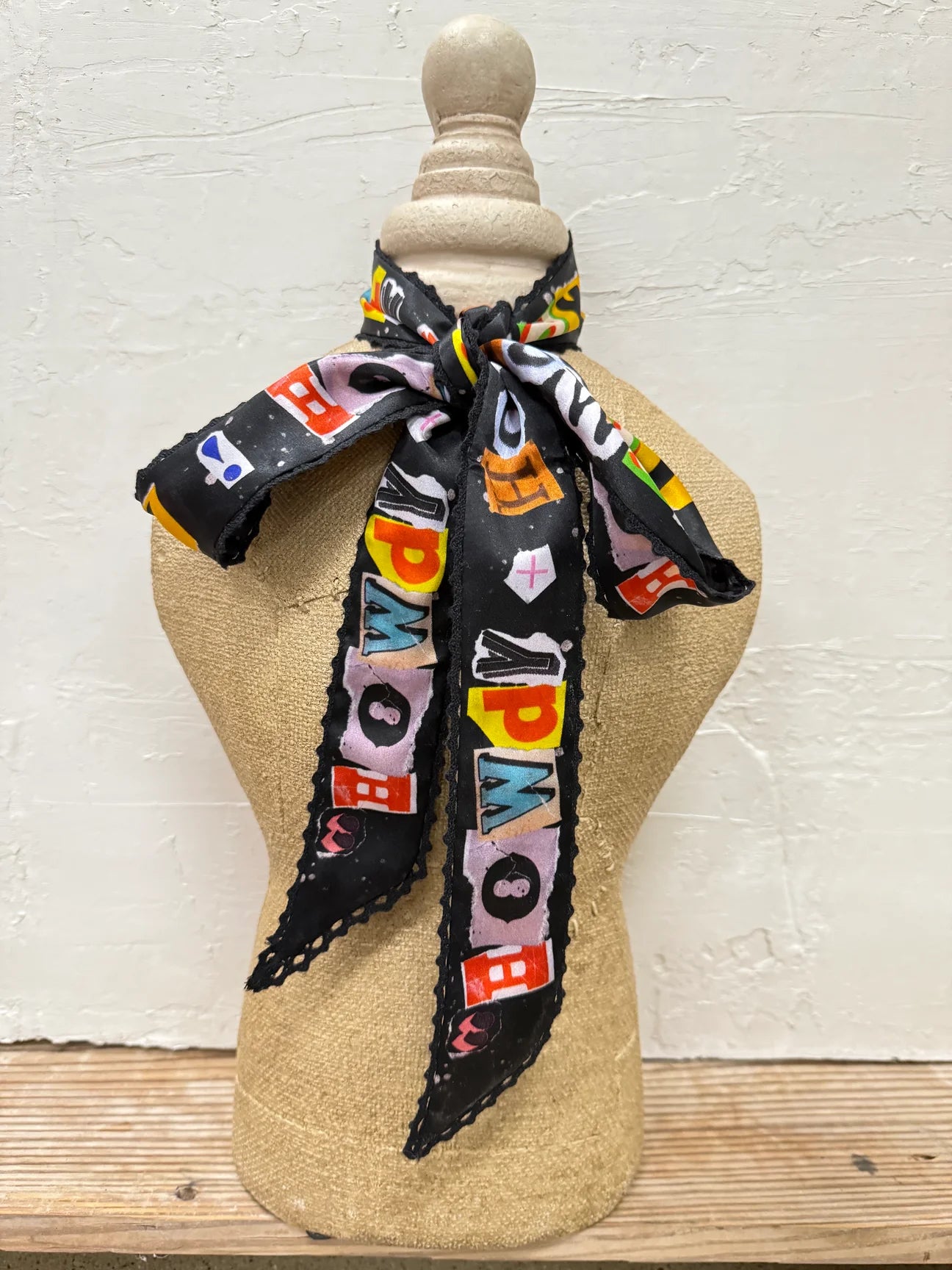 Hand drawn art on a beautiful silk twilly with a crochet trimmed edge.