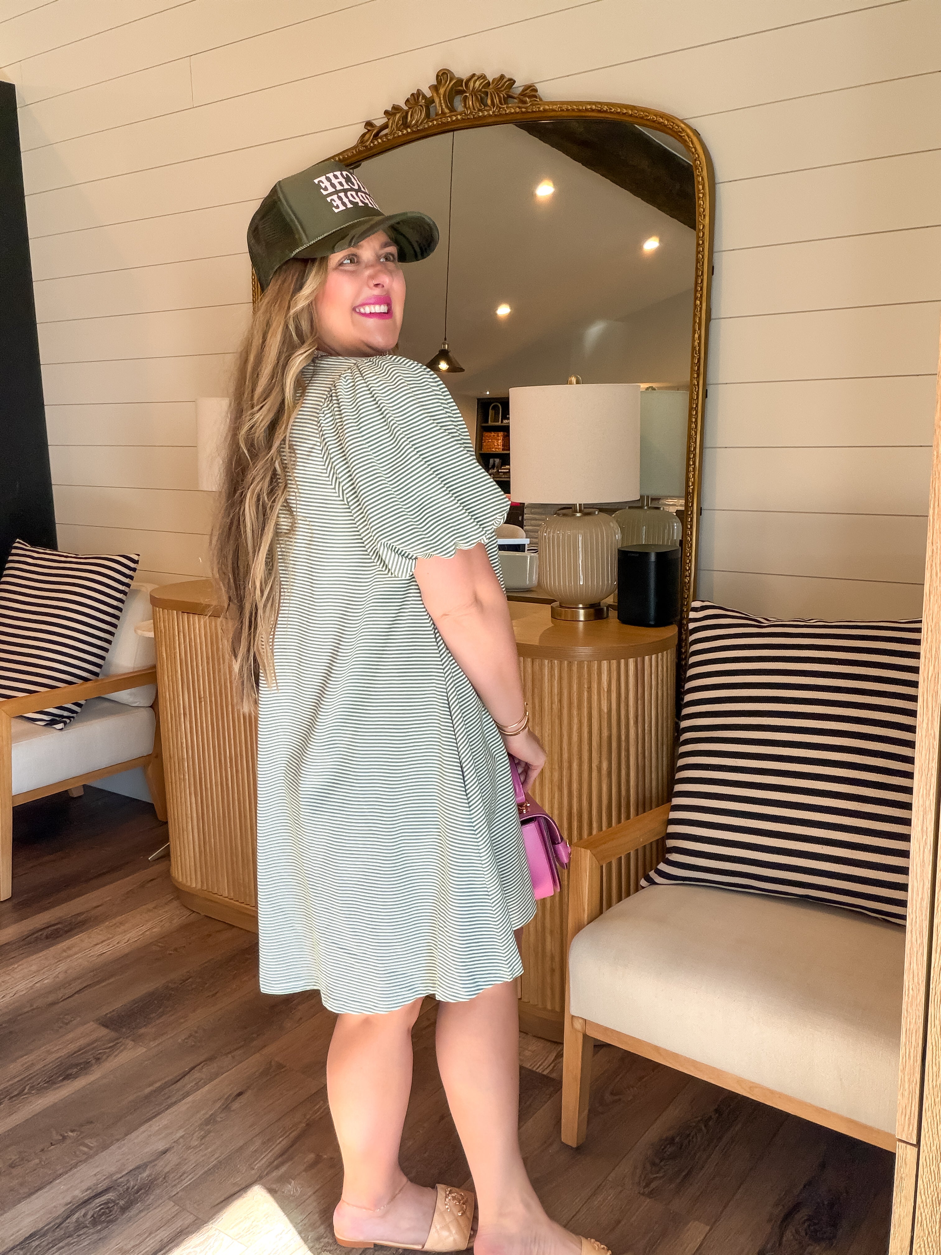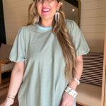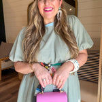 The Hudson Bay Stripe Dress in Sky + Pistachio features a striped puff sleeve design, enhancing both style and comfort. This knit mini dress is equipped with side pockets for functionality and is fully lined, ensuring a flattering fit. A blend of practicality and fashion because who doesn’t love that??!!