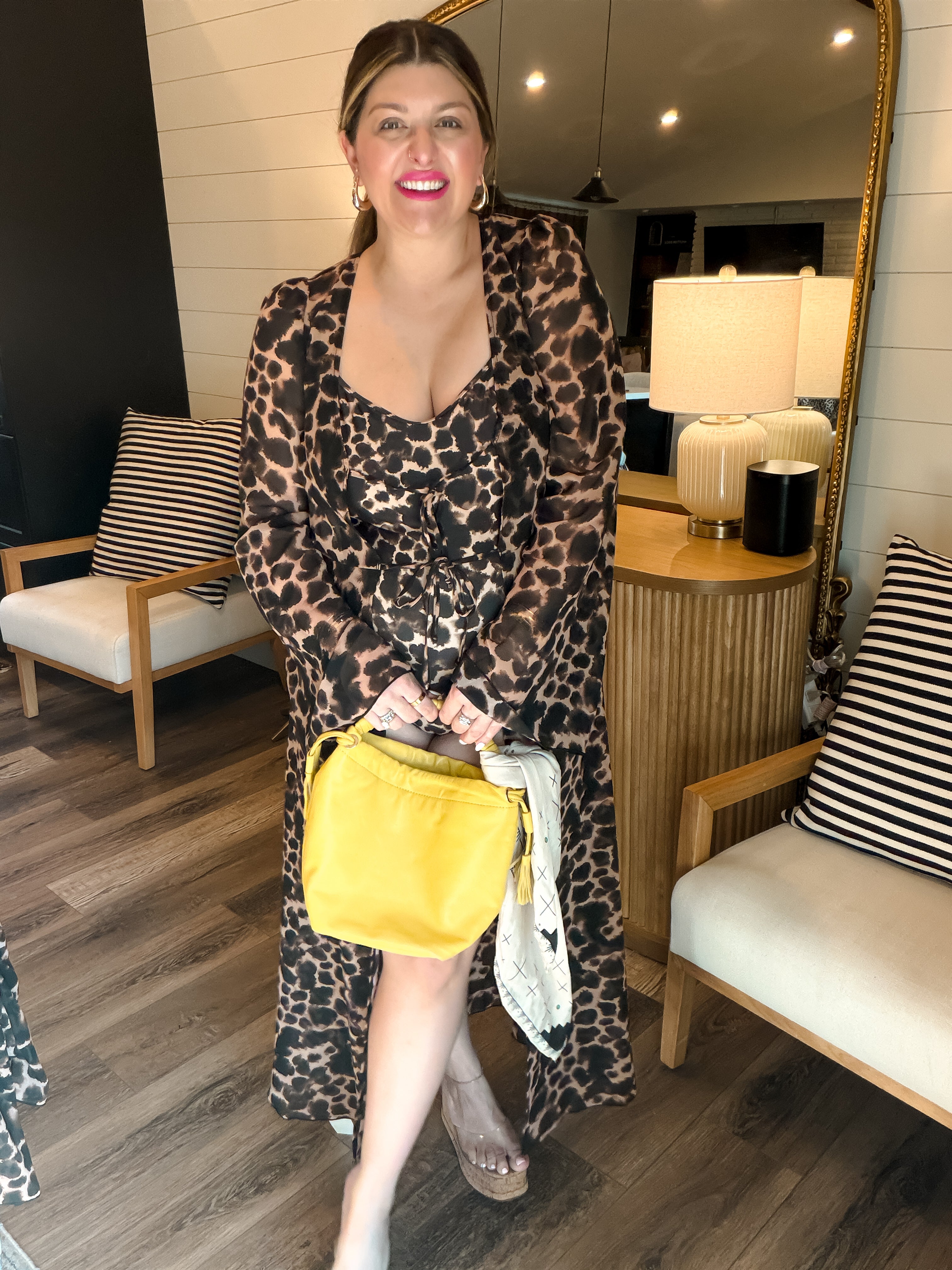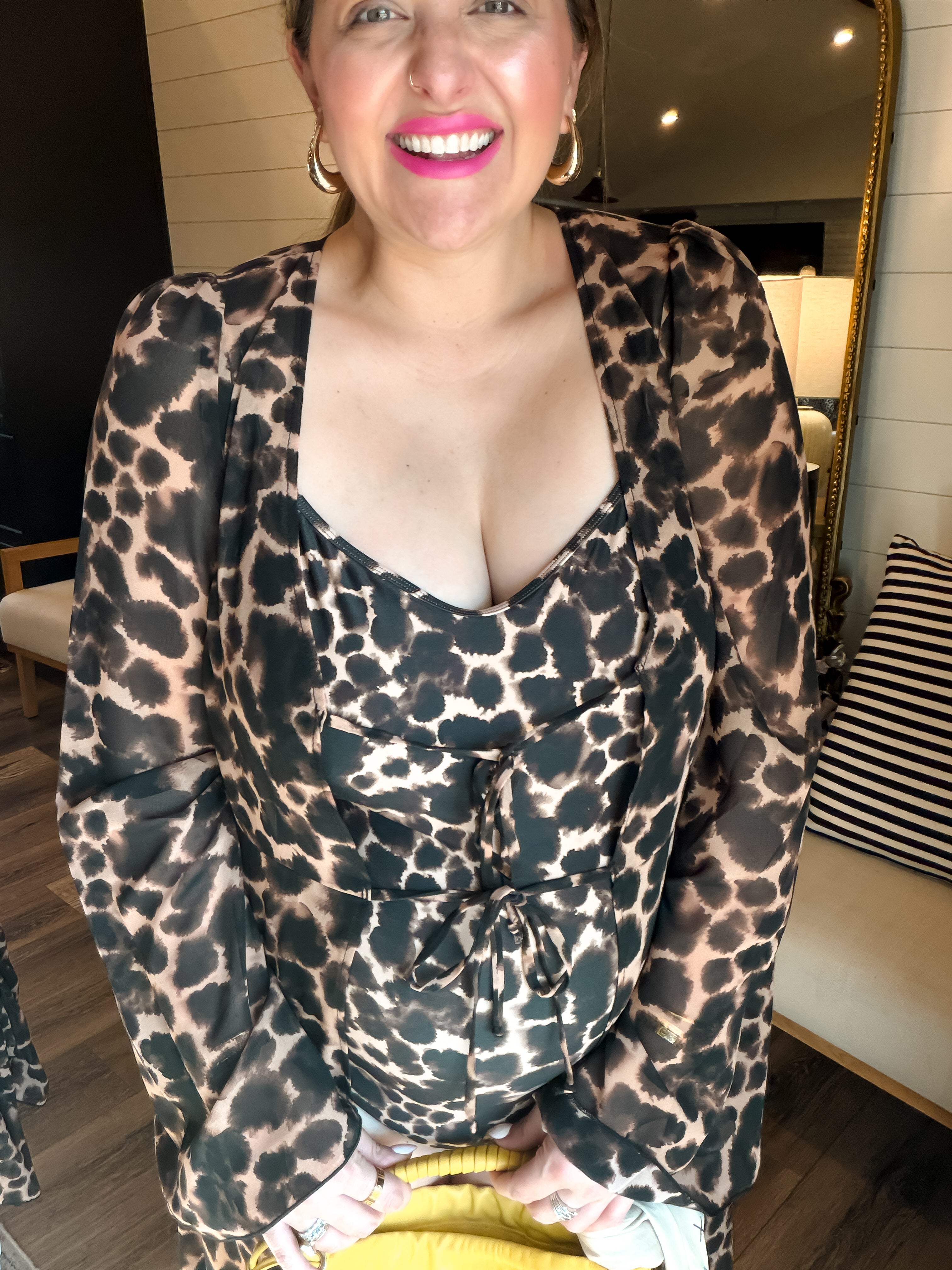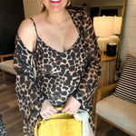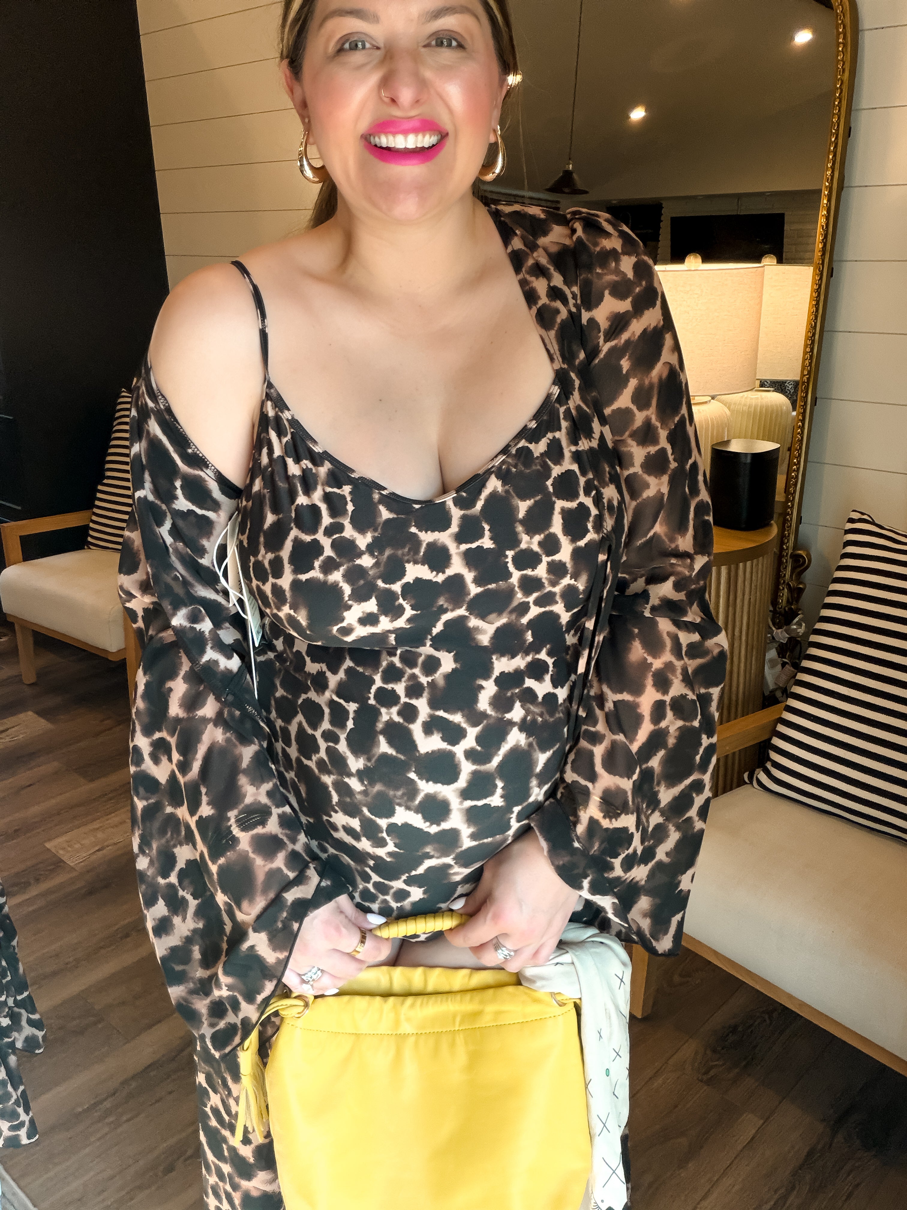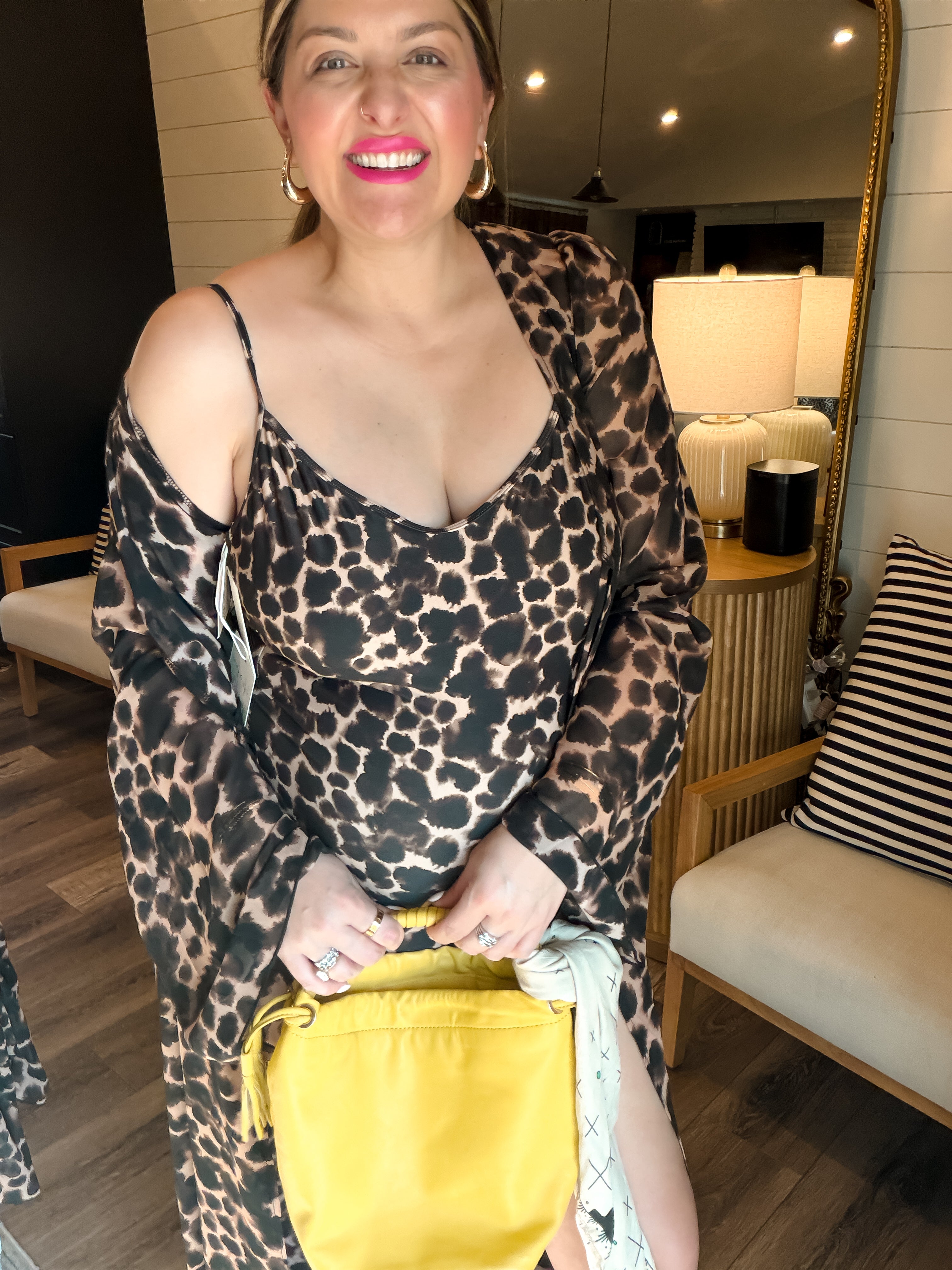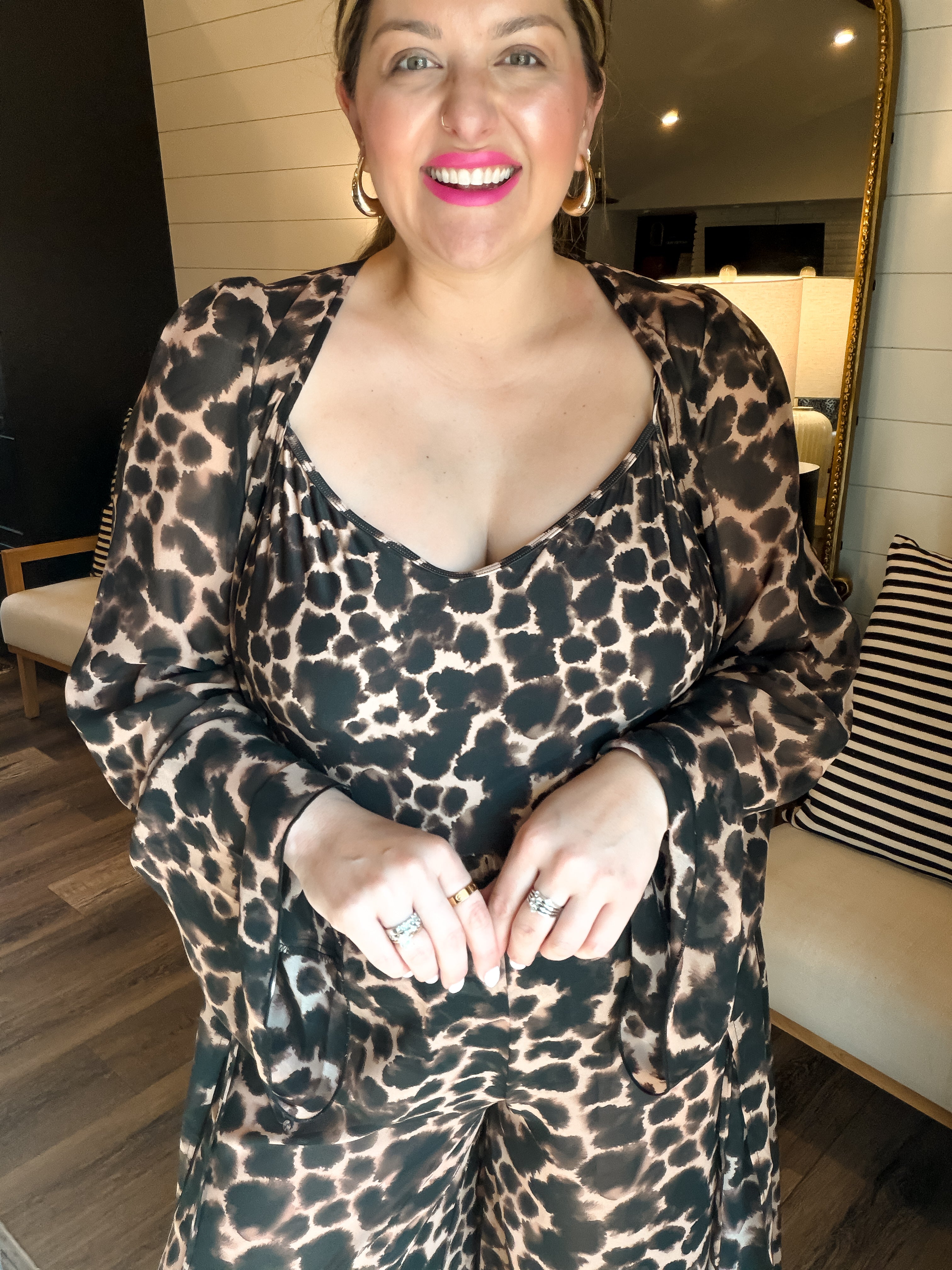 The Jet Setter Robe is here to get the vacation vibes started! This lightweight robe is decorated in a tortoise shell print with a flirty open front, and adjustable ties that cinch at the bust. Long, kimono sleeves adds a breezy and stylish touch to this maxi silhouette.