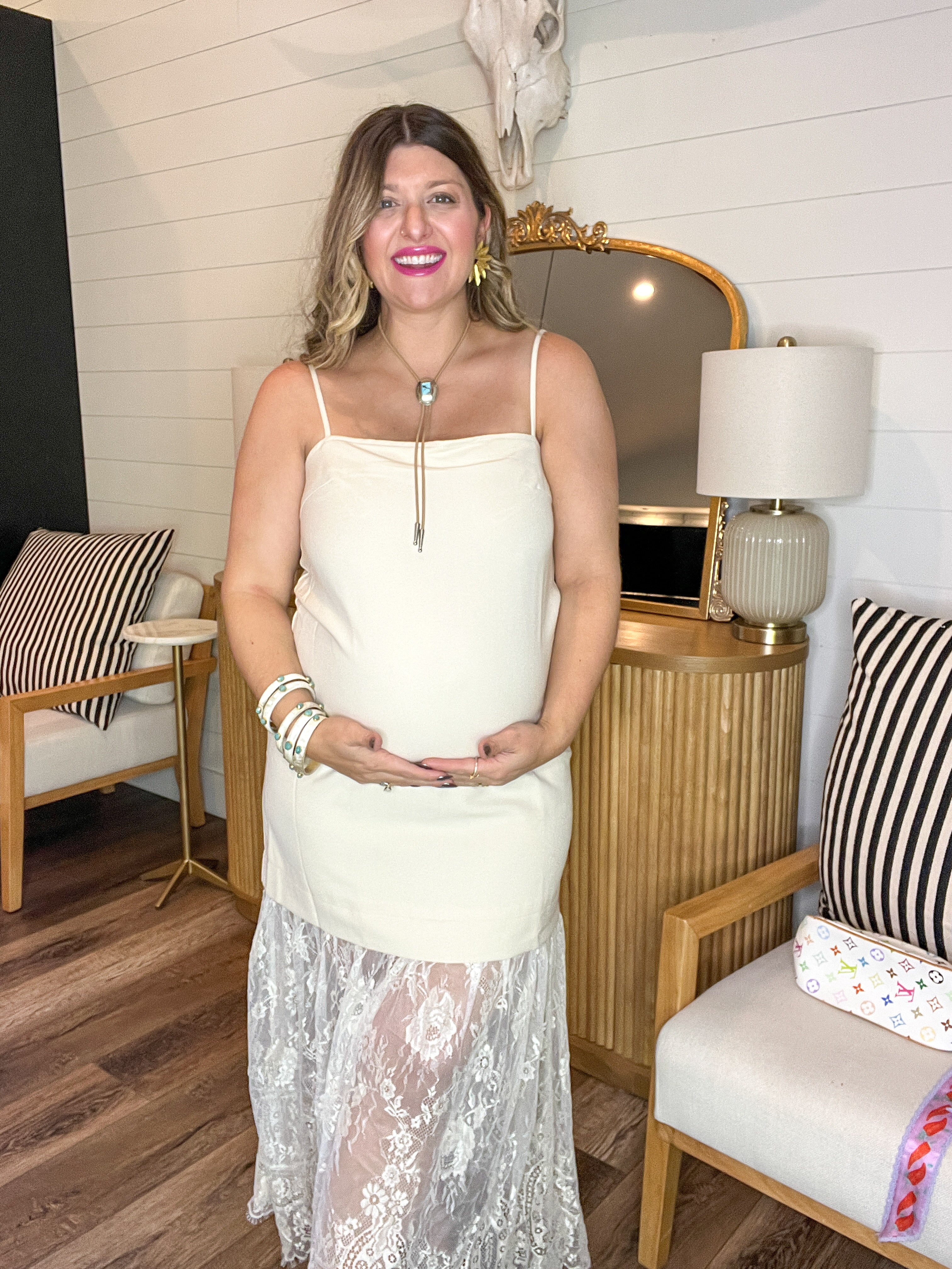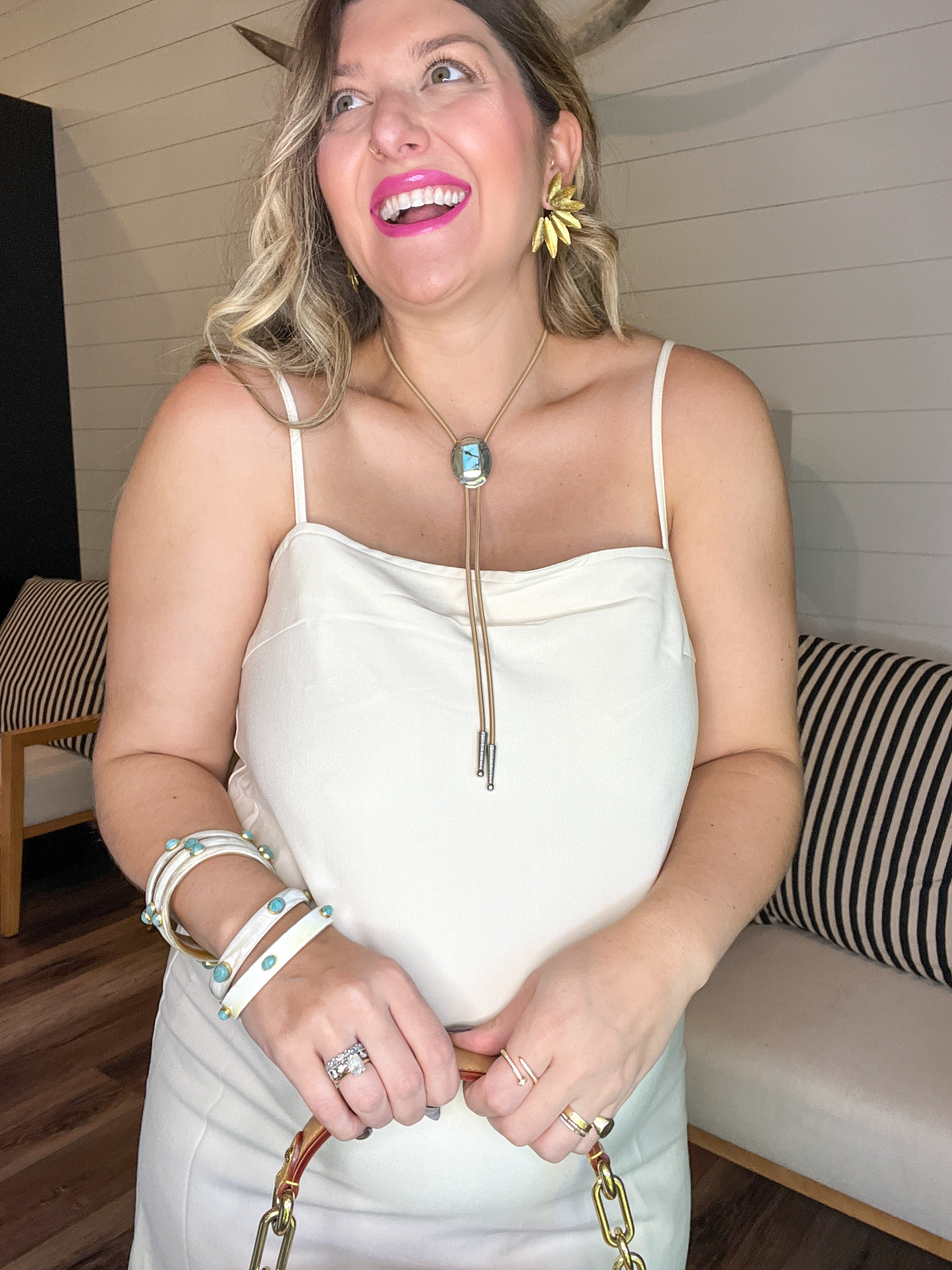 We love this for bridal events, spring soirees, or a moonlit dinner with a little shimmer. Pair it with layered pearls or turquoise (or both), + finish with soft waves or a sleek low bun.