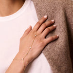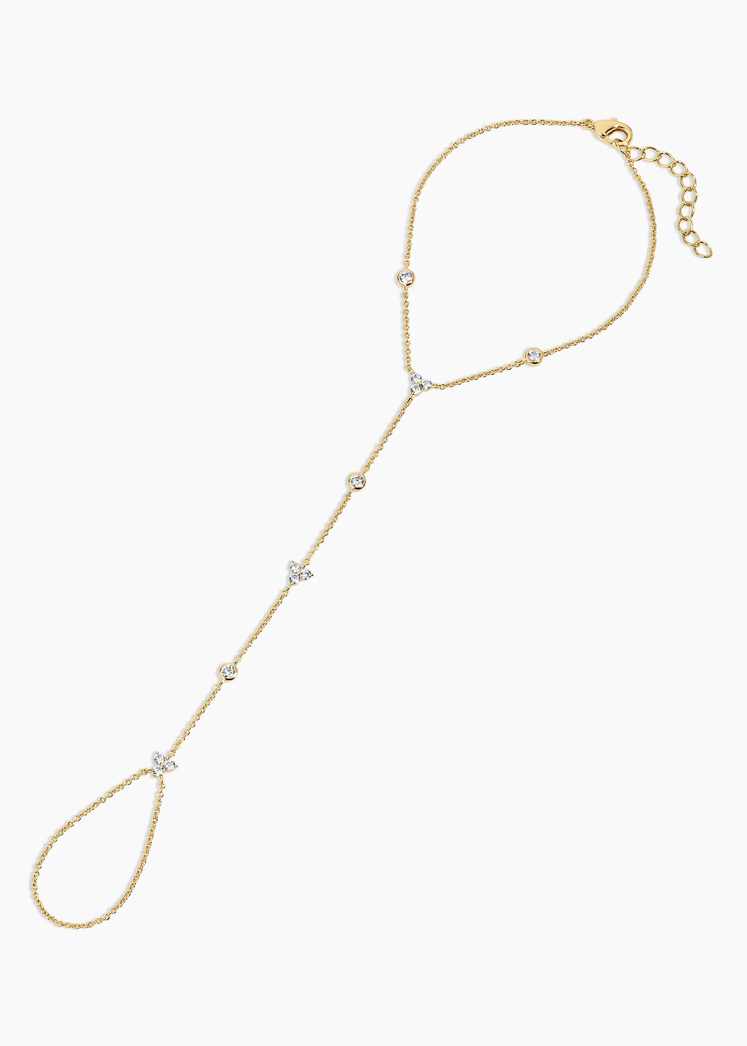 Simple yet striking, this delicate hand chain is all about effortless elegance. Add a little edge to your everyday outfit or add it to your evening look for a finishing touch.
