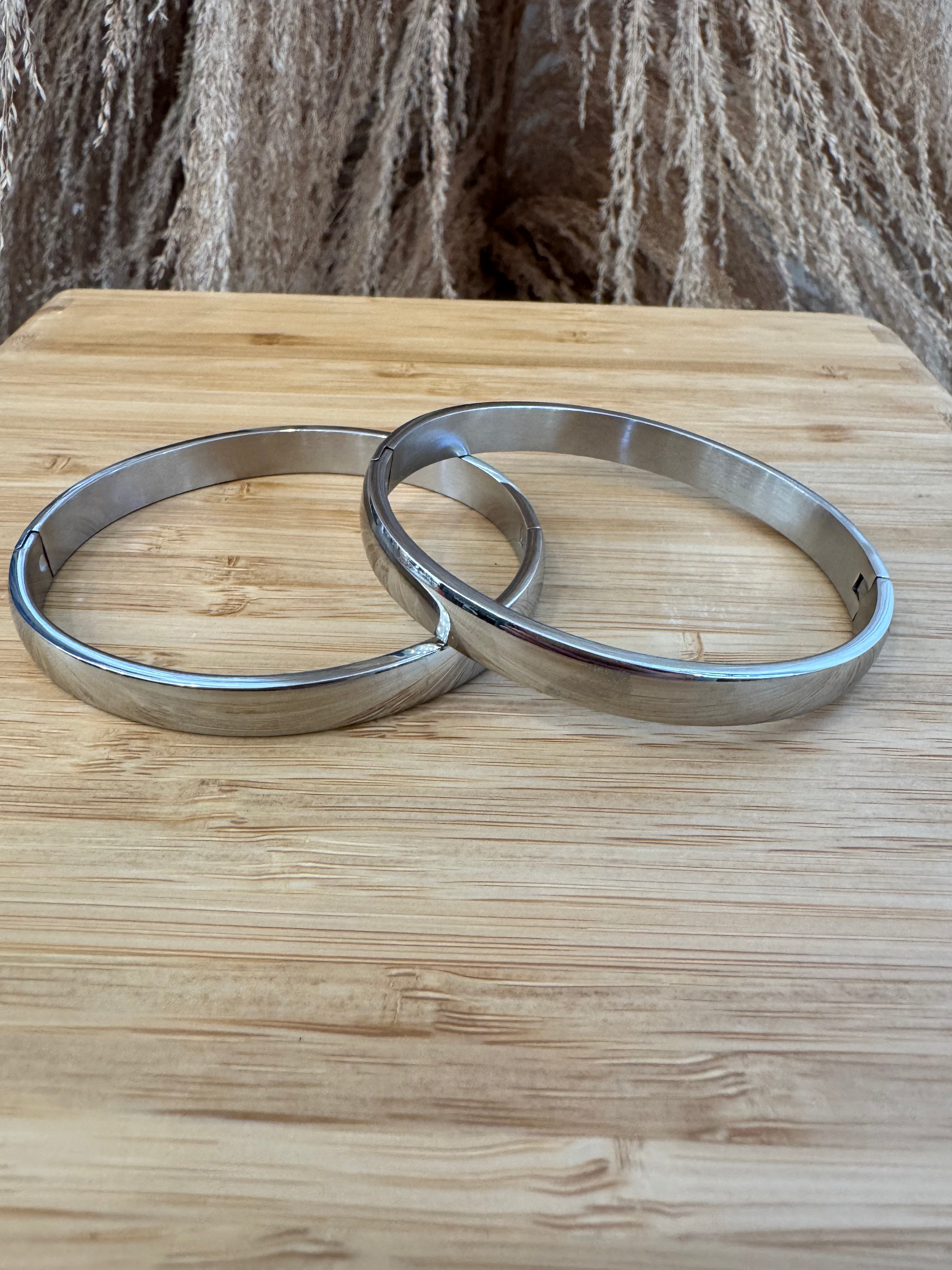 Stainless steel. Get the luxury look bangles with this unique style. Opens with a hinge style and magnetically closes.