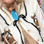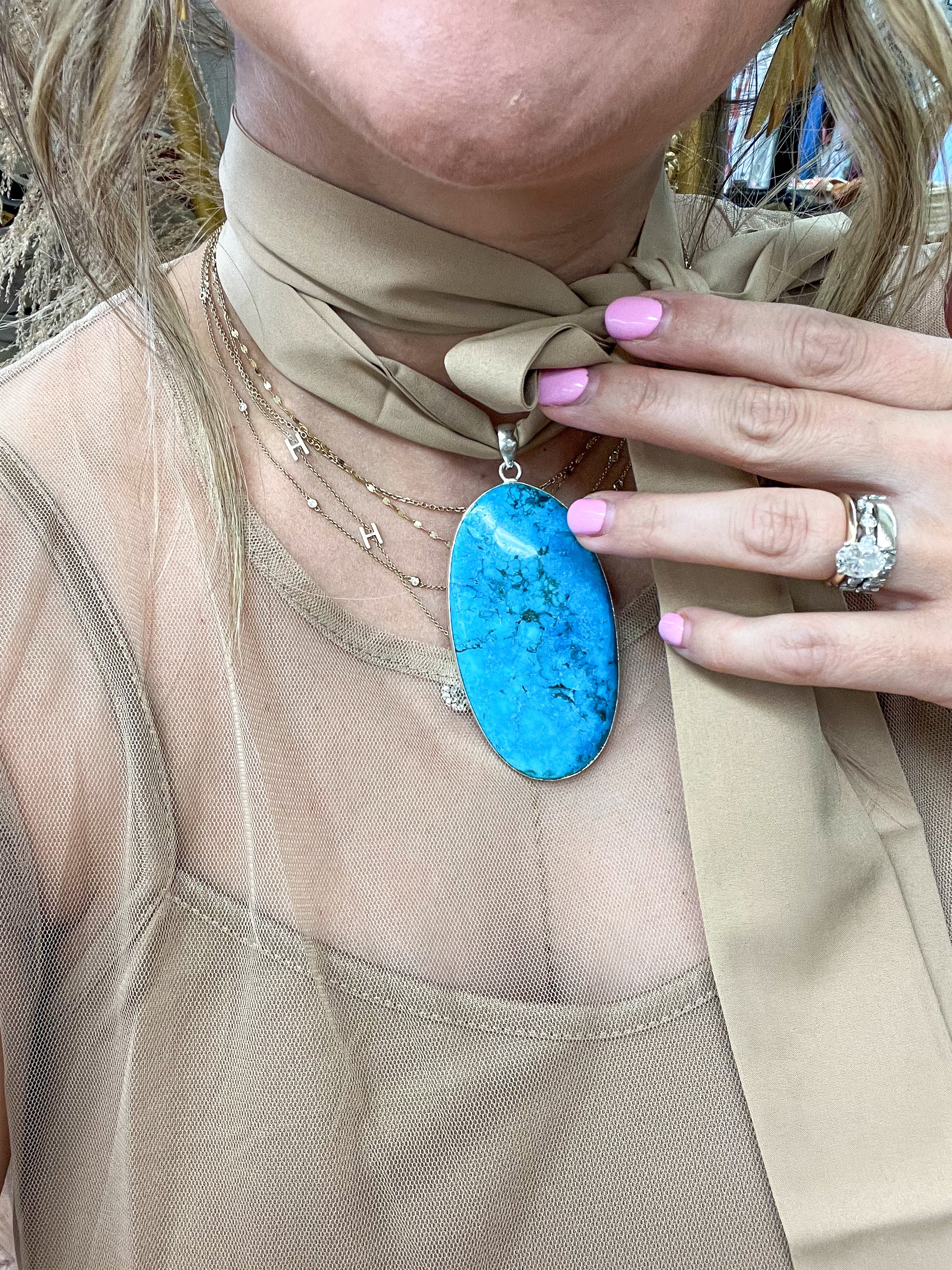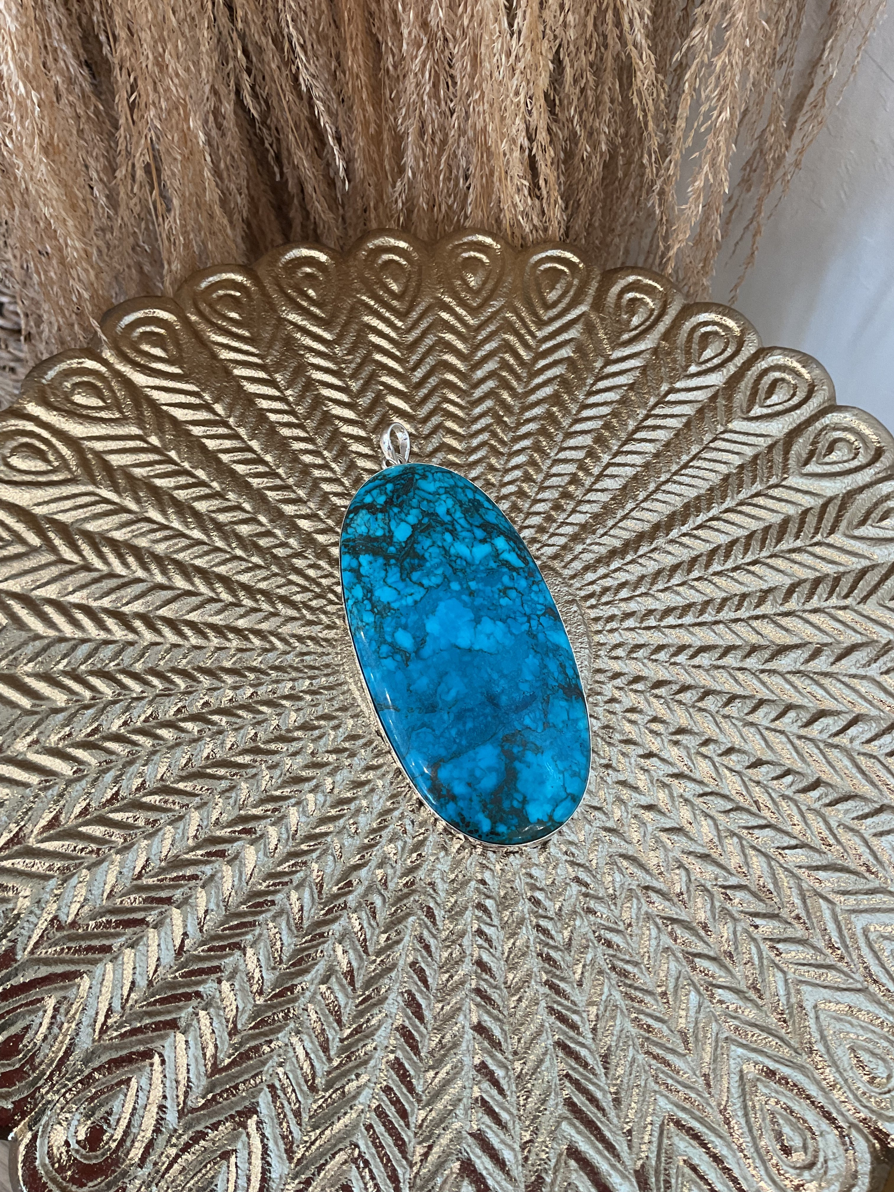 Bold, bright, and unapologetically Western, this turquoise pendant is made for main character moments. The rich teal-blue stone swirled with black matrix looks like it was plucked straight from canyon walls—and it’s ready to ride shotgun on every outfit. She’s not subtle, and that’s exactly the point.