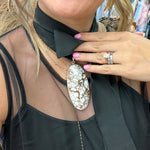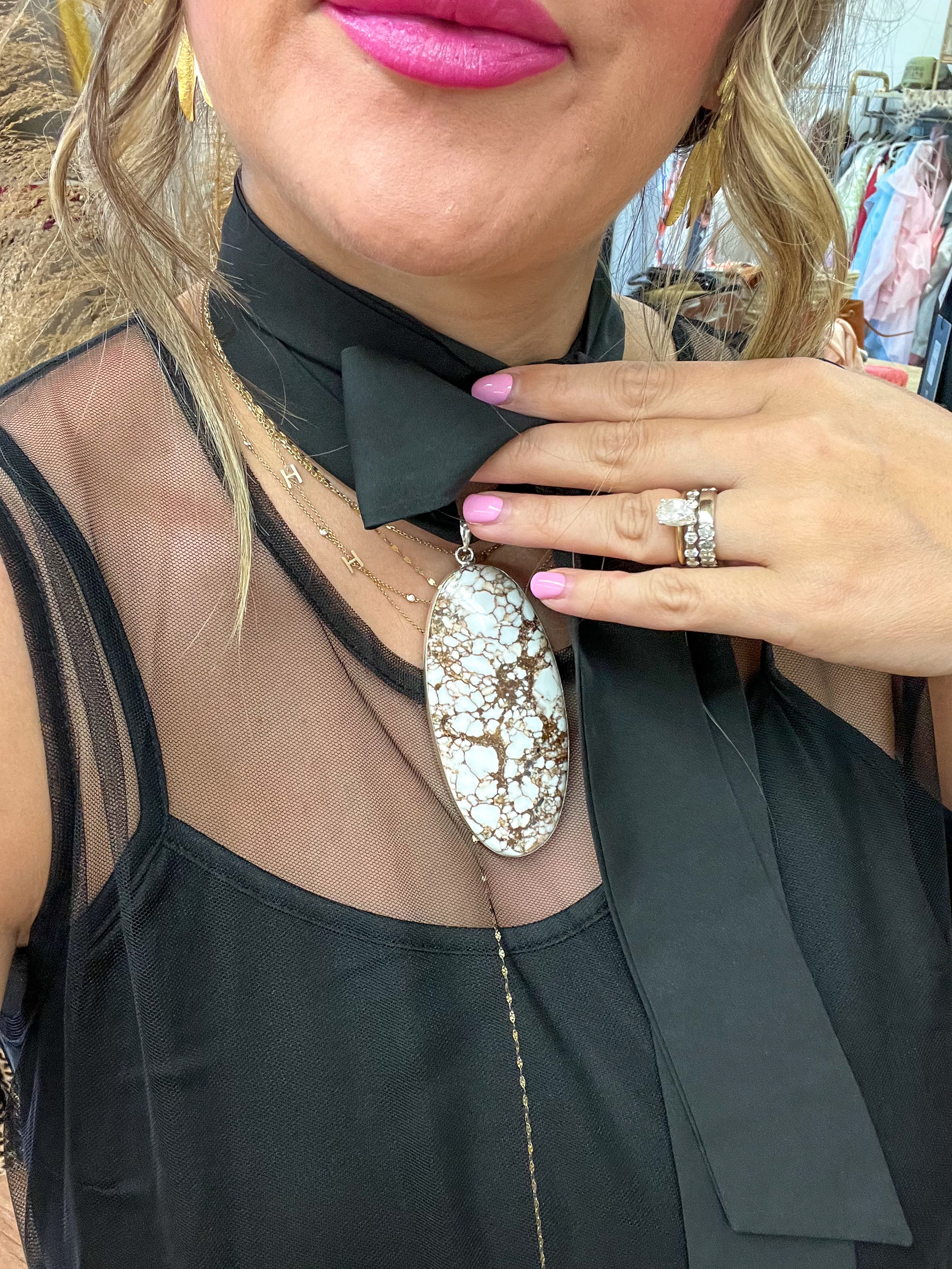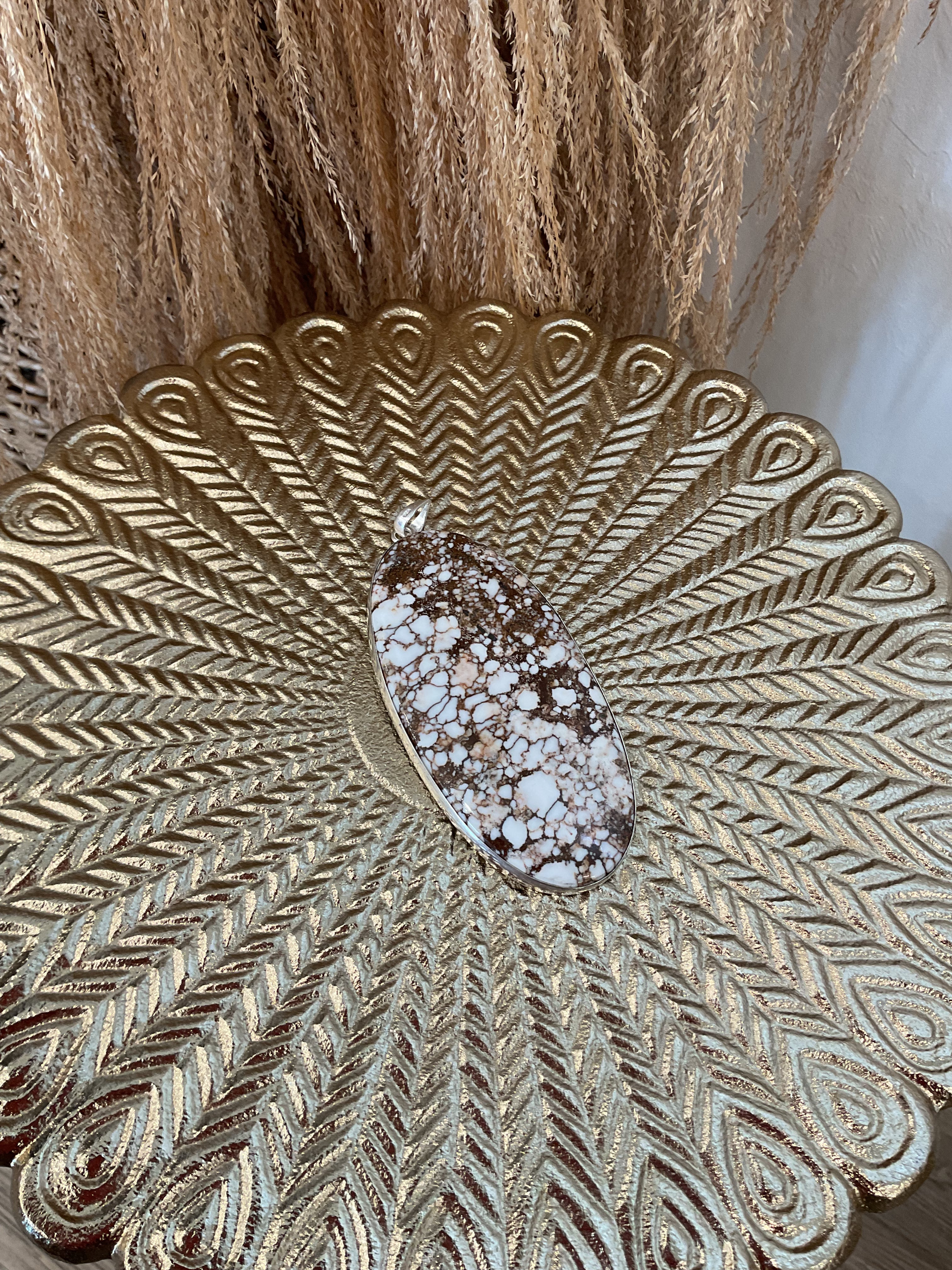 This one’s for the wild hearts and grounded souls. With its marbled white-and-brown veining and smooth, polished finish, this pendant gives major desert rose vibes—rooted, radiant, and one-of-a-kind. It’s bold without being flashy, natural without being plain. A statement piece with stories to tell.
