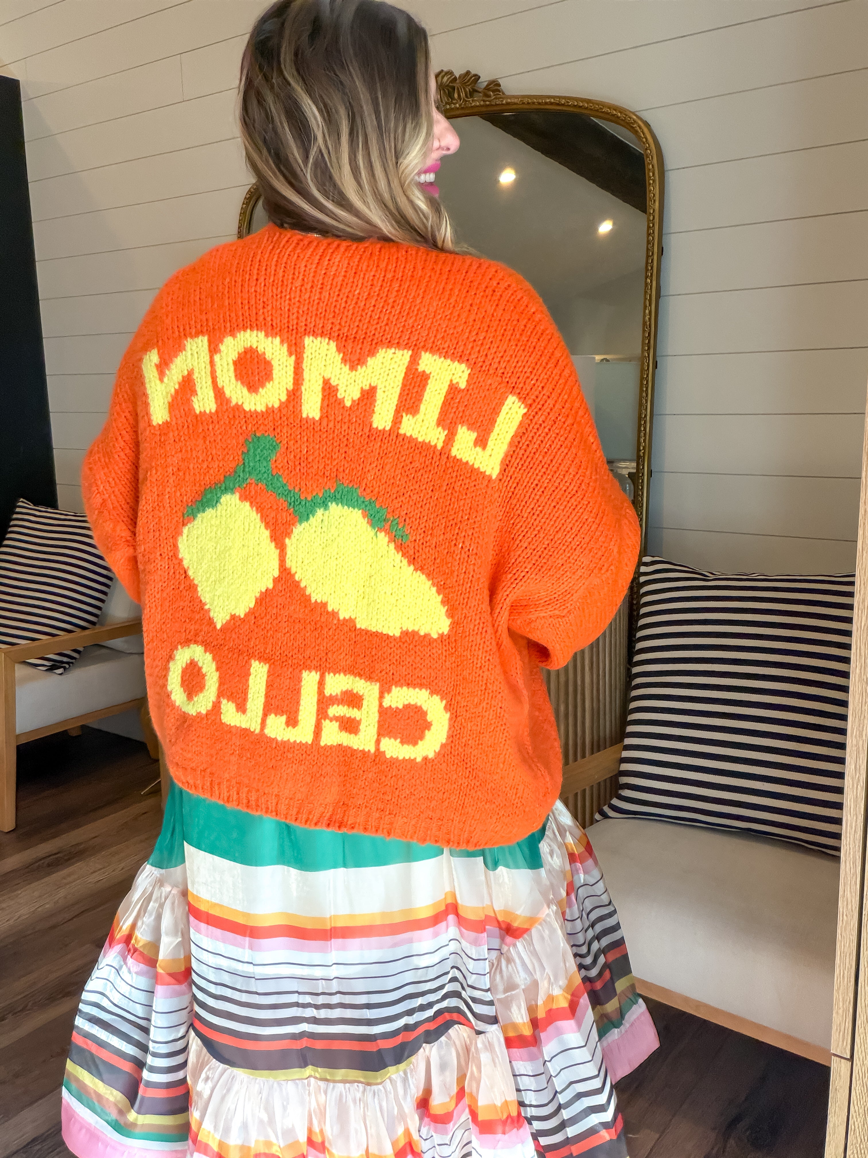 The Lemon Limon Cardigan in orange is a handmade knit sweater featuring a distinctive "Limon" graphic on the back and a lemon graphic on the front chest. This cardigan combines chic aesthetics with comfort, making it a versatile choice for various occasions. Crafted in Italy, it offers a unique blend of style and warmth.
