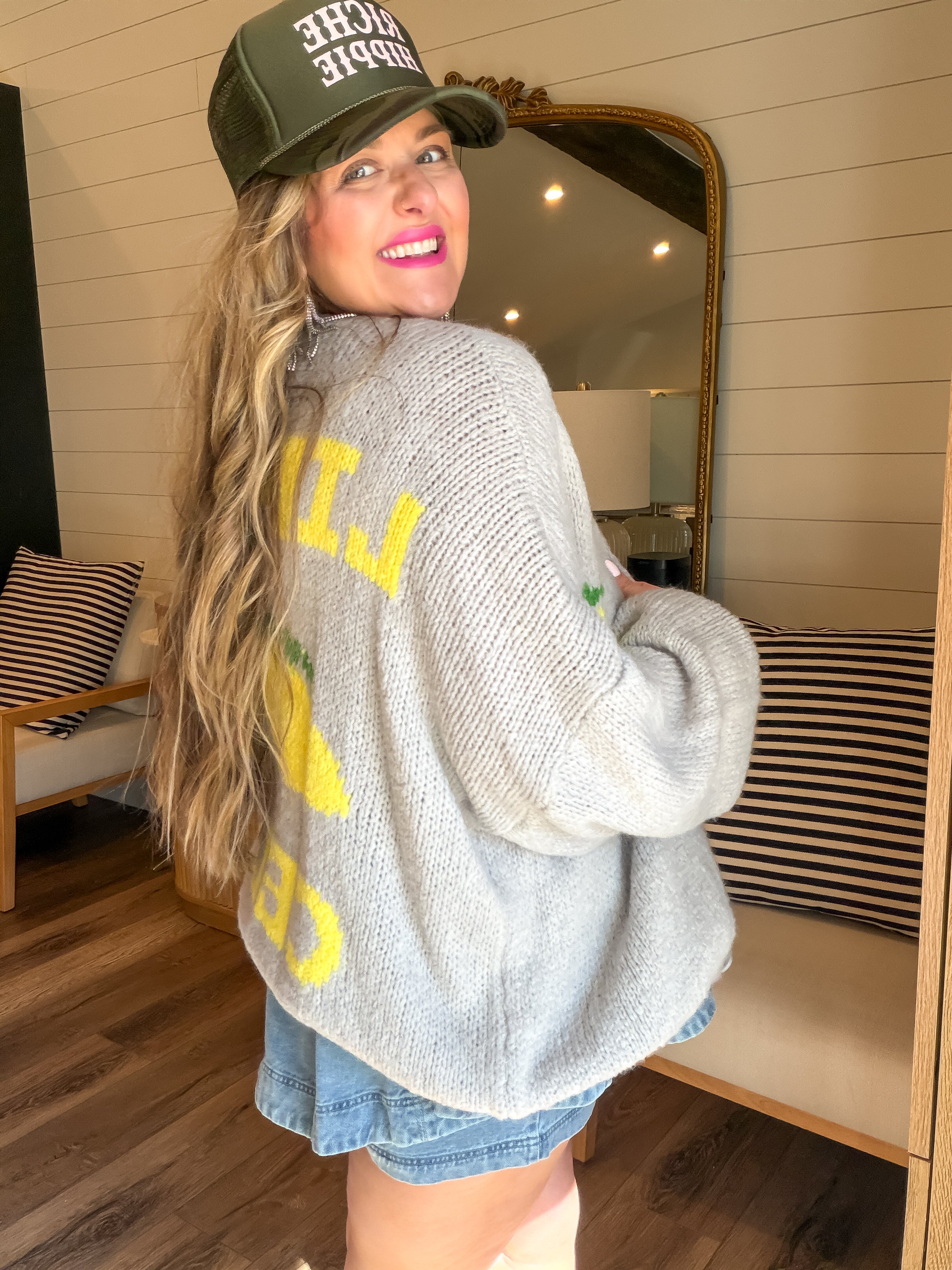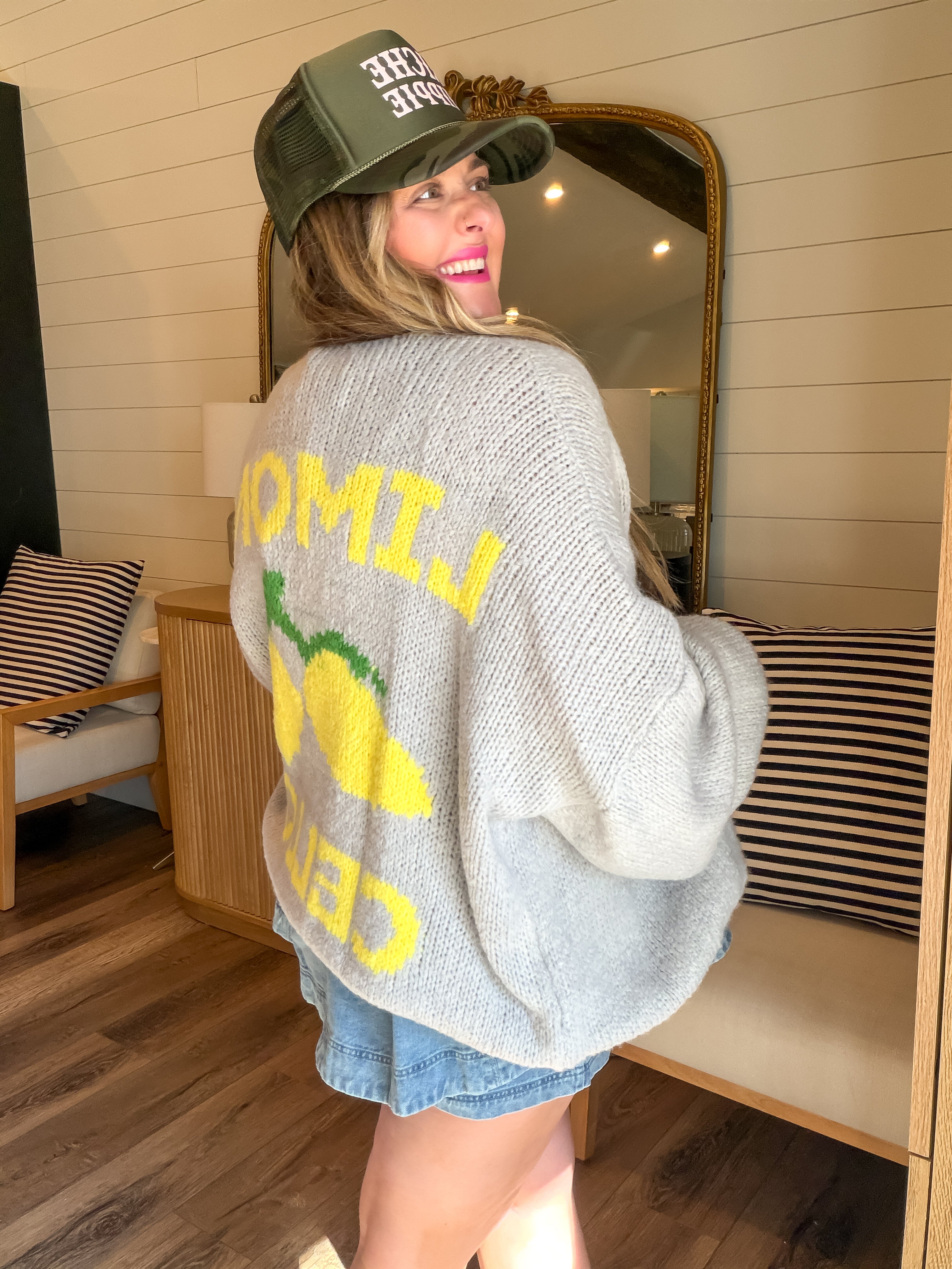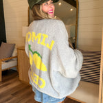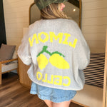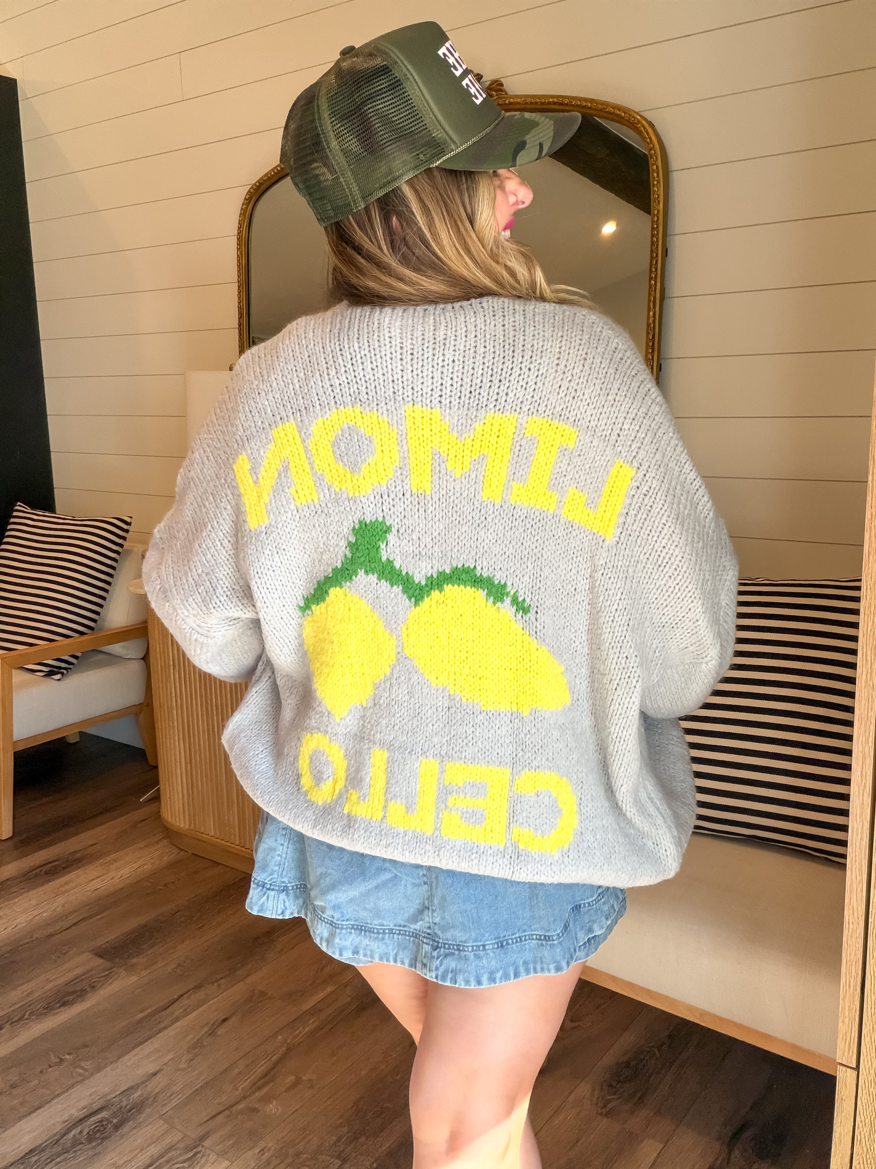 The Lemon Limon Cardigan in yellow is a handmade knit sweater featuring a distinctive "Limon" graphic on the back and a lemon graphic on the front chest. This cardigan combines chic aesthetics with comfort, making it a versatile choice for various occasions. Crafted in Italy, it offers a unique blend of style and warmth.