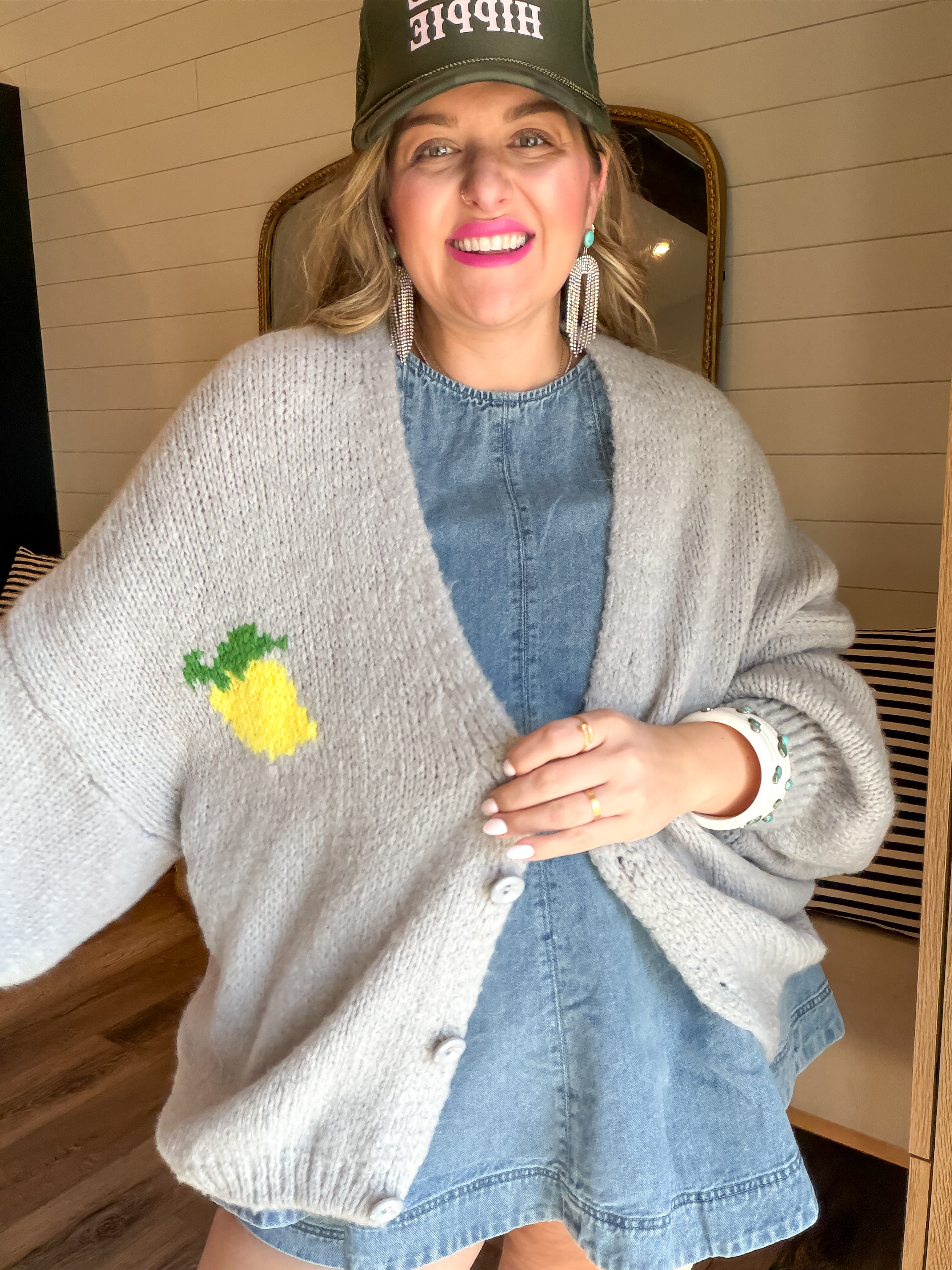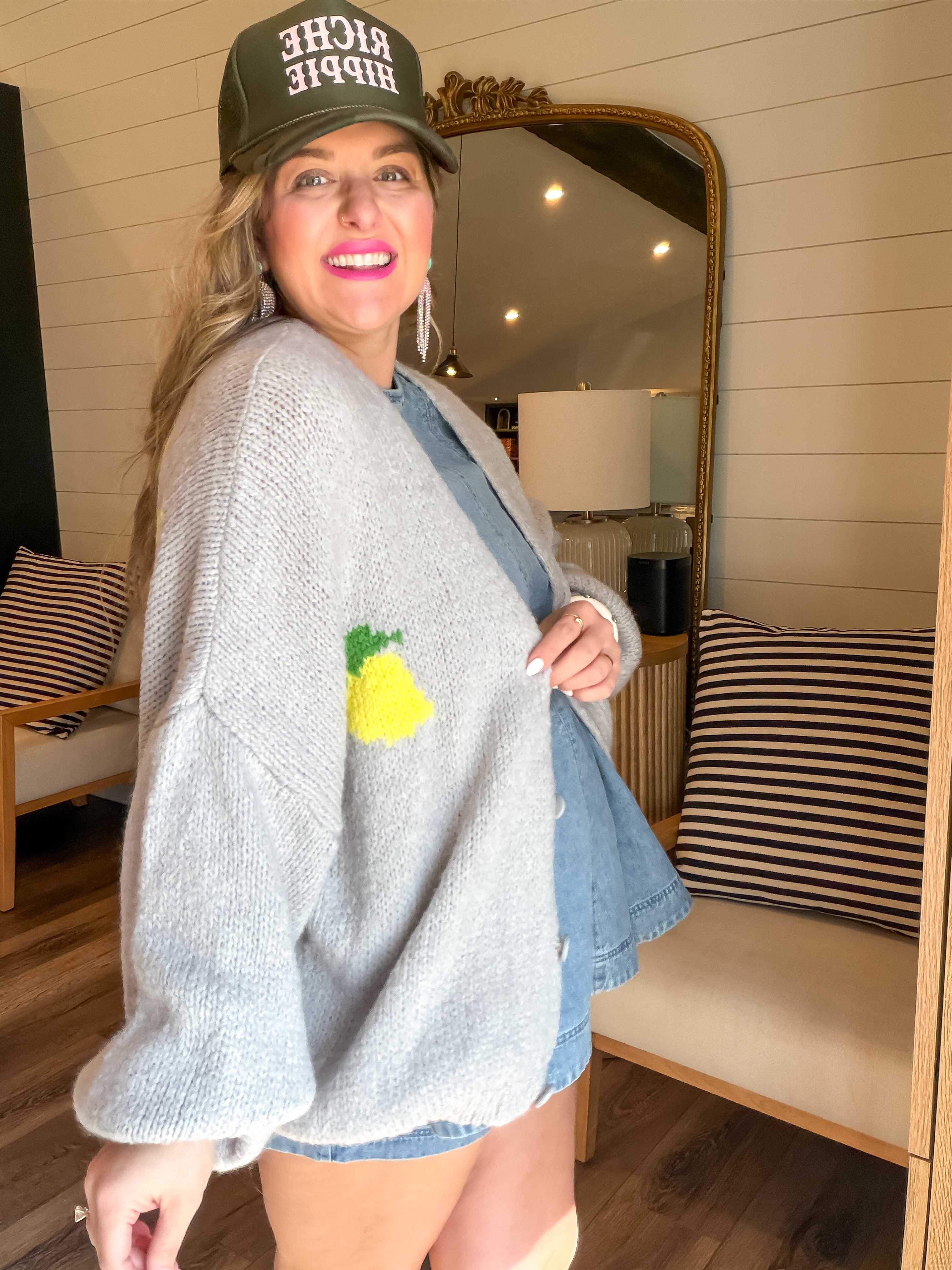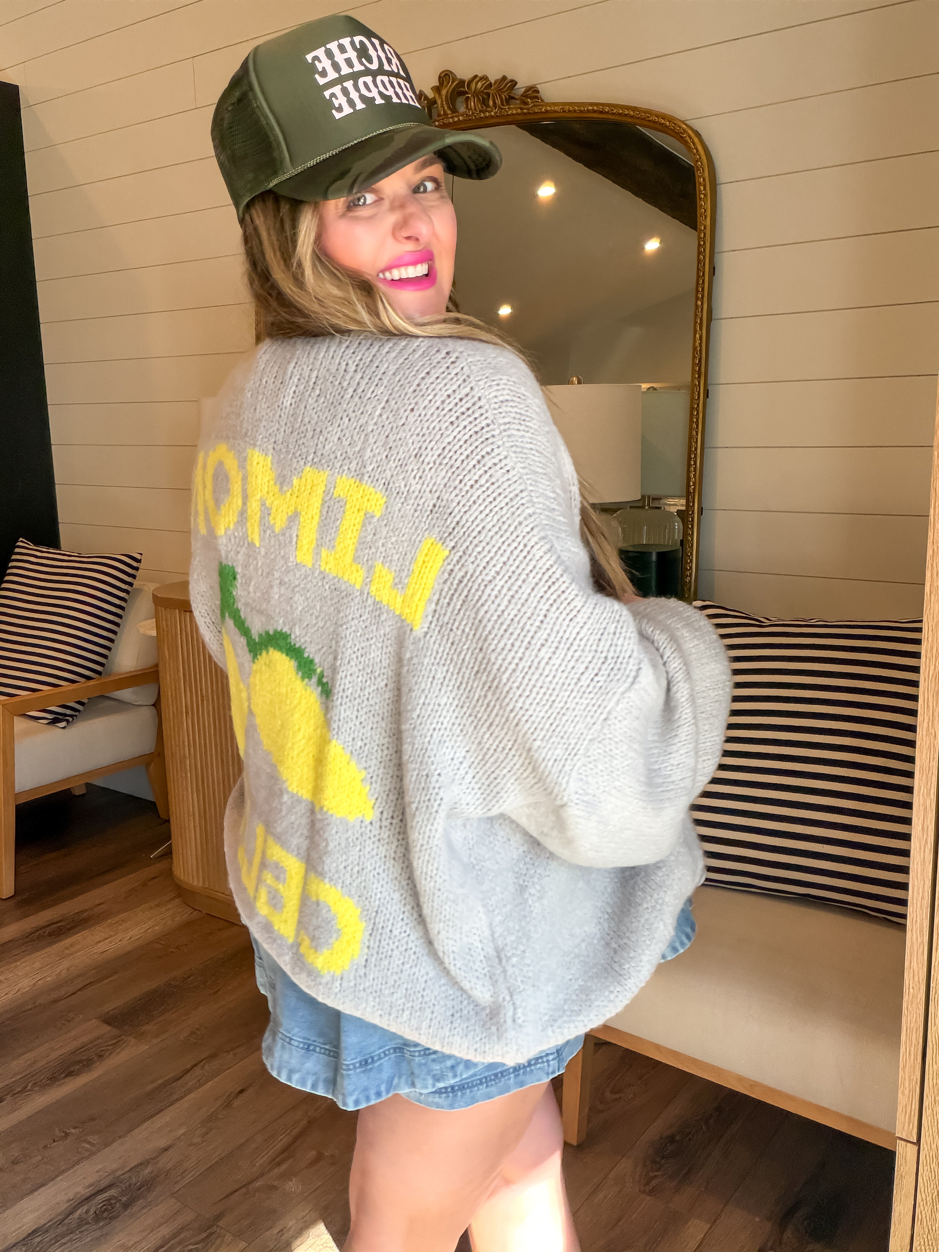 The Lemon Limon Cardigan in yellow is a handmade knit sweater featuring a distinctive "Limon" graphic on the back and a lemon graphic on the front chest. This cardigan combines chic aesthetics with comfort, making it a versatile choice for various occasions. Crafted in Italy, it offers a unique blend of style and warmth.