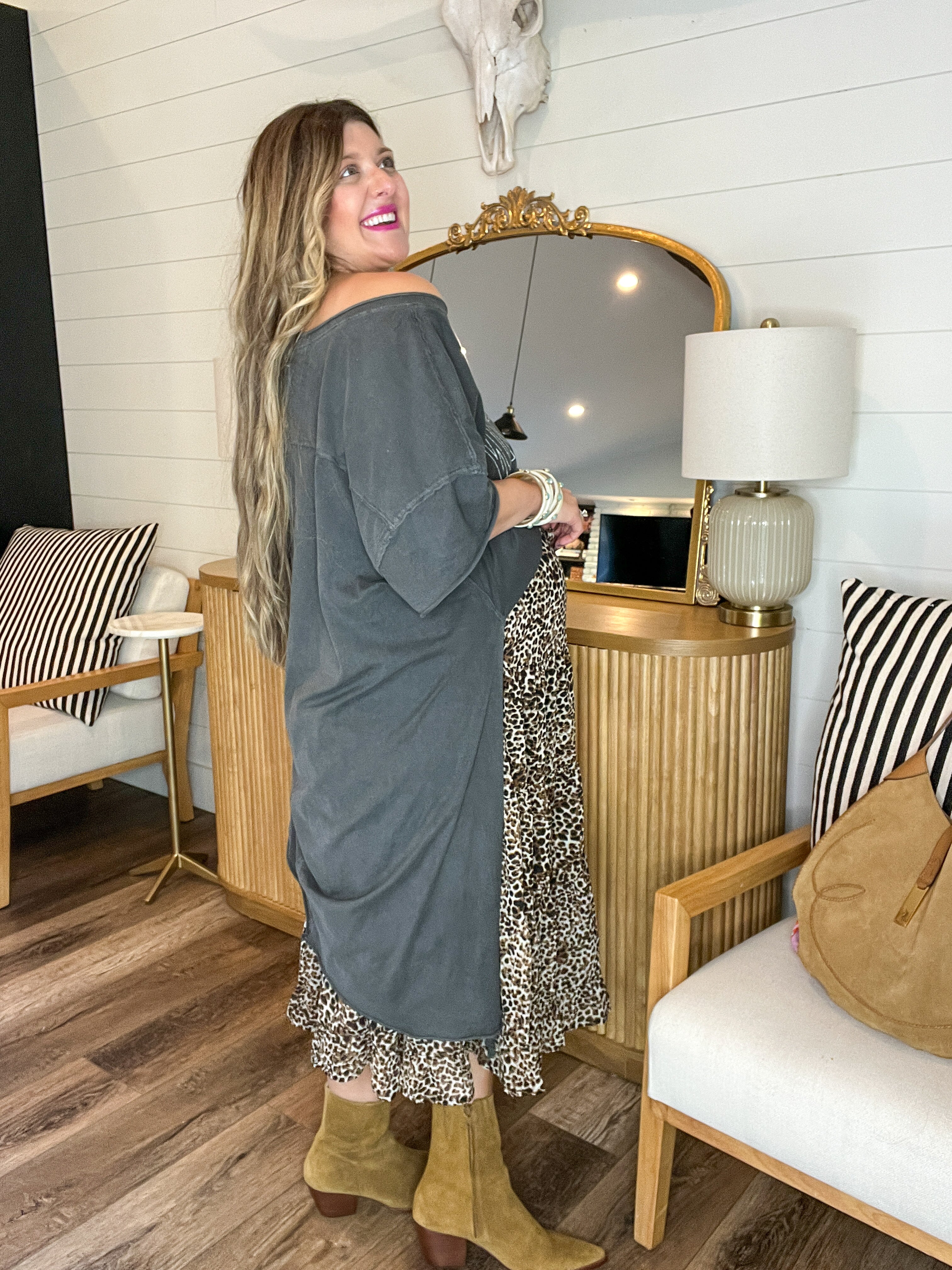 She’s fierce, flirty, and totally in charge—this tiered leopard maxi skirt brings the drama in all the right ways. With a soft, flowy shape and an easy-to-adjust drawstring waist, it’s as comfy as it is bold. The double ruffle hem adds that extra sass-factor, making it perfect for dancing, strutting, or just casually turning heads wherever you go.