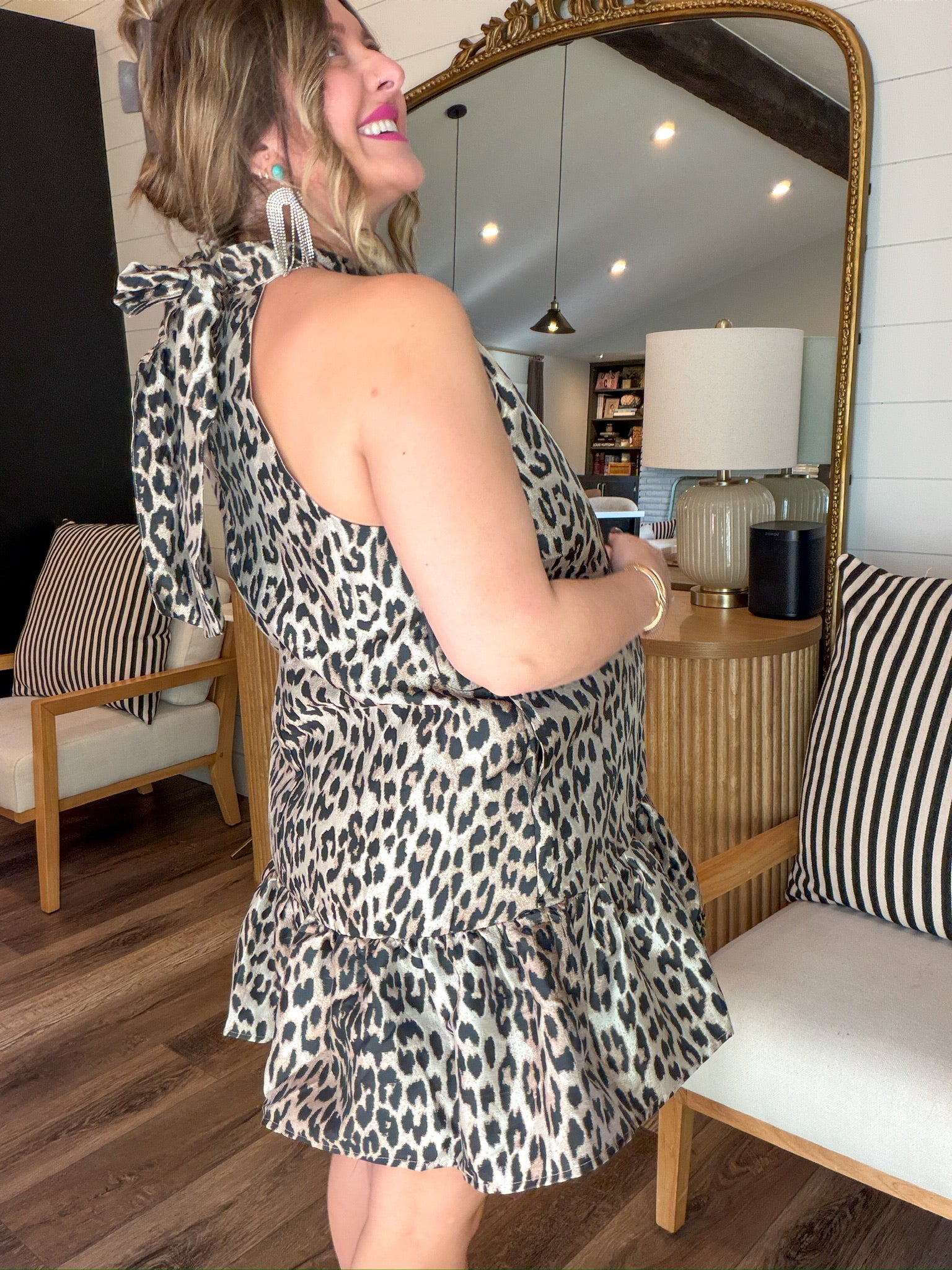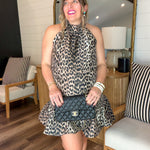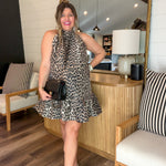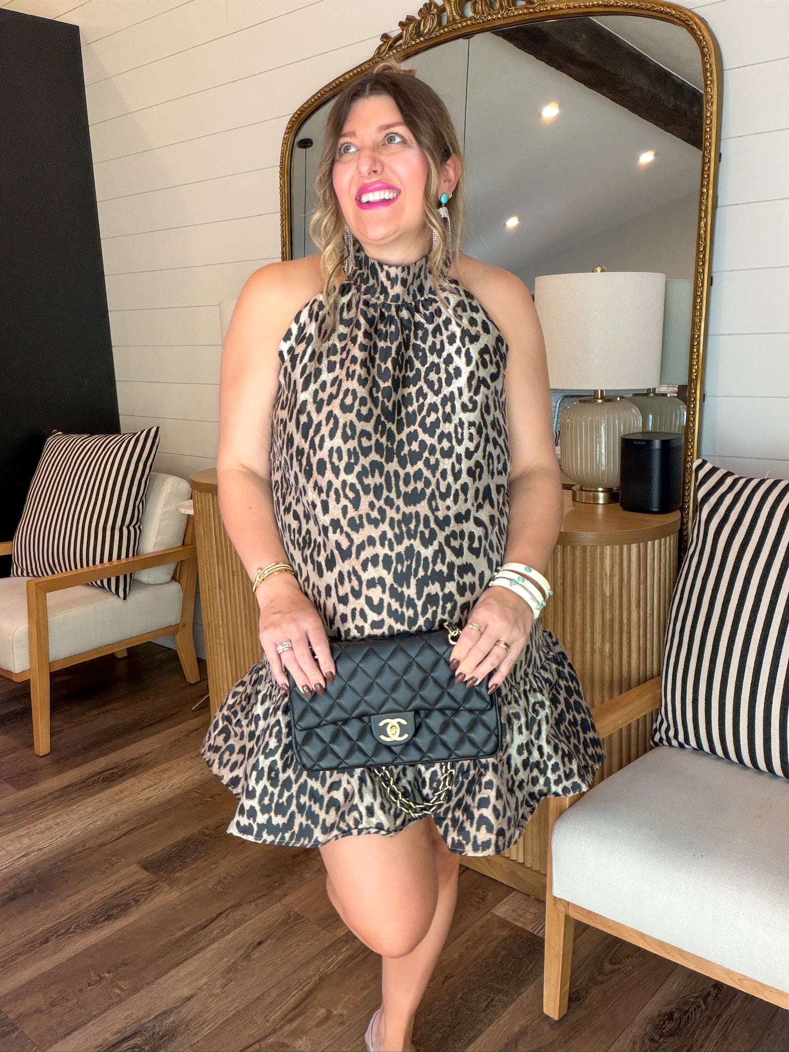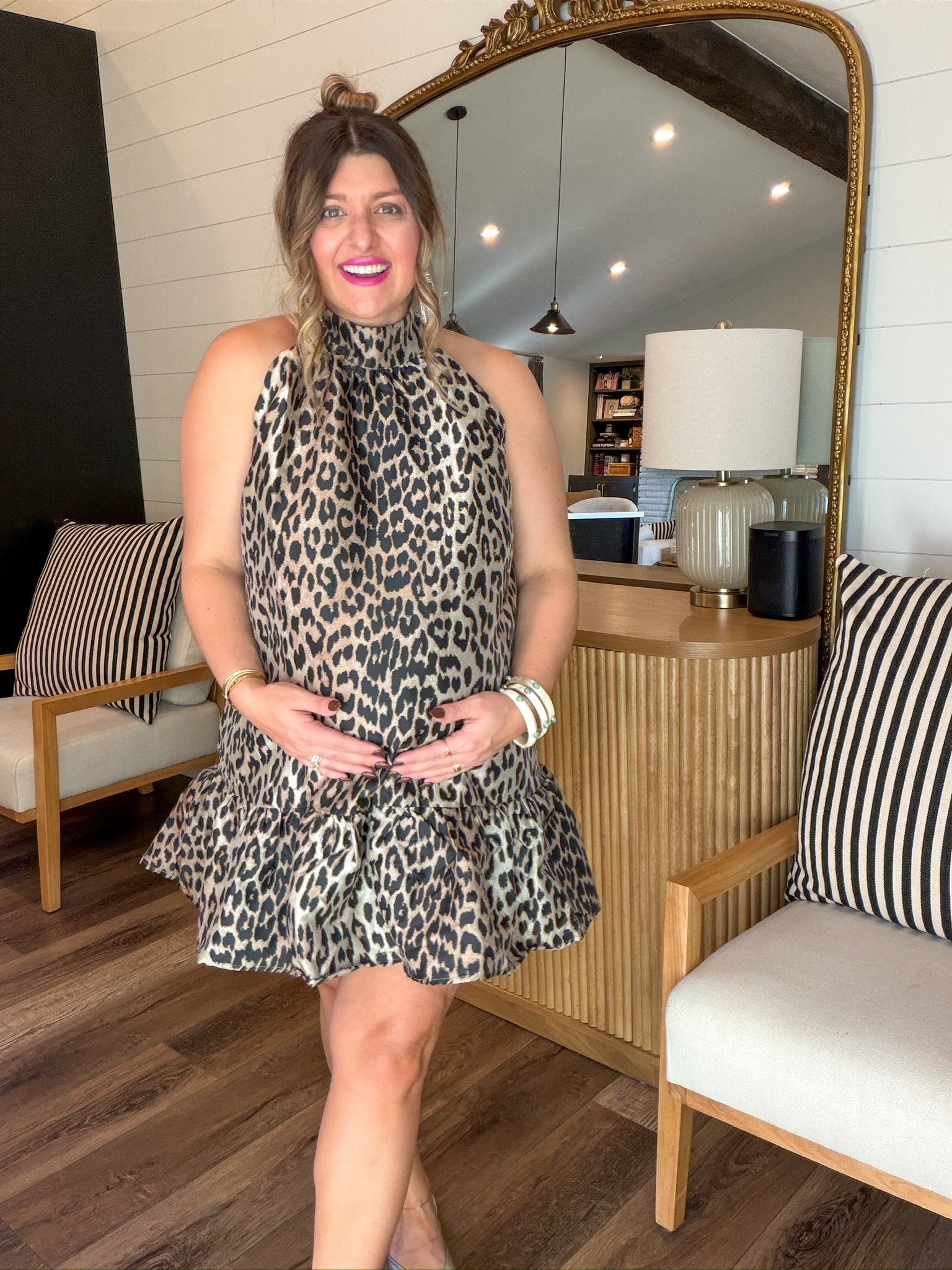 This mini is giving night-out energy meets effortless glam. Silky leopard drapes like liquid gold, catches the light like you own the place, and finishes with a flirty ruffle hem that says “I didn’t come to play… but I did come to slay.” She swings, she shimmers, she demands a spicy mocktail and a soft glam moment.