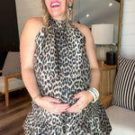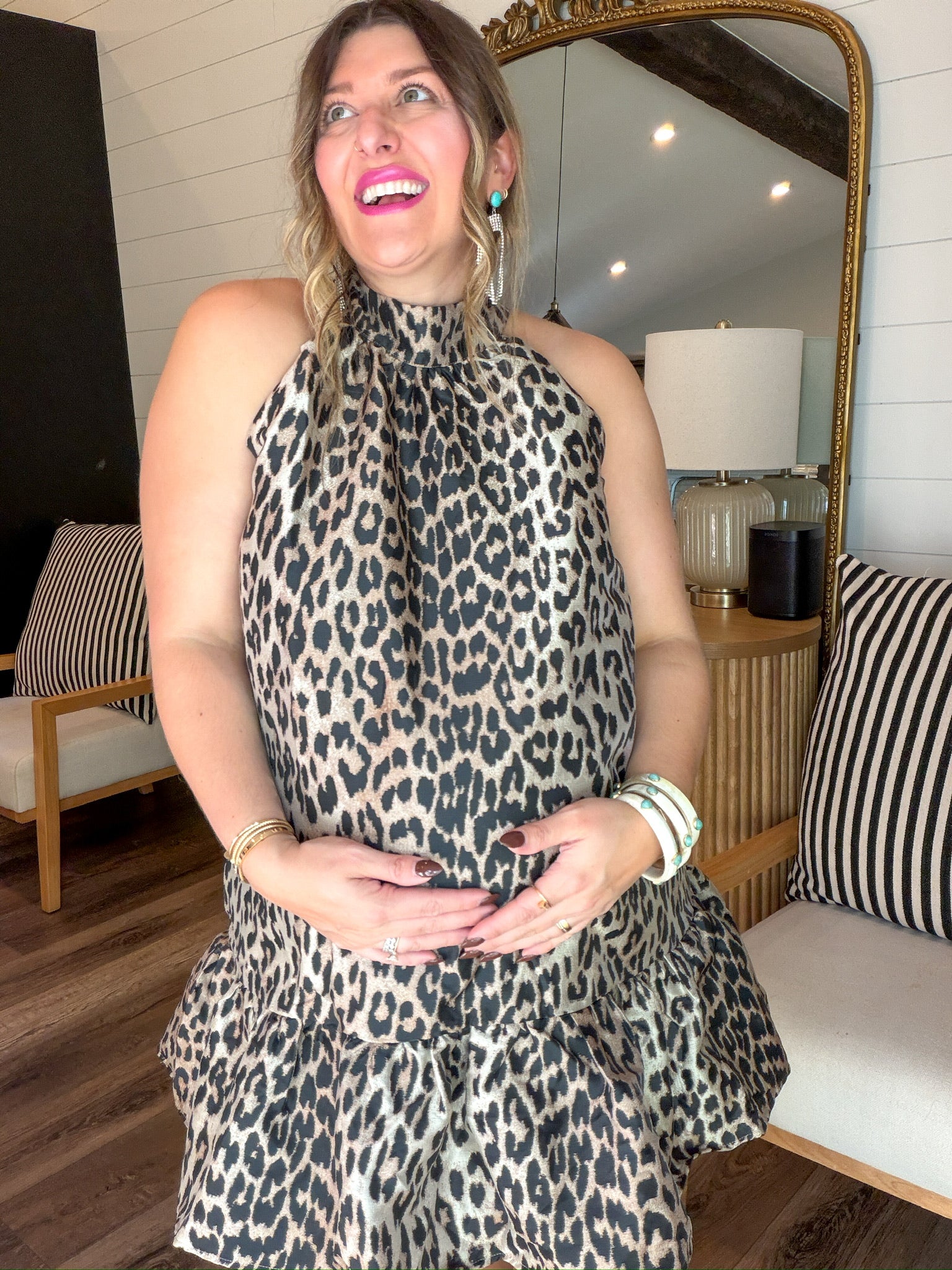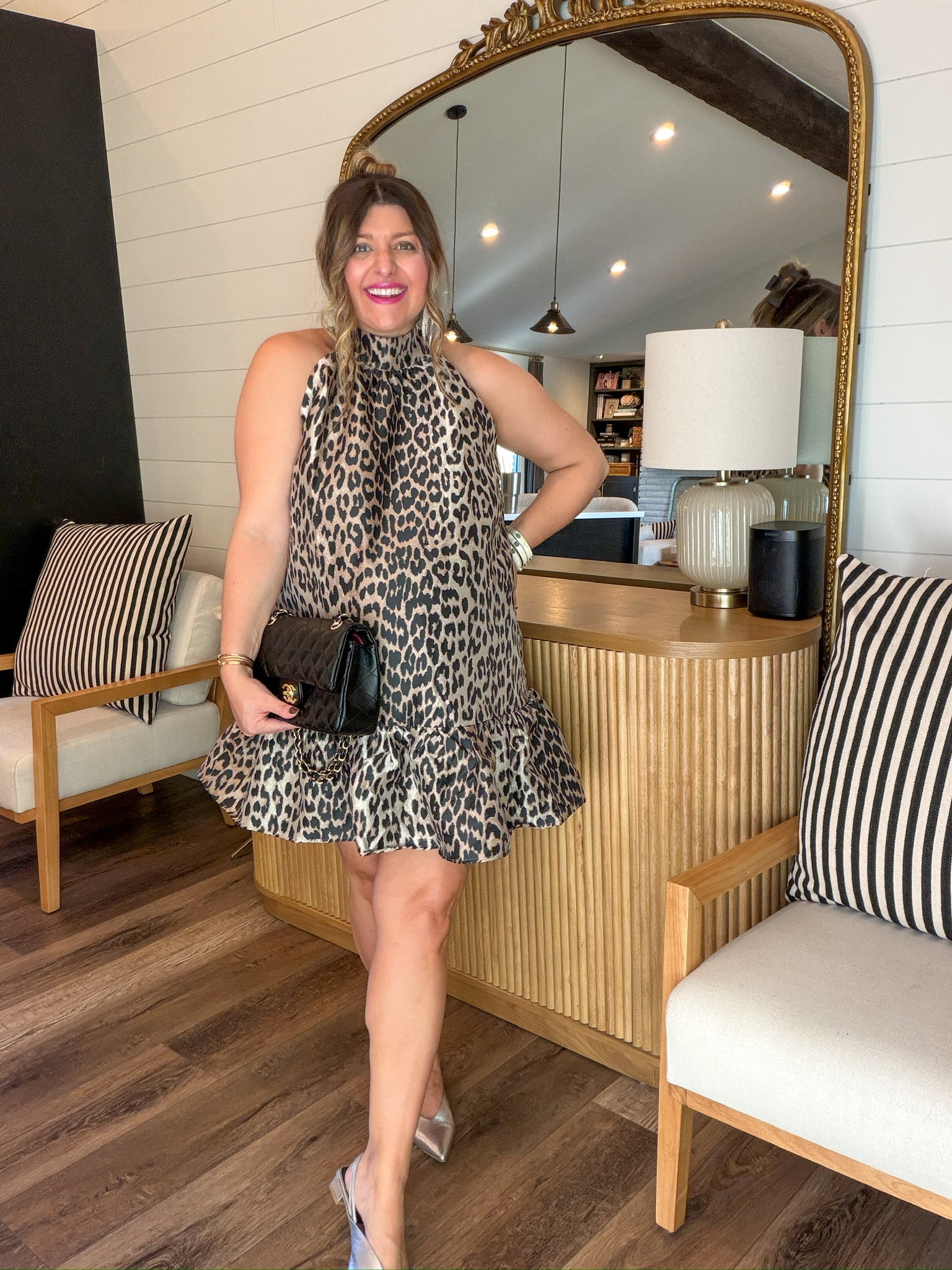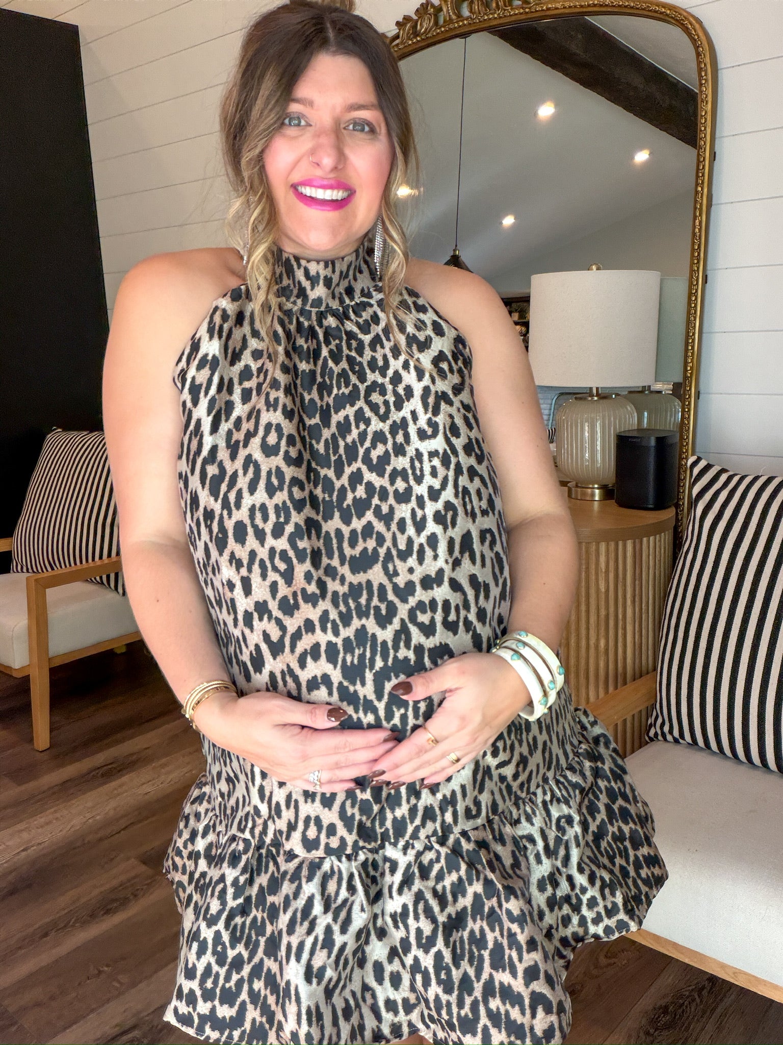 This mini is giving night-out energy meets effortless glam. Silky leopard drapes like liquid gold, catches the light like you own the place, and finishes with a flirty ruffle hem that says “I didn’t come to play… but I did come to slay.” She swings, she shimmers, she demands a spicy mocktail and a soft glam moment.