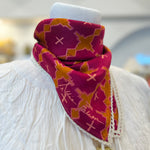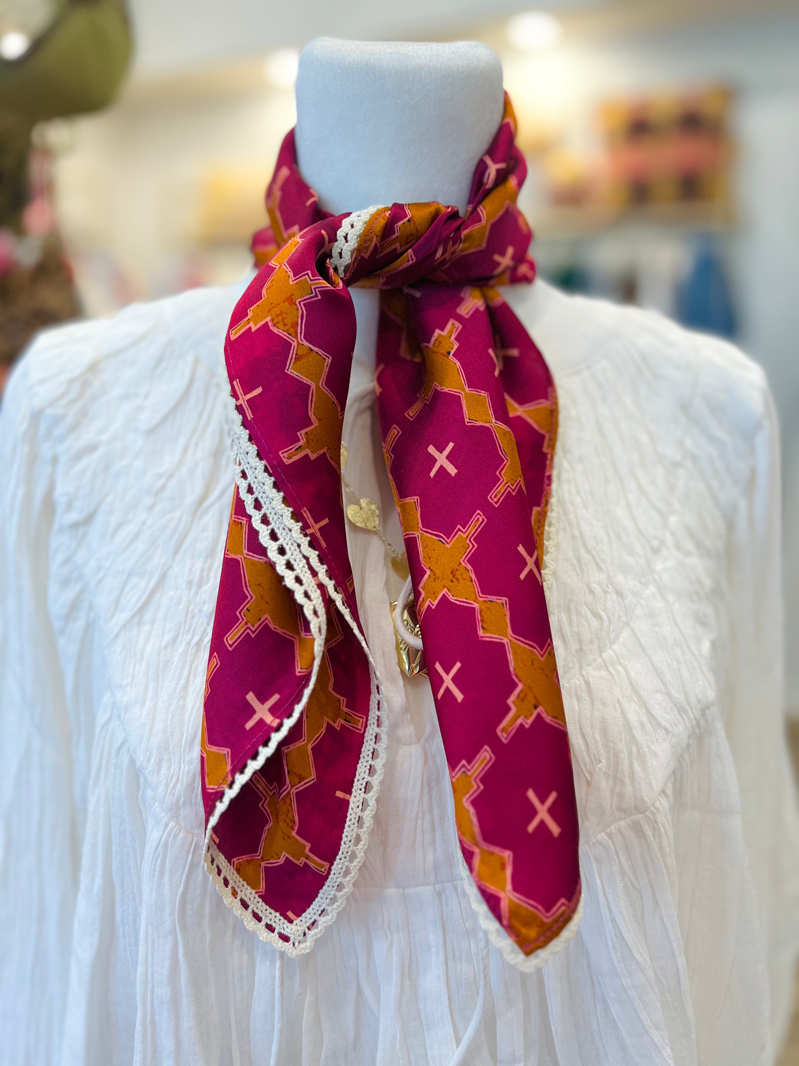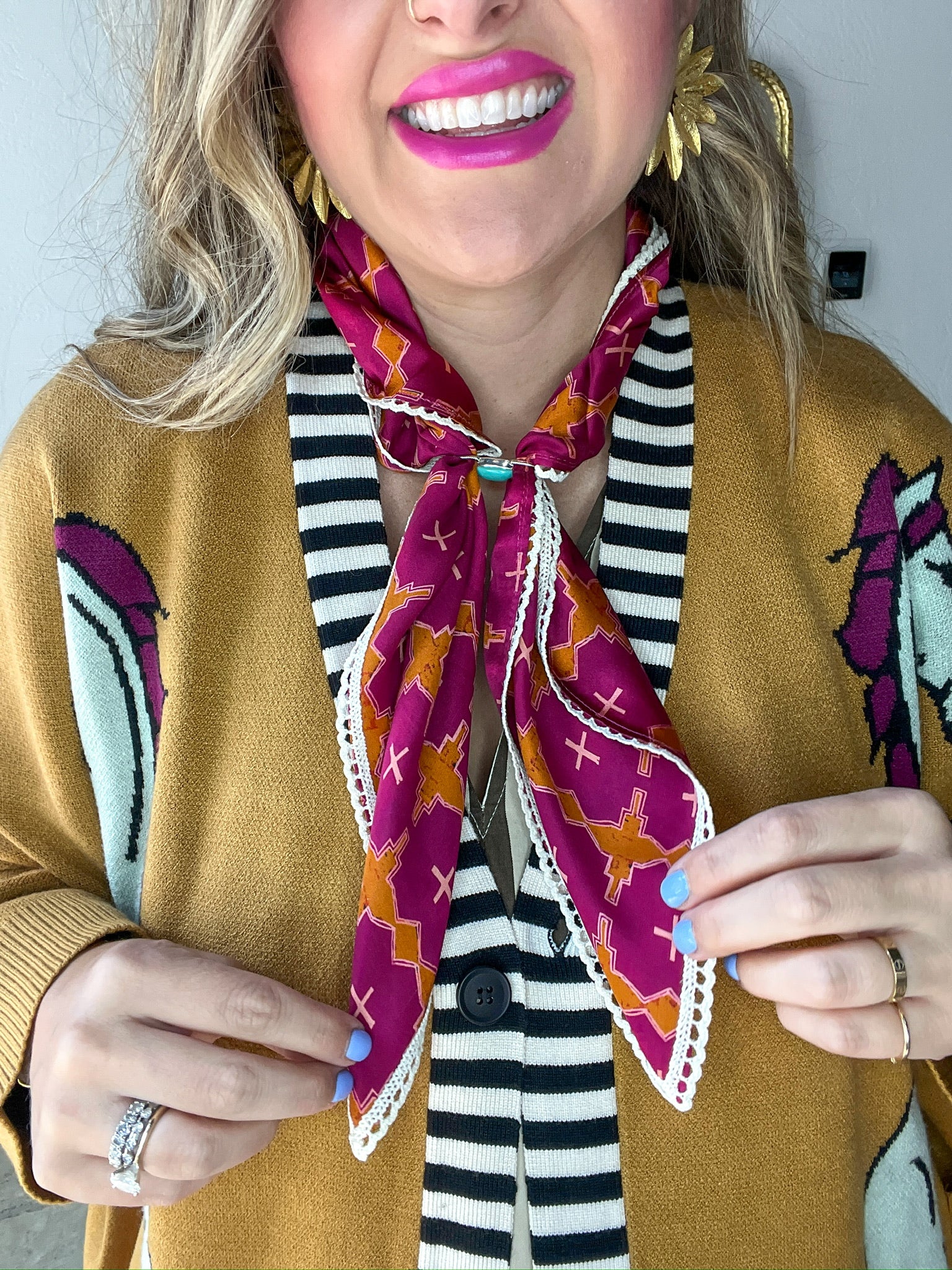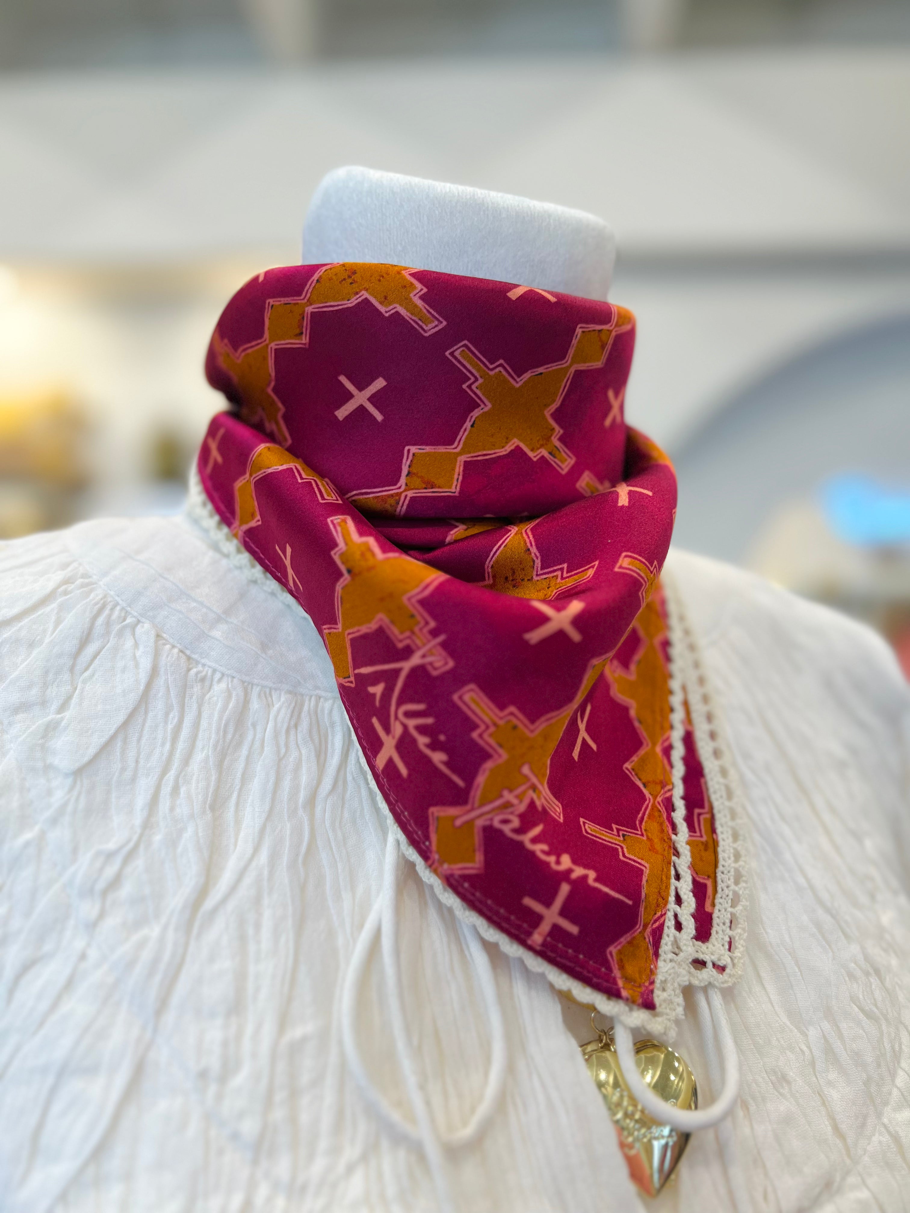 Saturated in sunset magenta with golden rust accents, this silky square is a total day-brightener. Whether you’re out on the ranch or just running errands in town, this bandana brings the perfect mix of bold color and delicate charm. Finished with cream crochet edges, it’s equal parts western and whimsical.