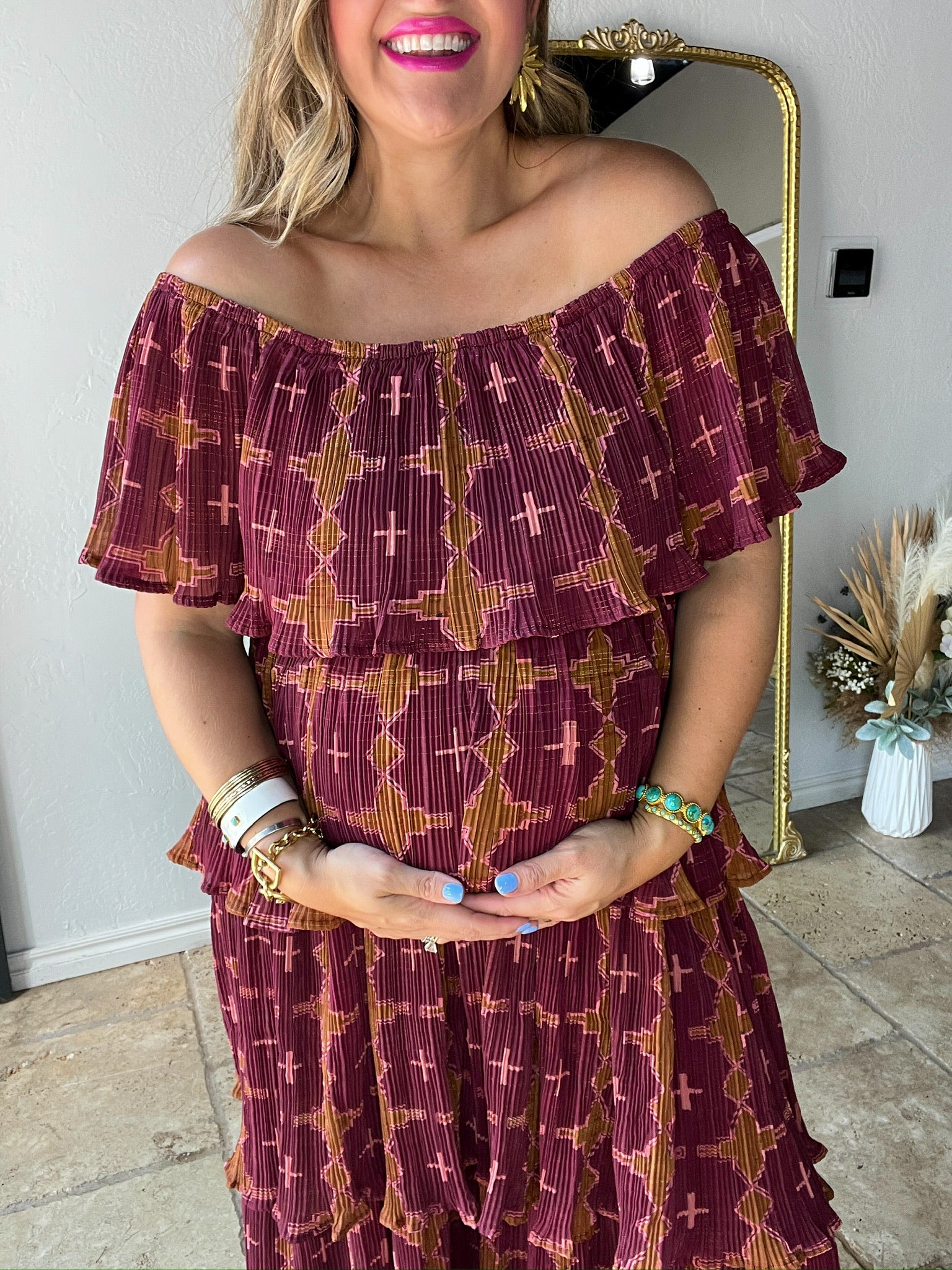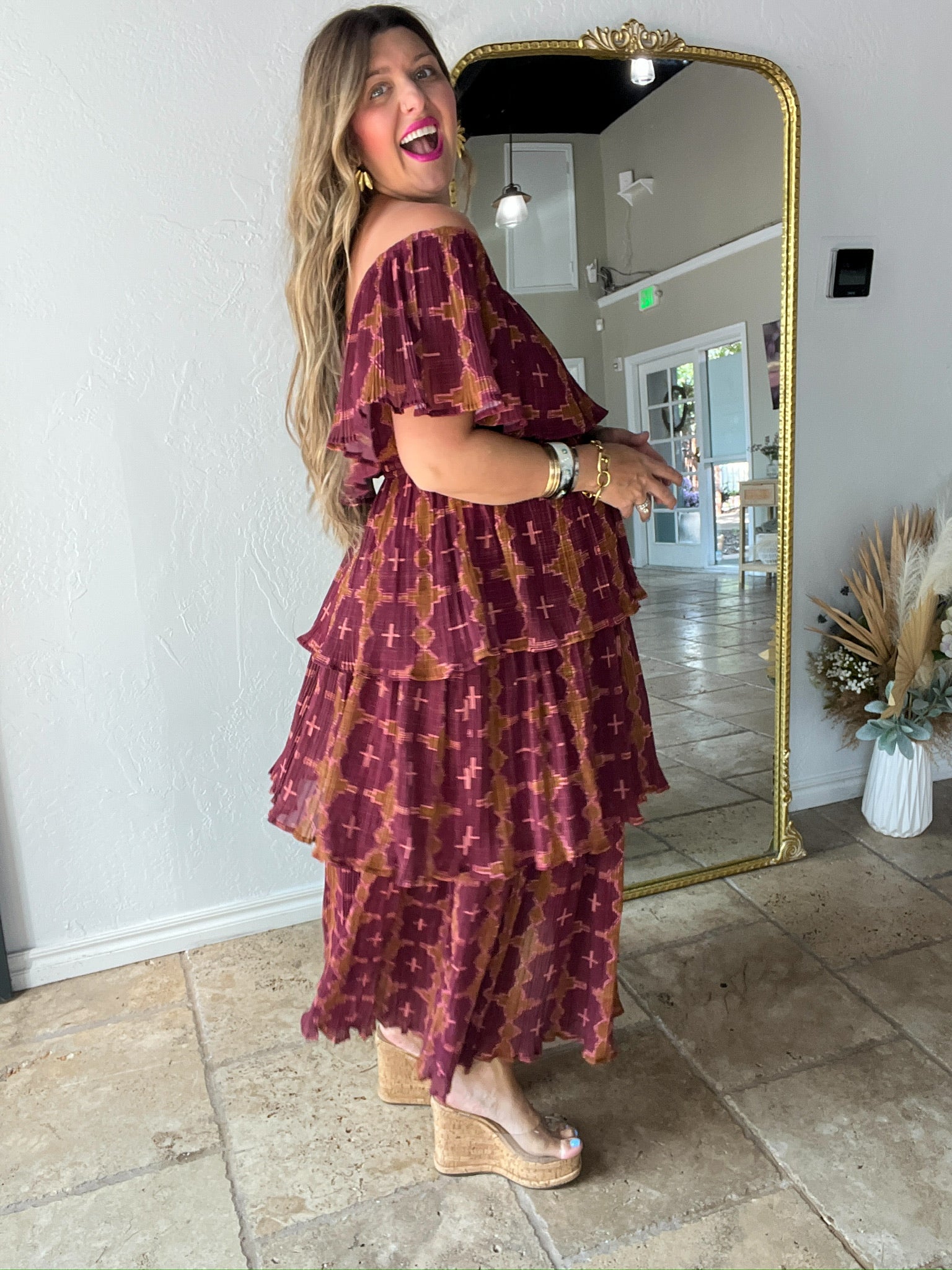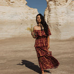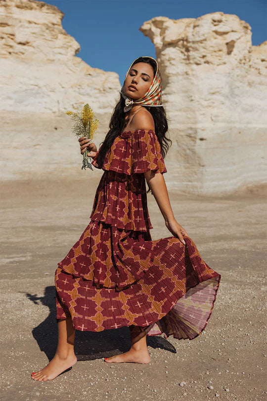 She’s flirty. She’s flowy. She’s got that main character moment built right in. The Malone Dress by Allie Falcon floats with every step, moving like a dream through golden-hour light. Designed with a hand-drawn geometric print and streaked with subtle metallic threads, this off-shoulder beauty makes you feel like a desert goddess just breezing through her day.