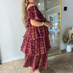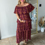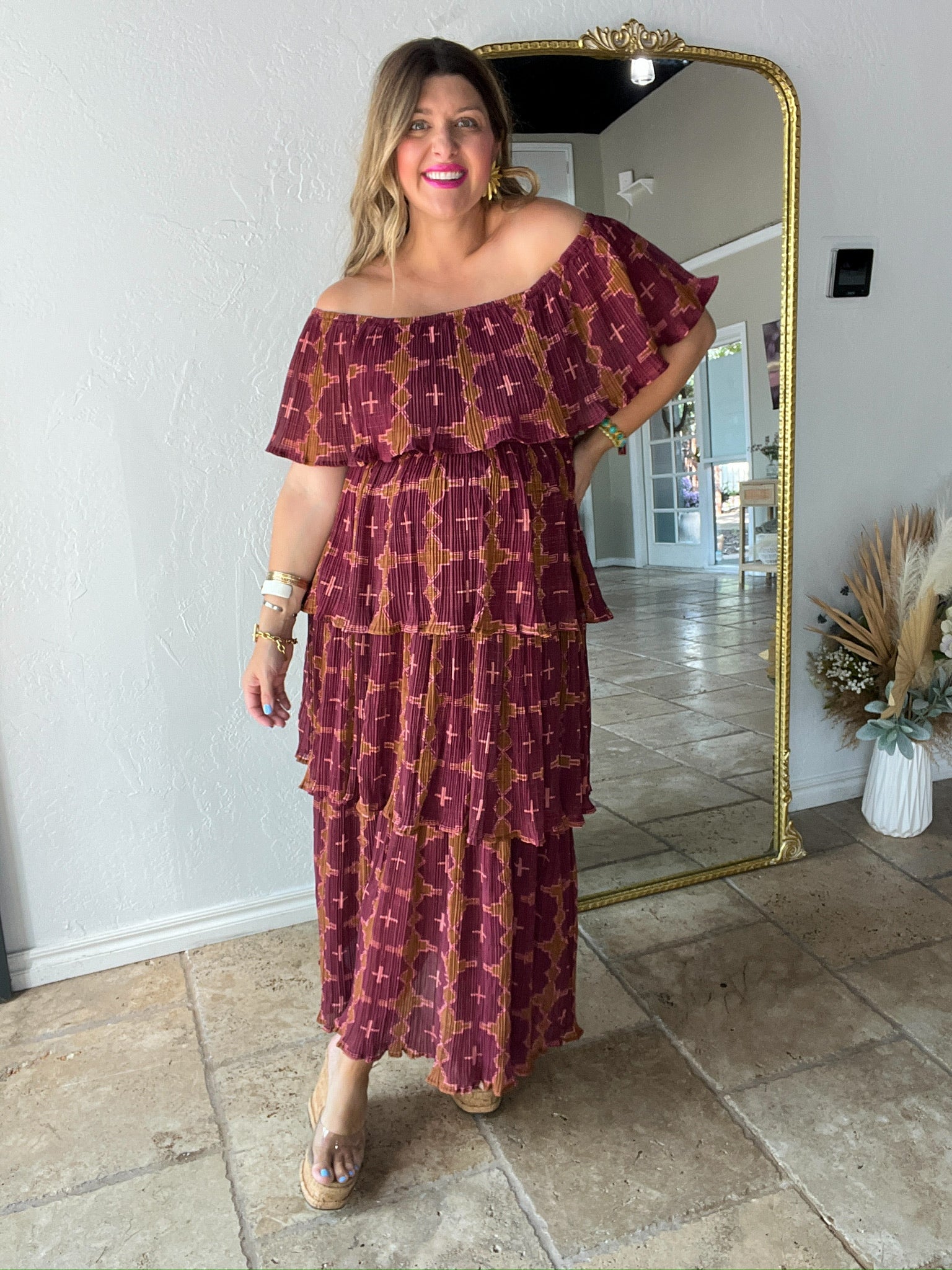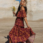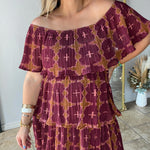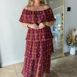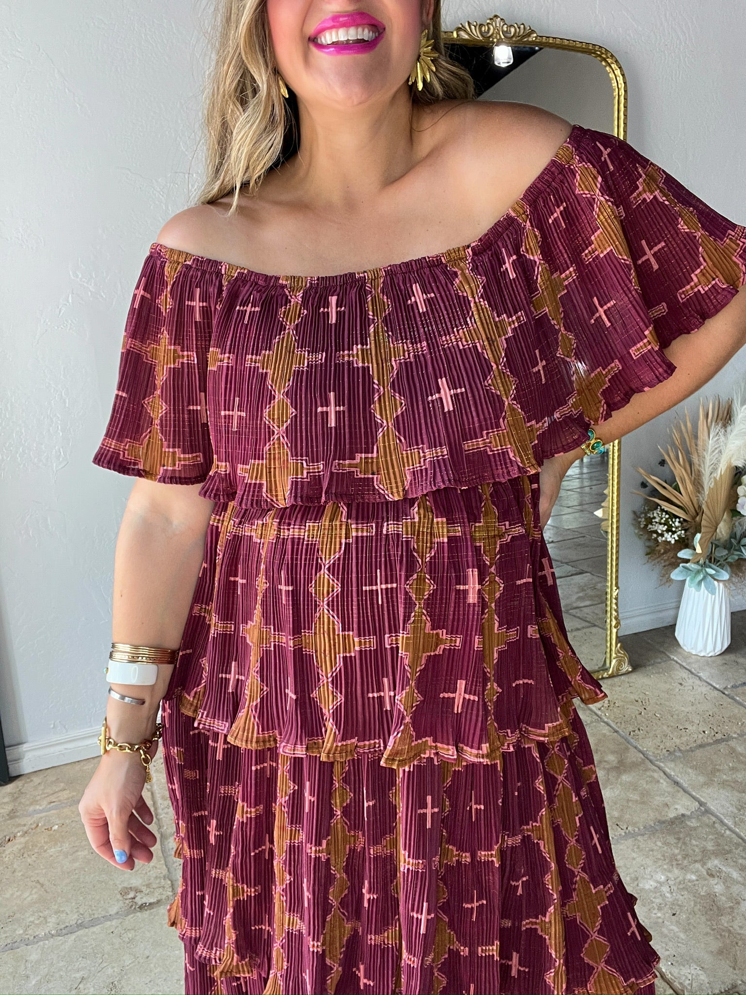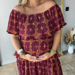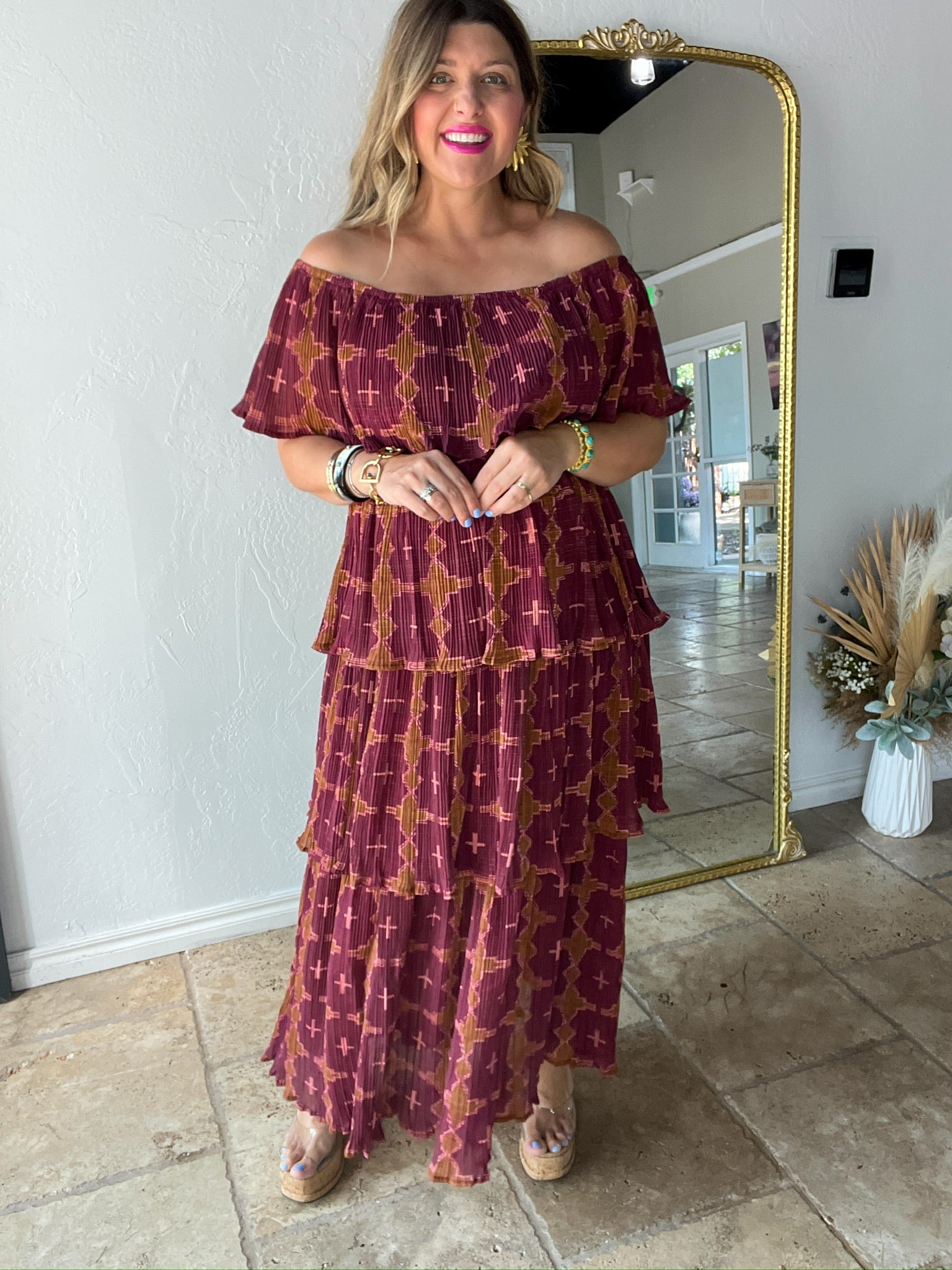 She’s flirty. She’s flowy. She’s got that main character moment built right in. The Malone Dress by Allie Falcon floats with every step, moving like a dream through golden-hour light. Designed with a hand-drawn geometric print and streaked with subtle metallic threads, this off-shoulder beauty makes you feel like a desert goddess just breezing through her day.