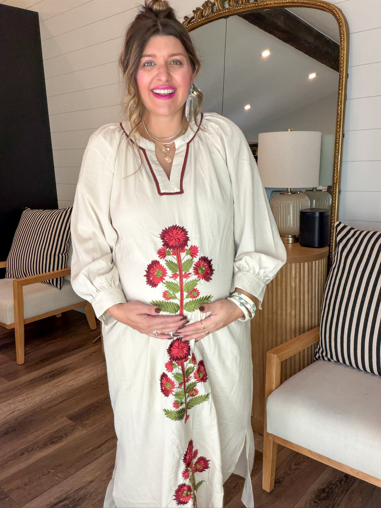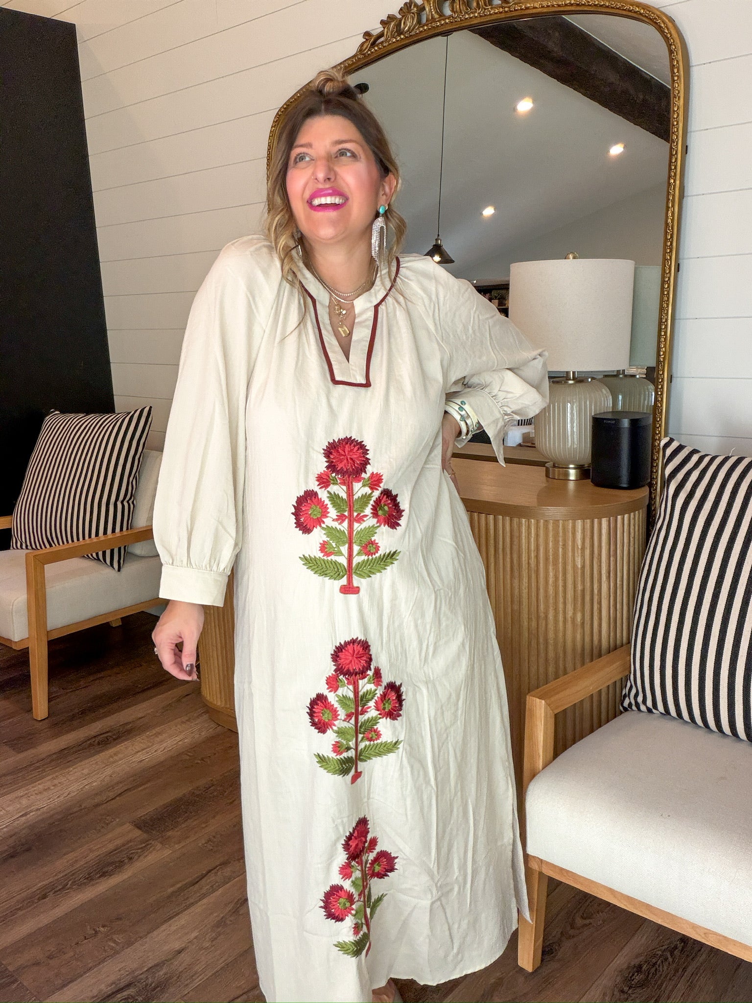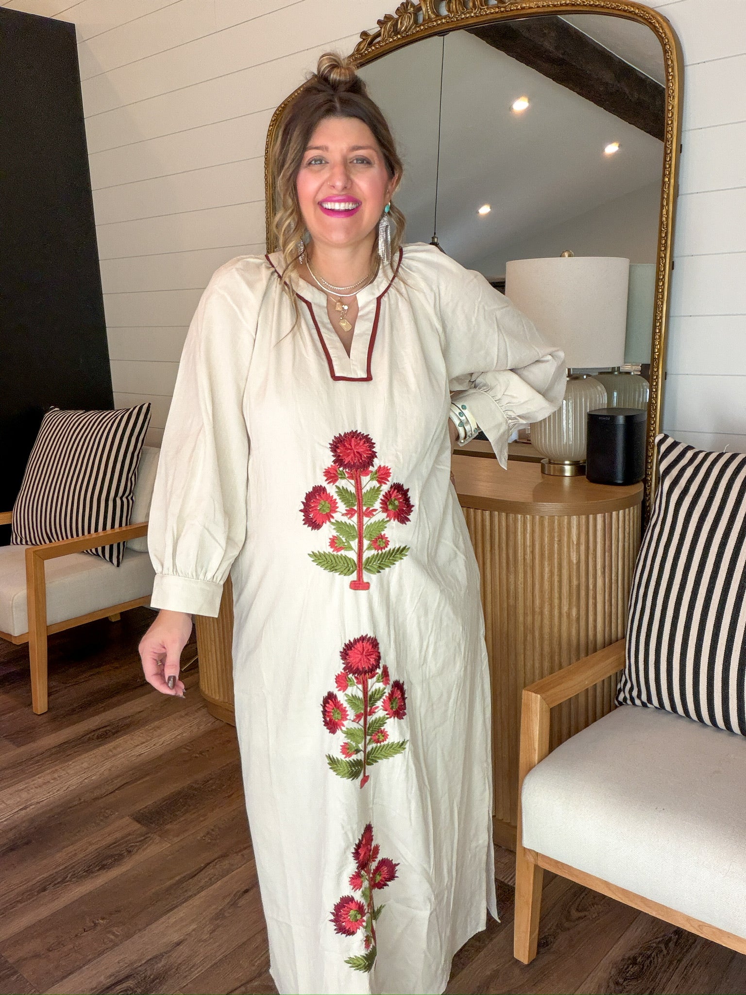 The art-girl holiday dress. This cream maxi brings handmade elegance with its stunning red floral embroidery running down the front — equal parts bohemian and heirloom. She’s that effortless piece you throw on when you want to look like you wandered out of an Anthropologie ad but still made it to brunch on time.
