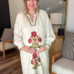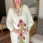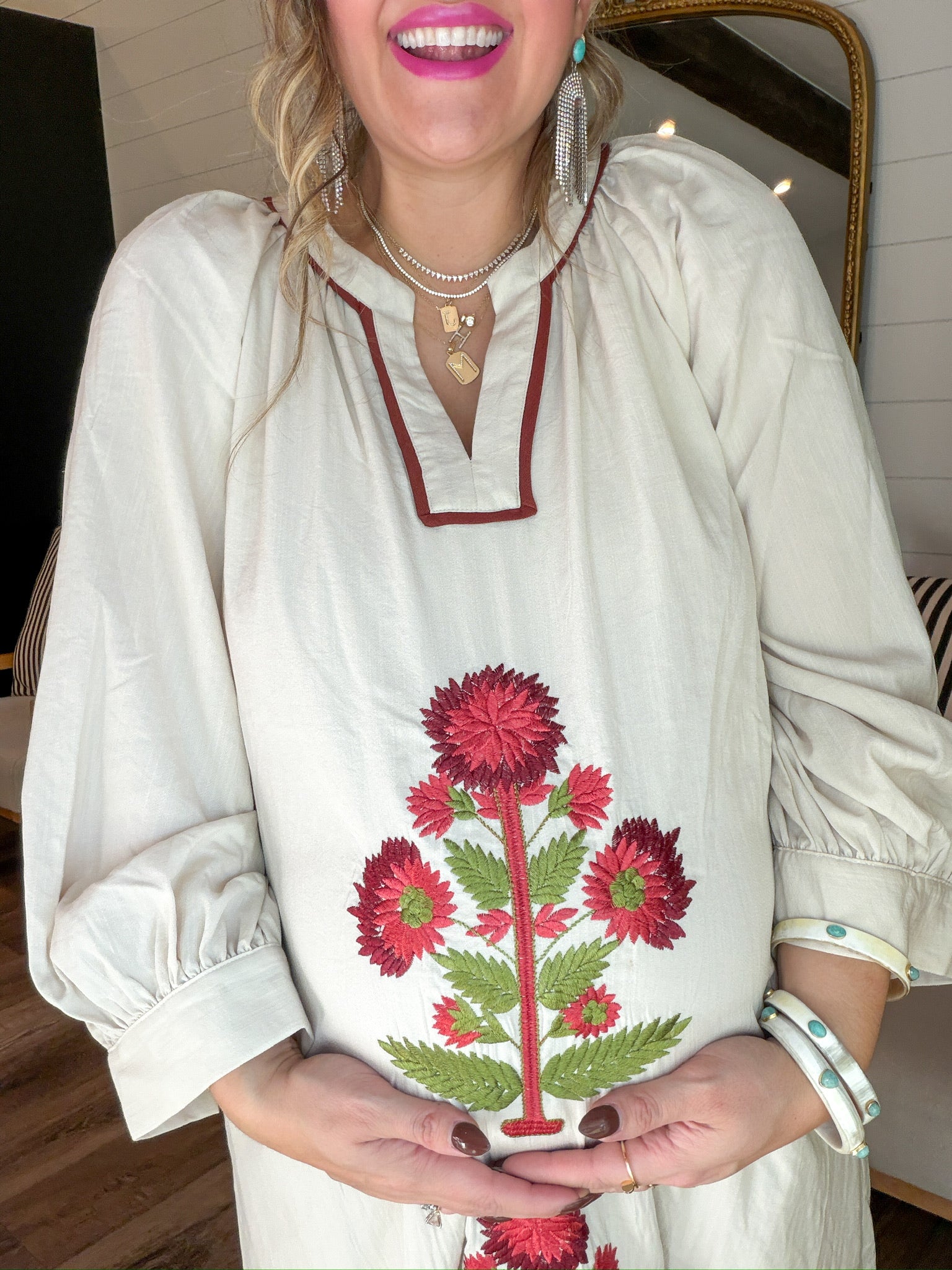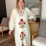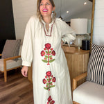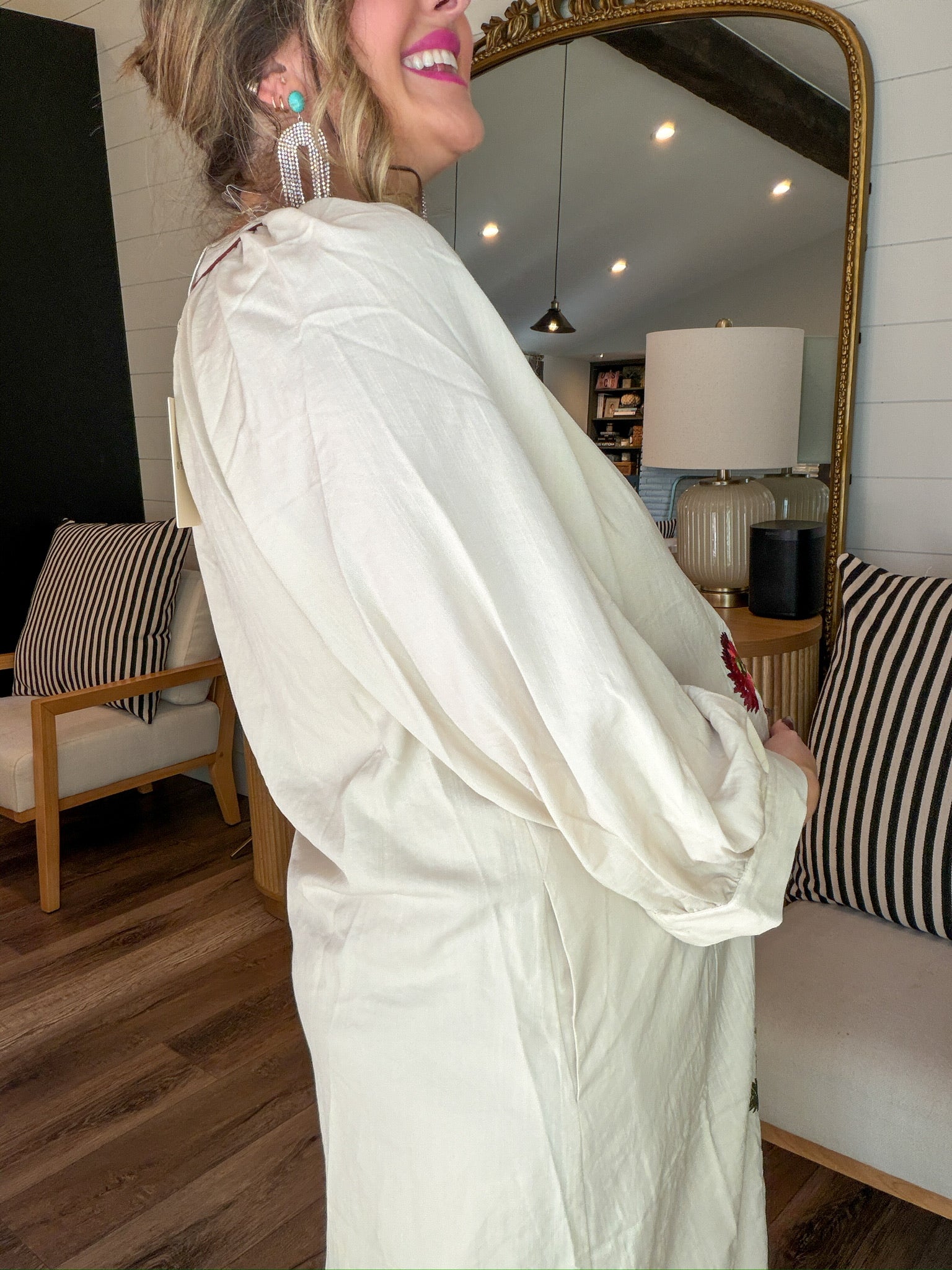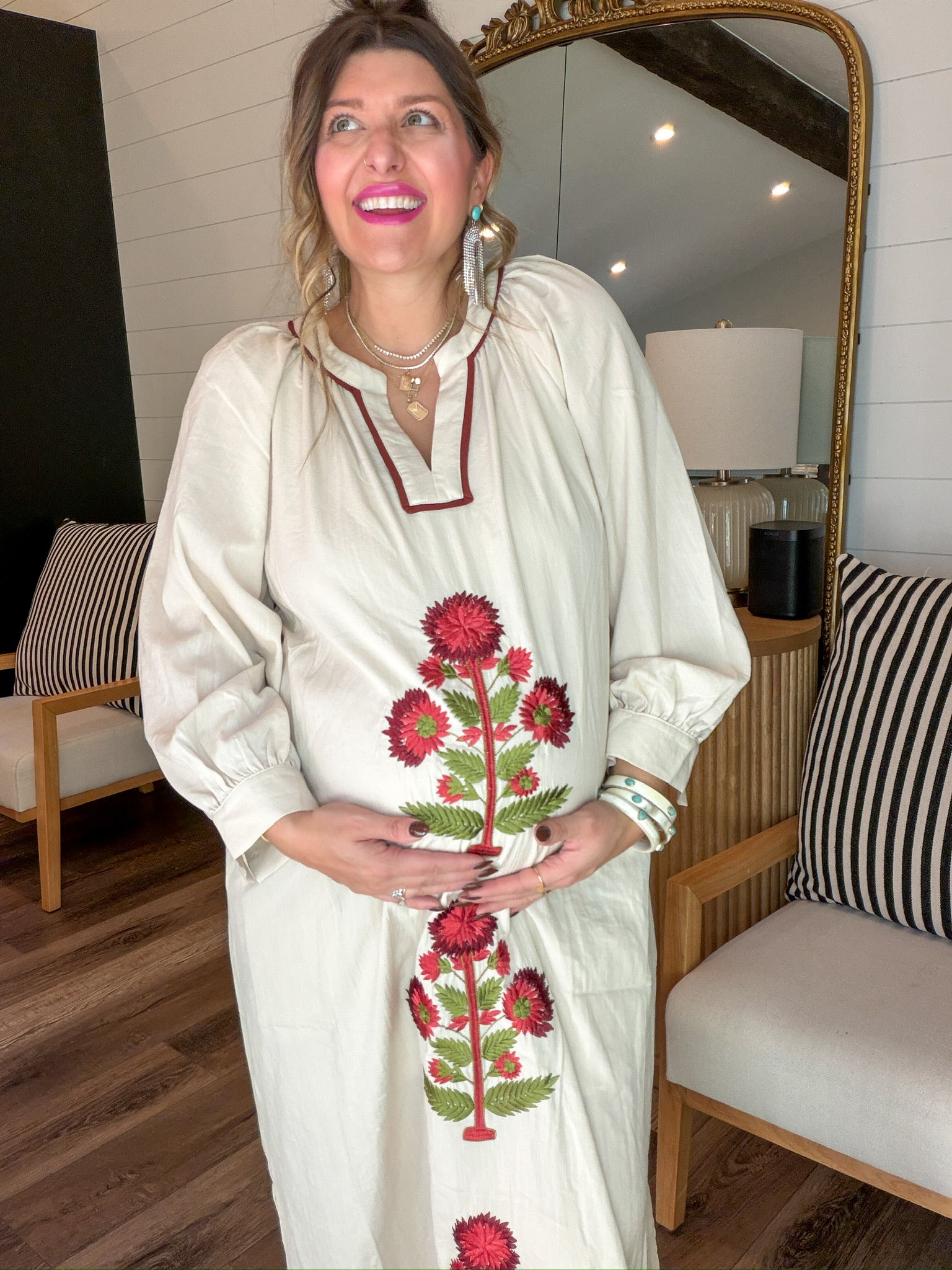 The art-girl holiday dress. This cream maxi brings handmade elegance with its stunning red floral embroidery running down the front — equal parts bohemian and heirloom. She’s that effortless piece you throw on when you want to look like you wandered out of an Anthropologie ad but still made it to brunch on time.