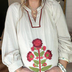 • Rich red floral embroidery down the front for that statement-boho vibe