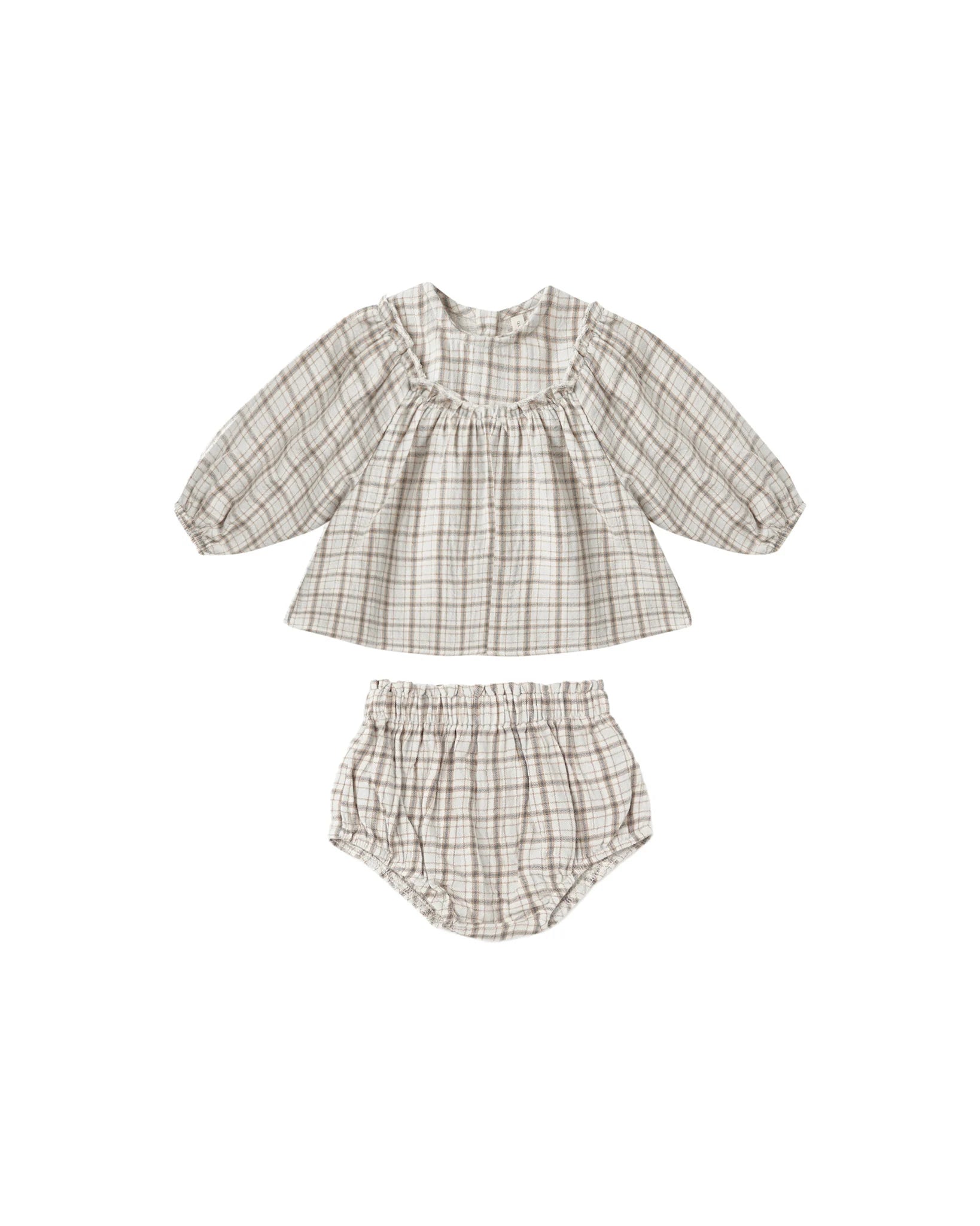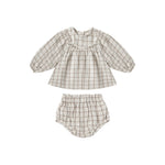 This darling set features a full gathered blouse with delicate ruffle detail, balloon sleeves, and a button-back closure, paired with matching bloomers for the perfect finishing touch. A timeless, must-have addition to your little one’s wardrobe.