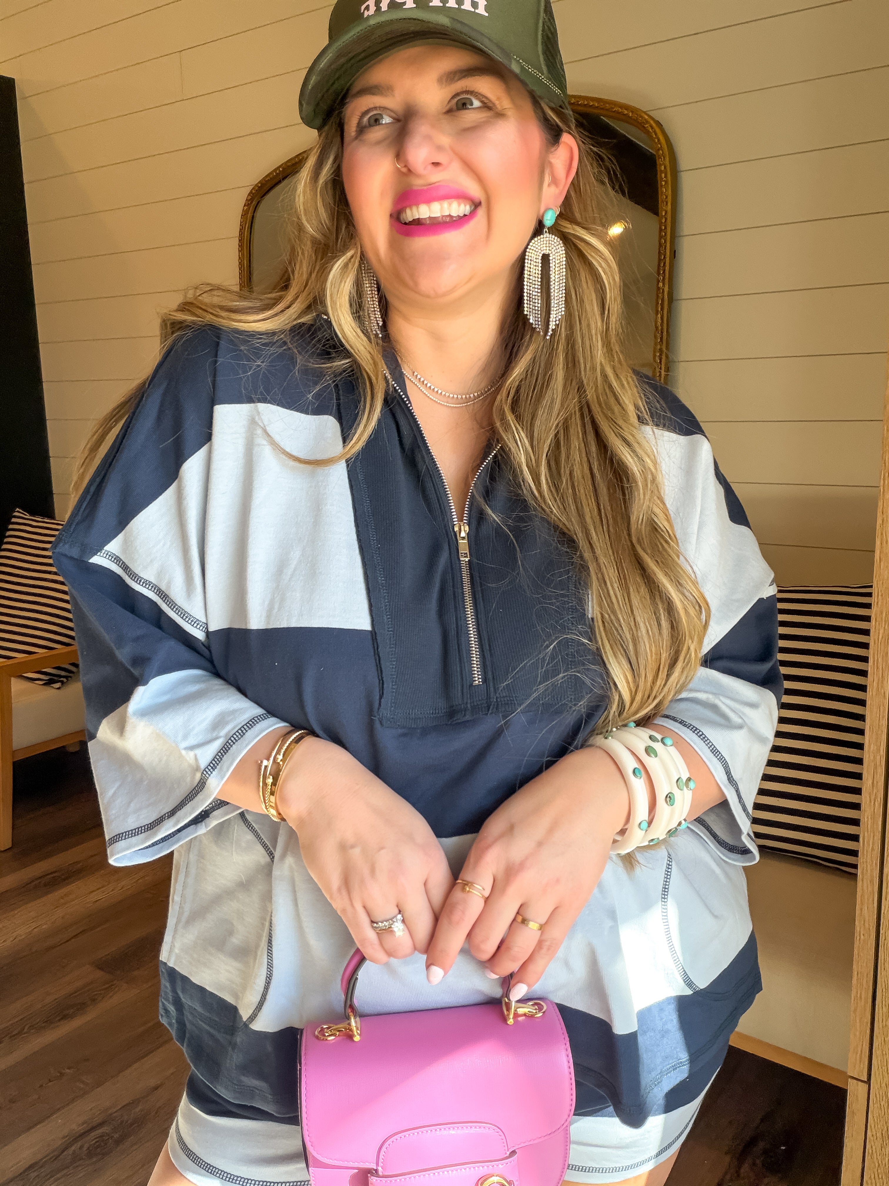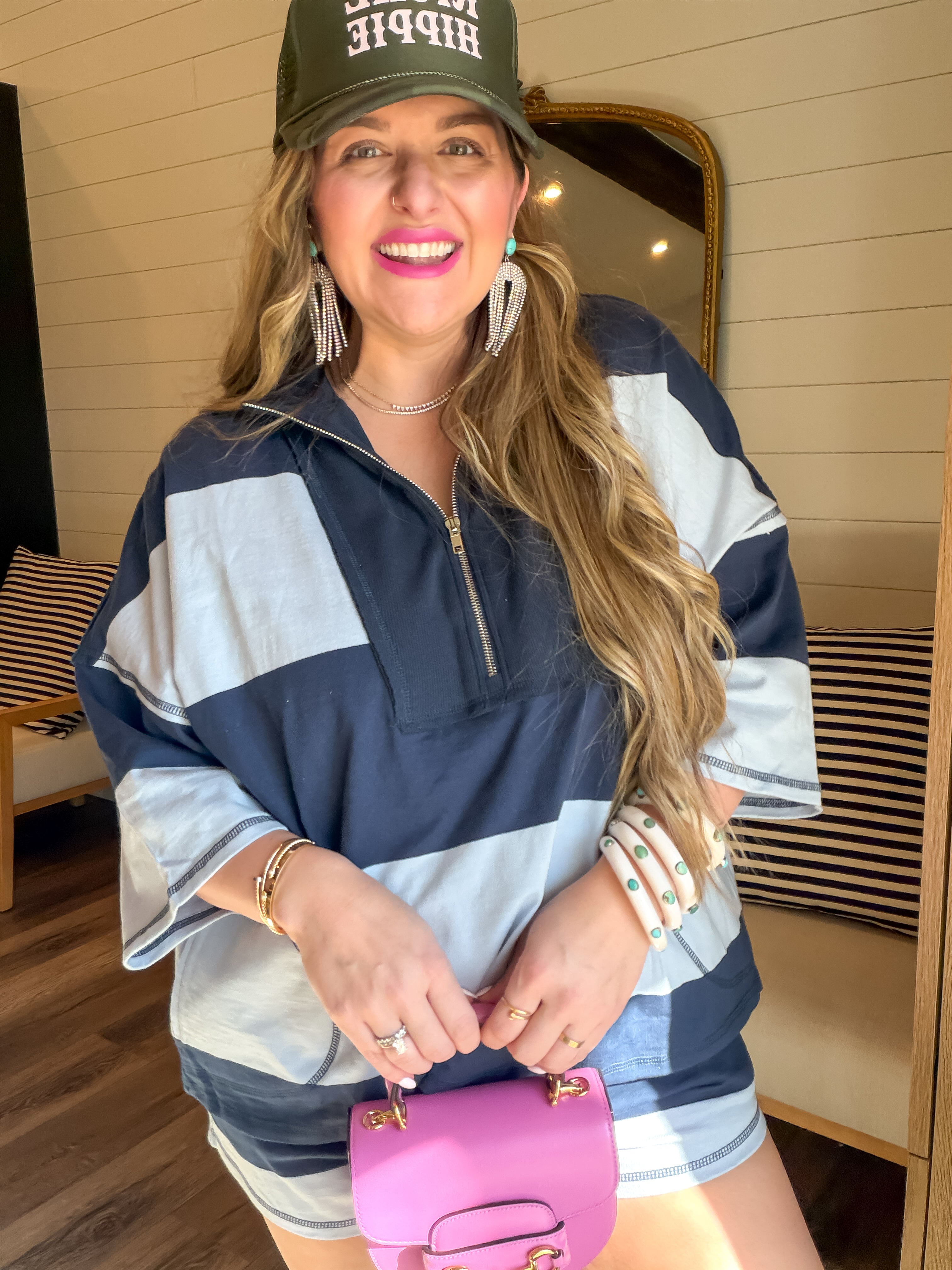 Meet your go-to set for the season! This top features a wide yarn stripe design, with a half sleeve, contrast detailed half zip-up, and raw edge for a unique look. Paired with the elastic waist band short, this is the set for you! So cozy and so chic you’ll get compliments all day long!