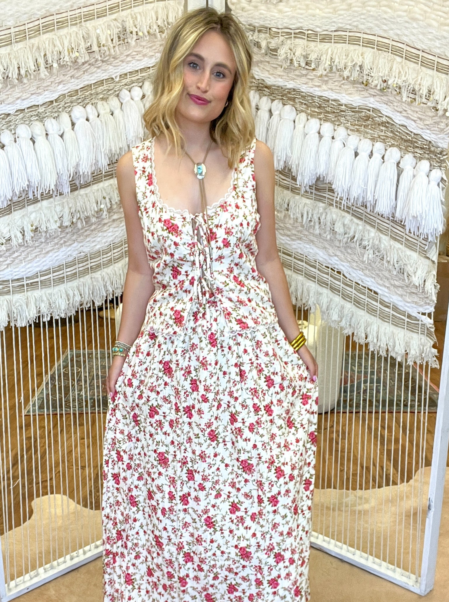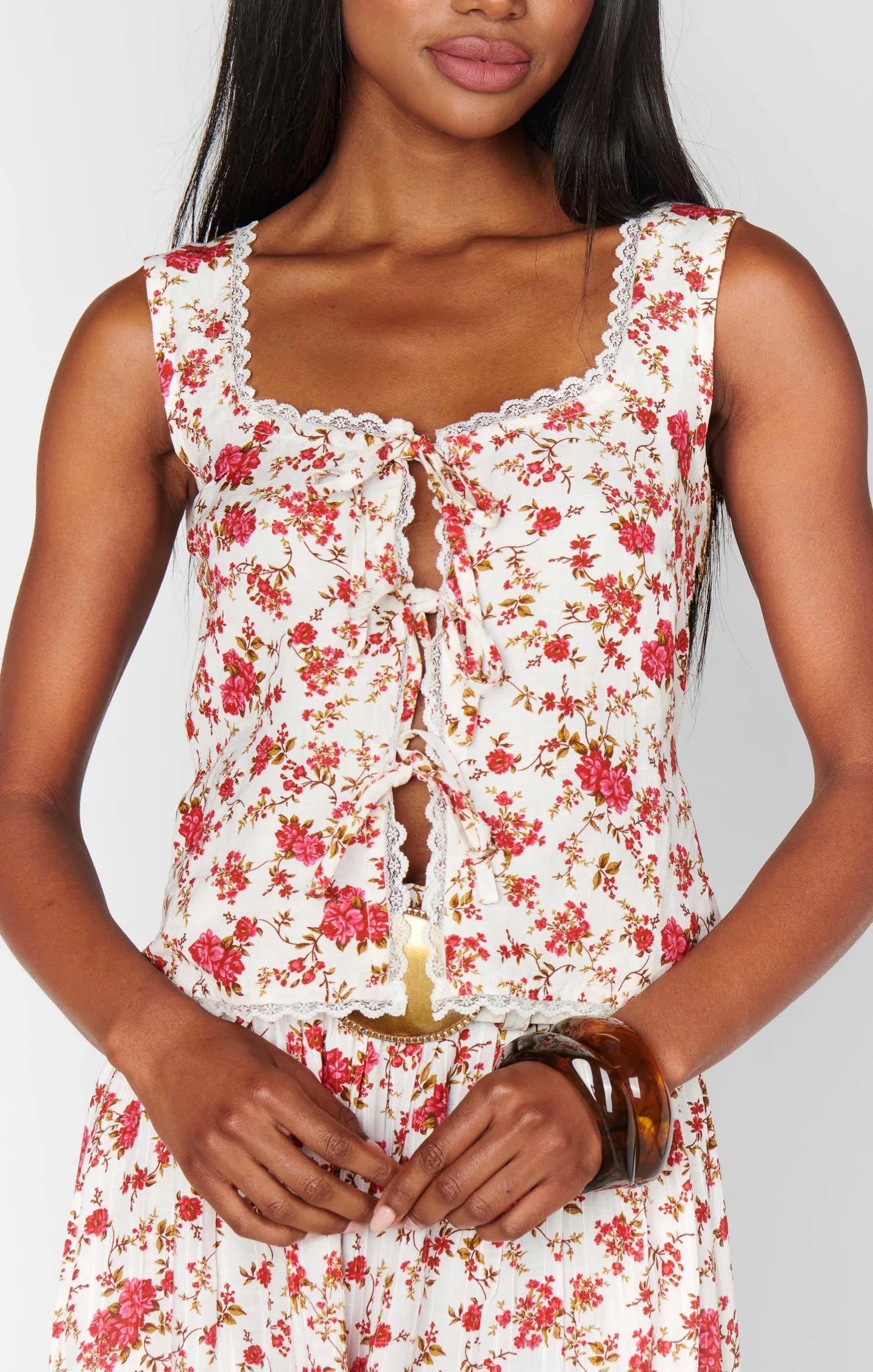 Effortlessly femme, this tank features a slim silhouette, delicate lace trim, and adjustable tie details. A waist-cinching belt at the back adds the perfect touch for a flattering fit. Wear it with denim for a laid-back look or pair it with the matching Adrianna Maxi Skirt and boots when you’re feeling a little more western!