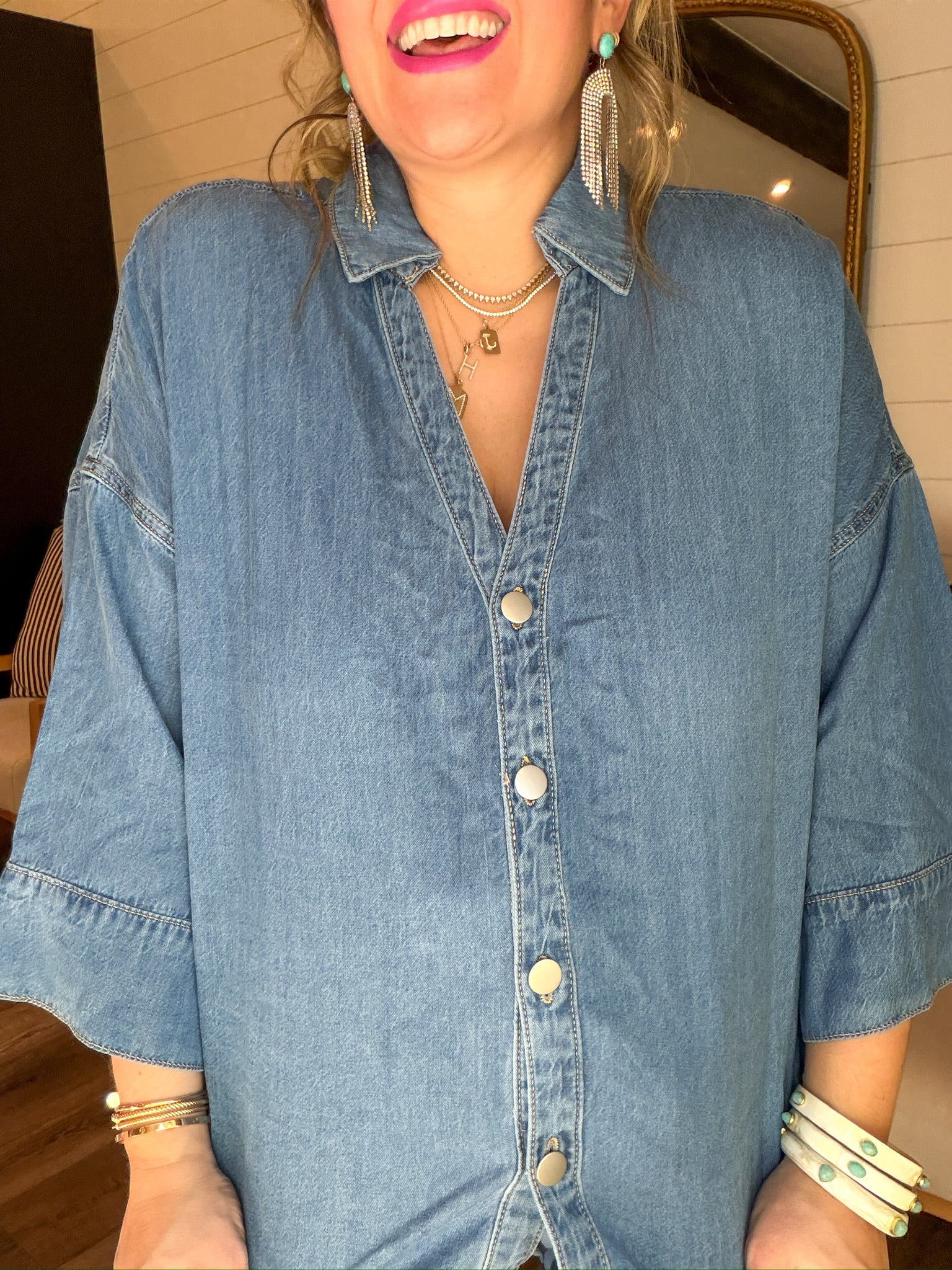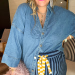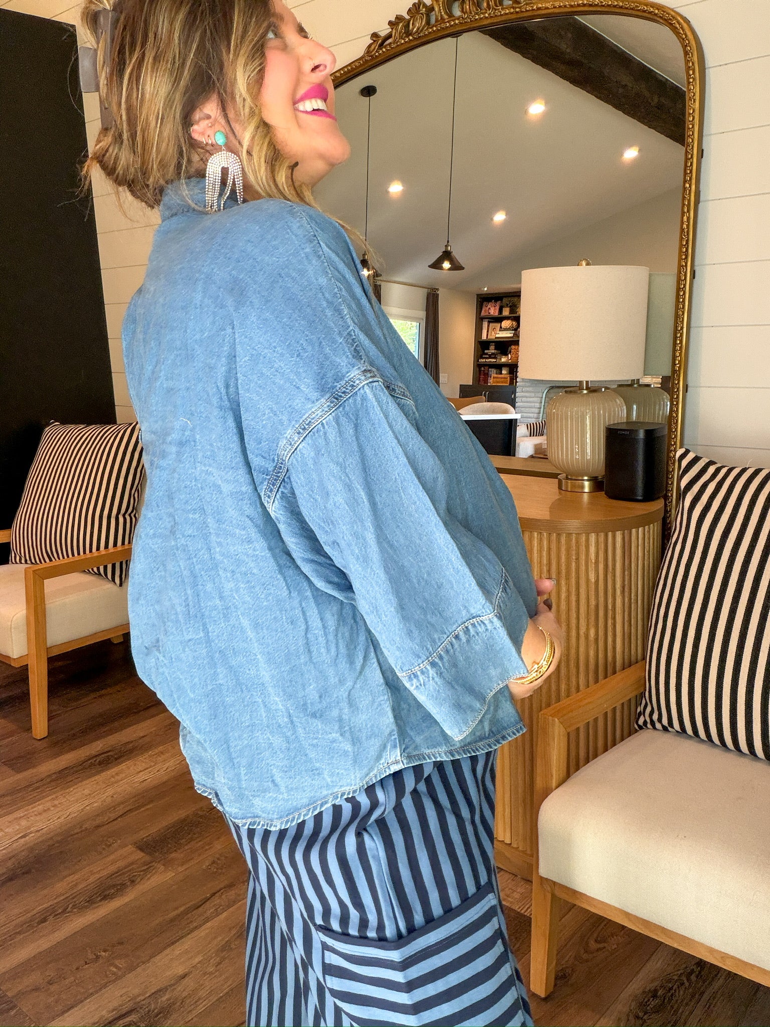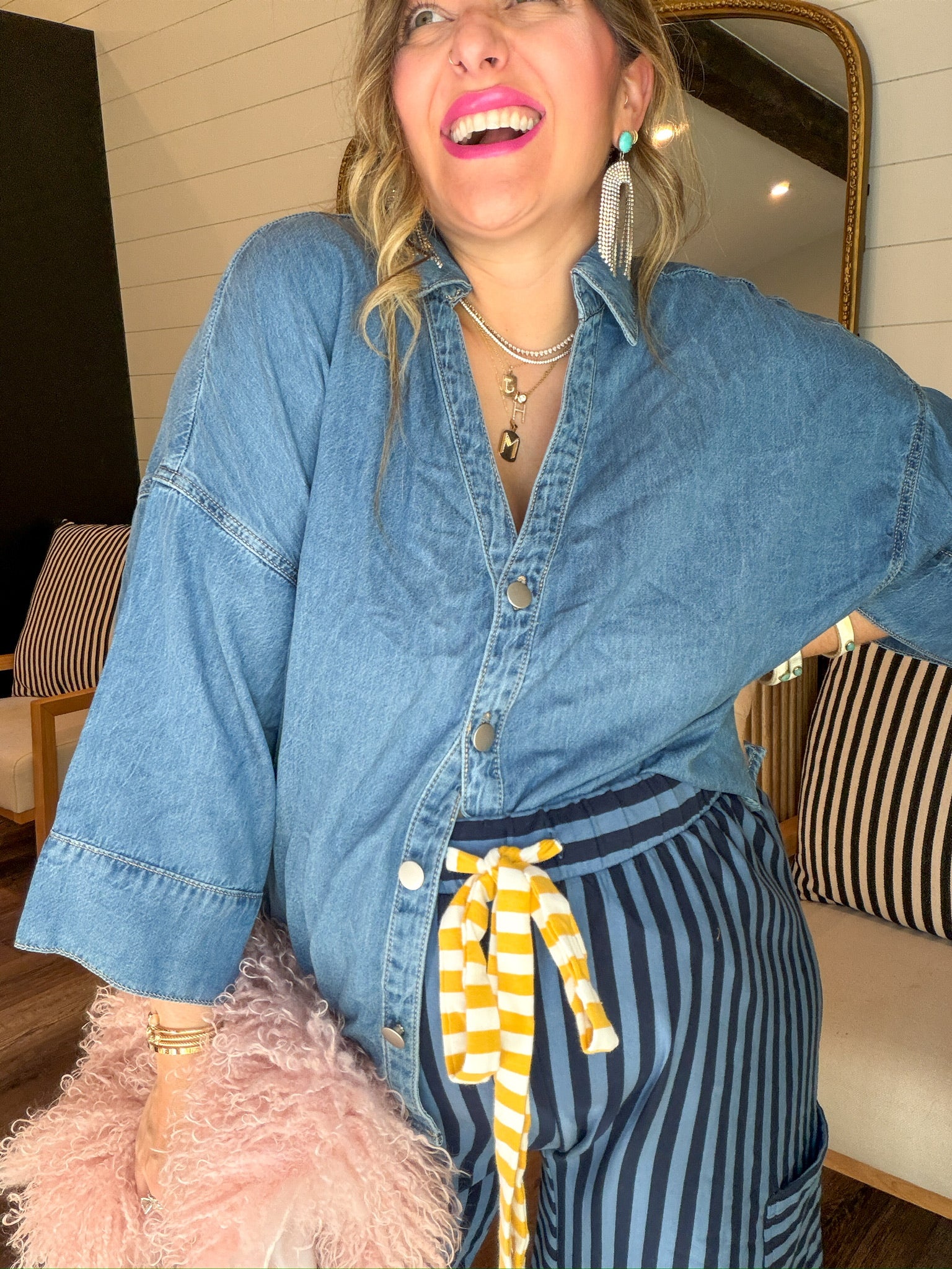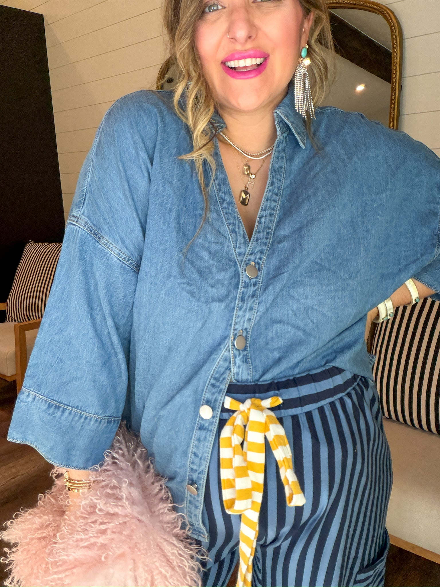 A little Western, a little French-girl, a lot of “I didn’t try and still look cool.” This mineral-wash denim button up brings that perfectly worn-in, soft-denim energy that feels like you snagged it vintage and tailored it to fit just right. Elevated casual, coastal-cowgirl, low-effort/high-impact magic.