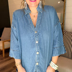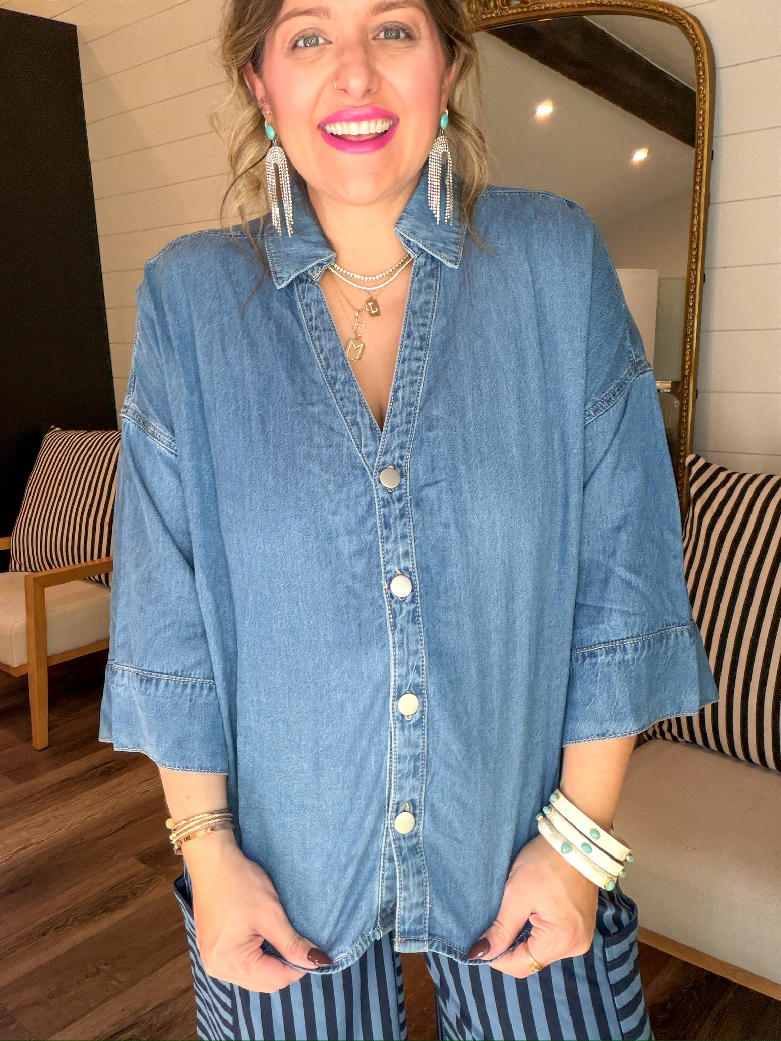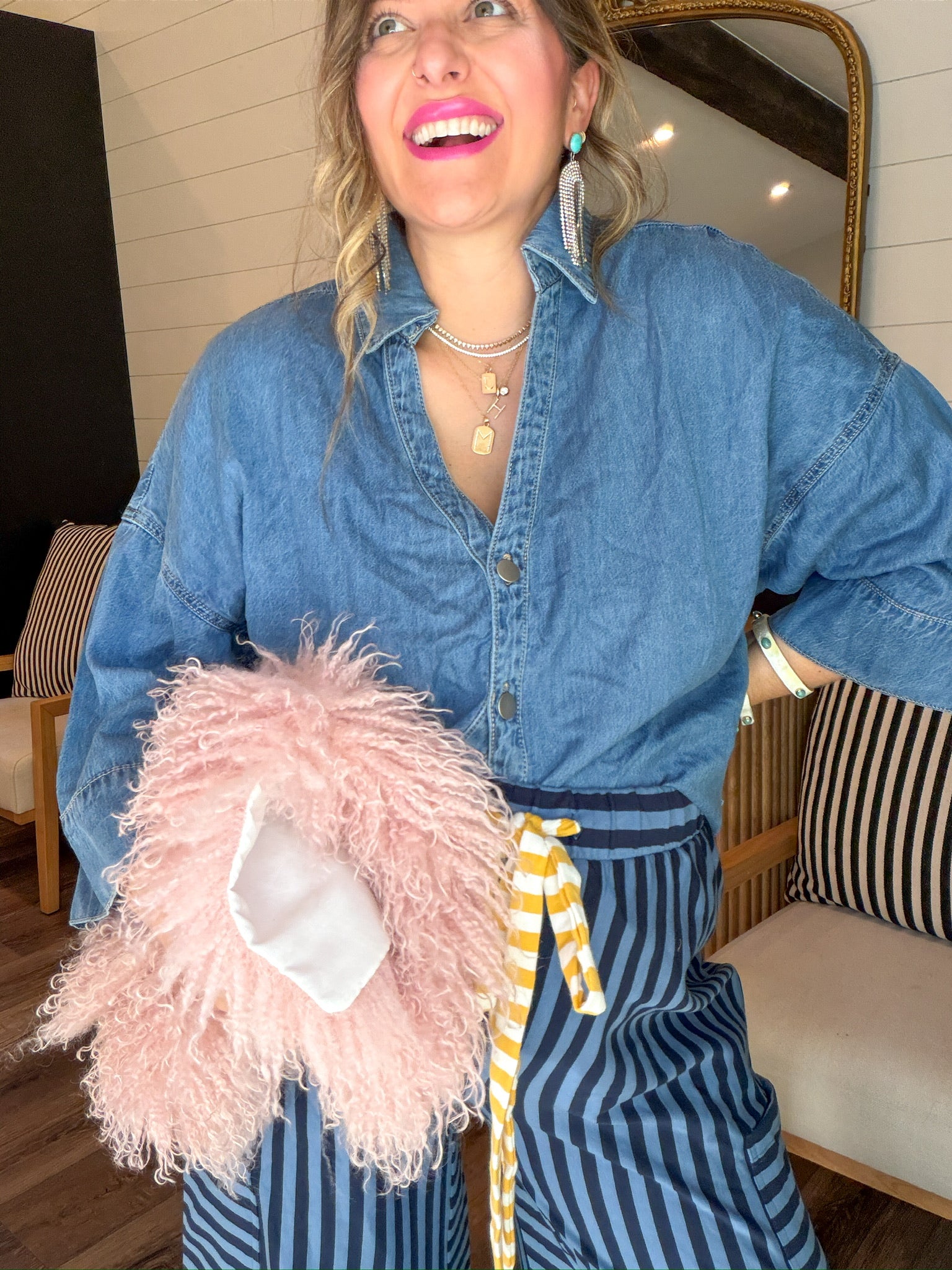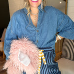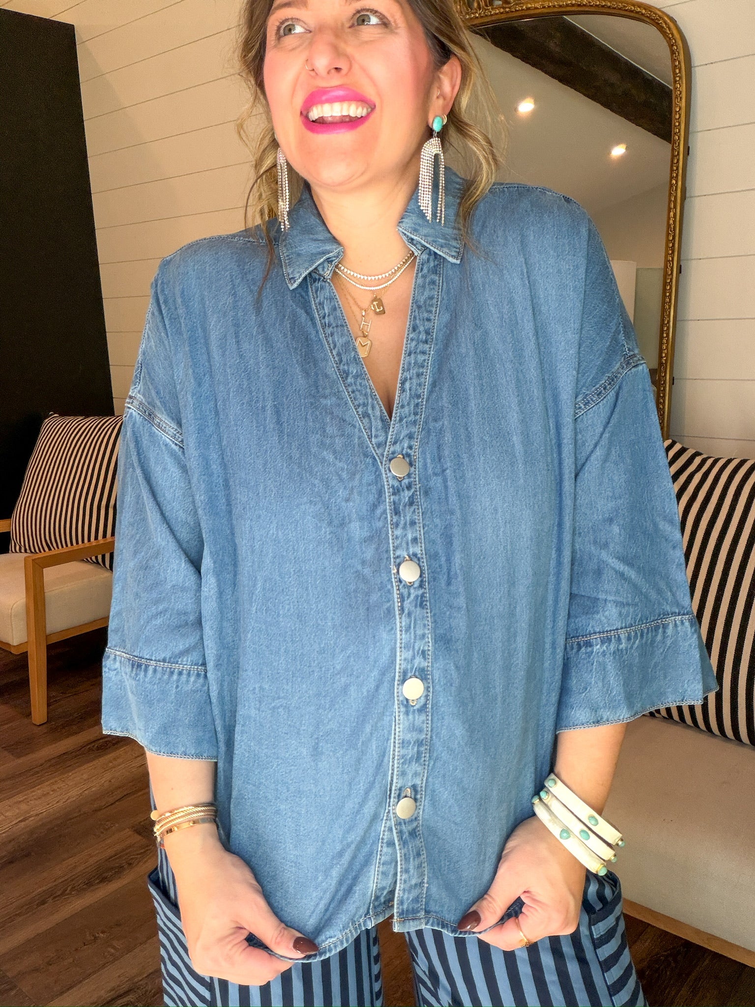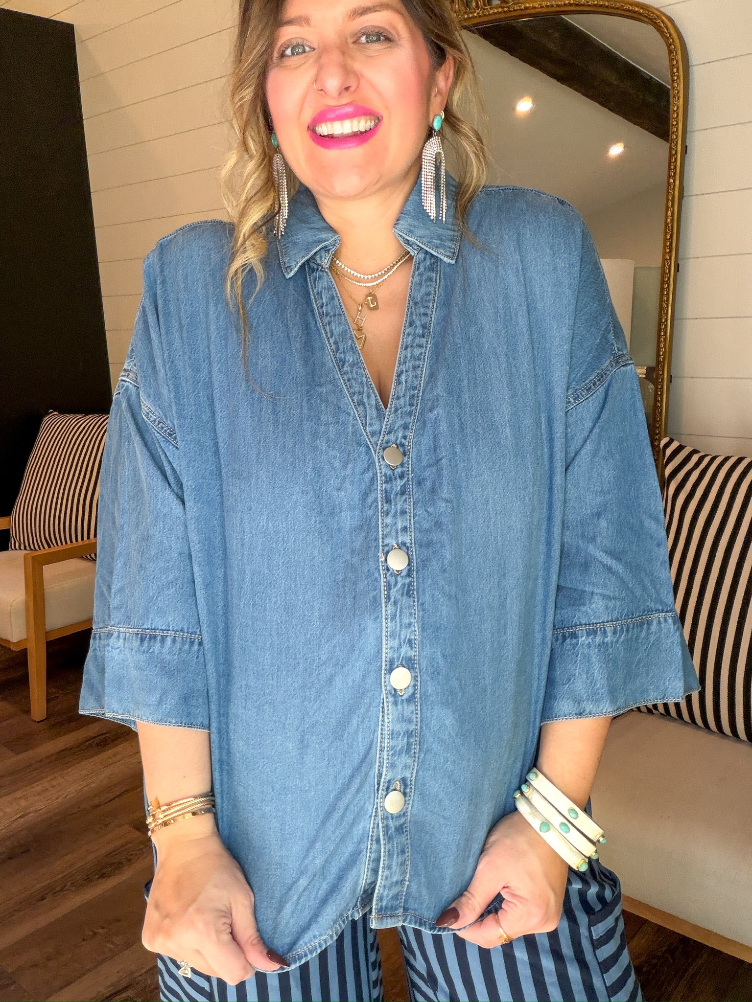 A little Western, a little French-girl, a lot of “I didn’t try and still look cool.” This mineral-wash denim button up brings that perfectly worn-in, soft-denim energy that feels like you snagged it vintage and tailored it to fit just right. Elevated casual, coastal-cowgirl, low-effort/high-impact magic.