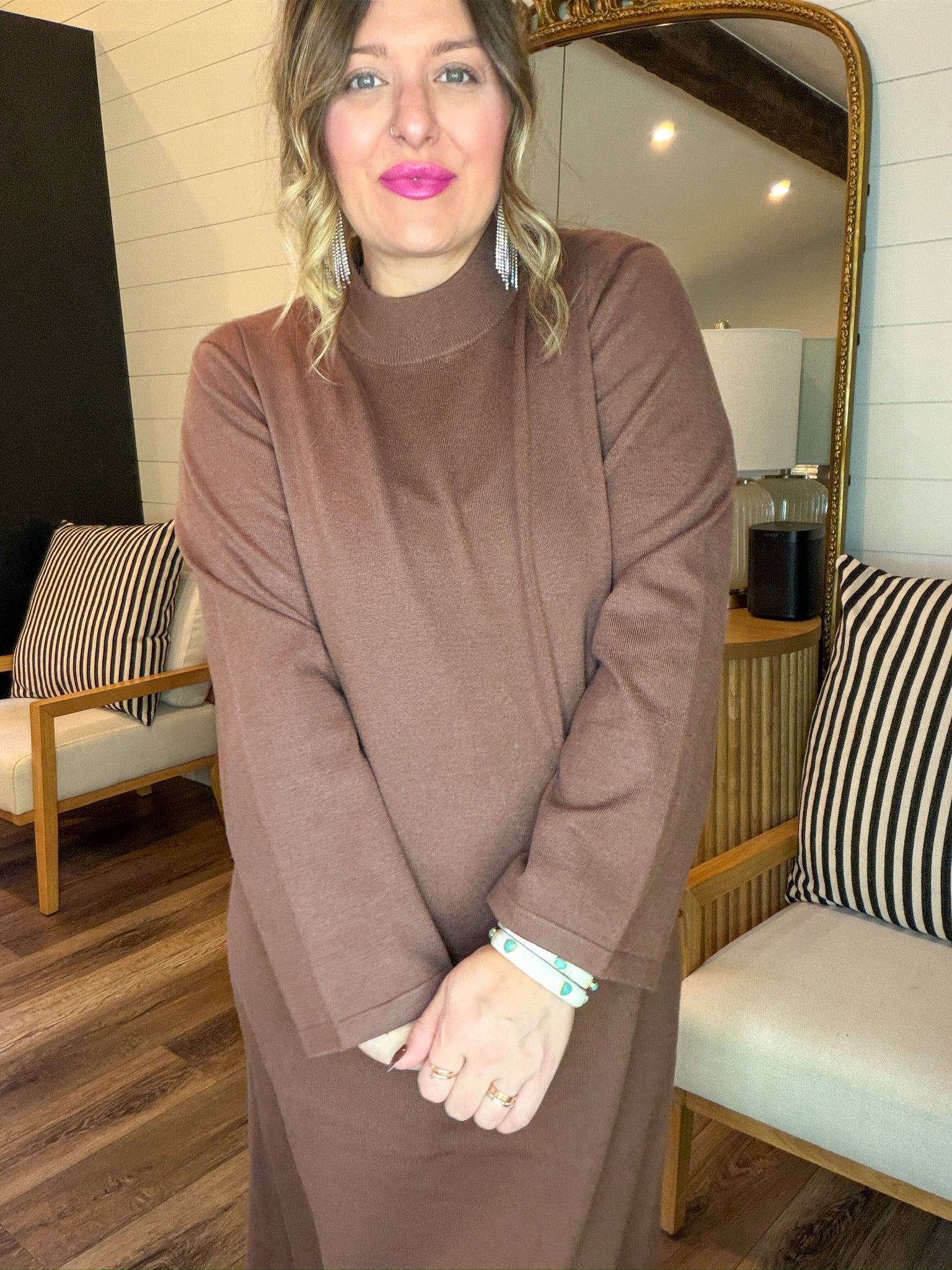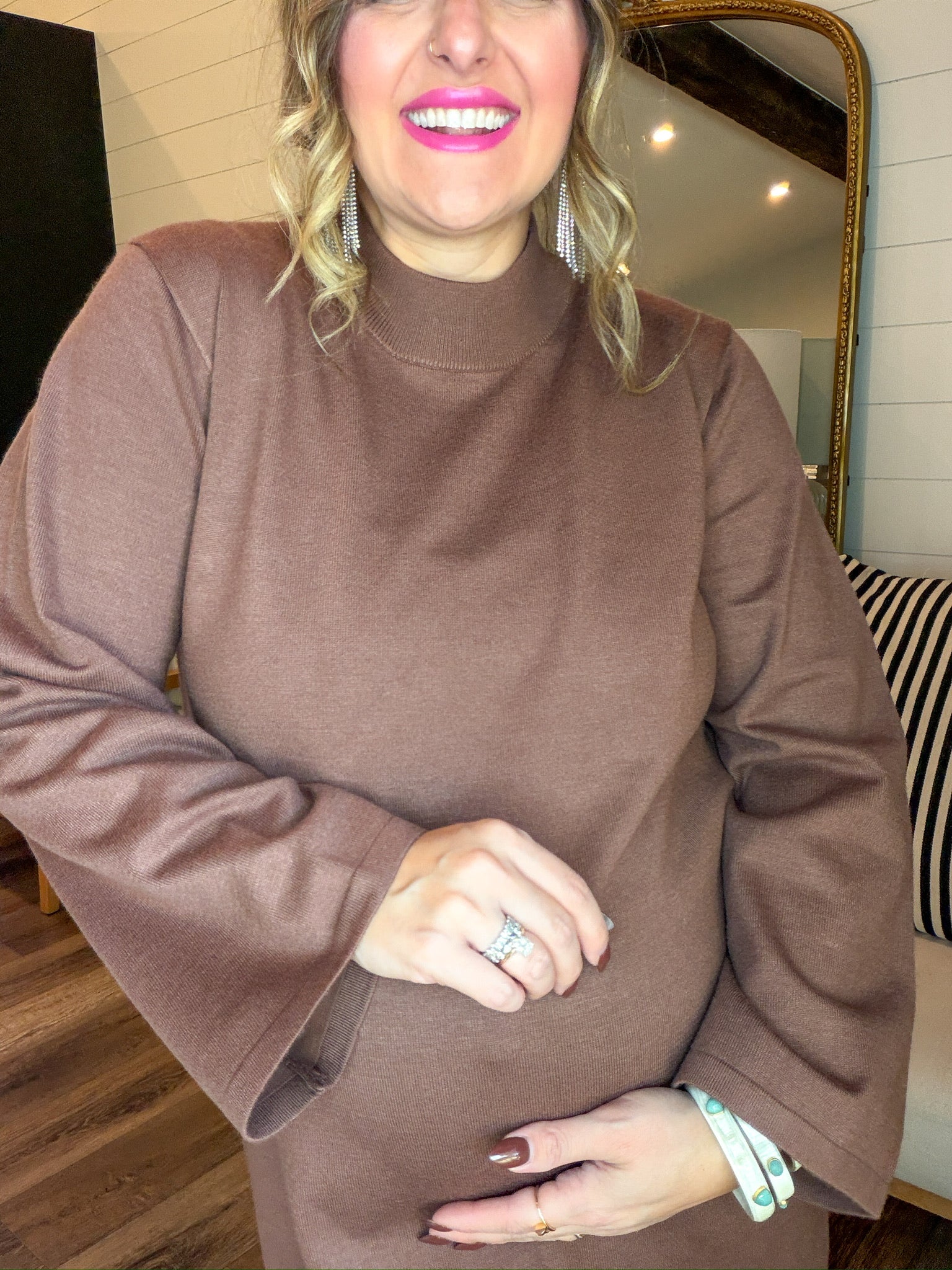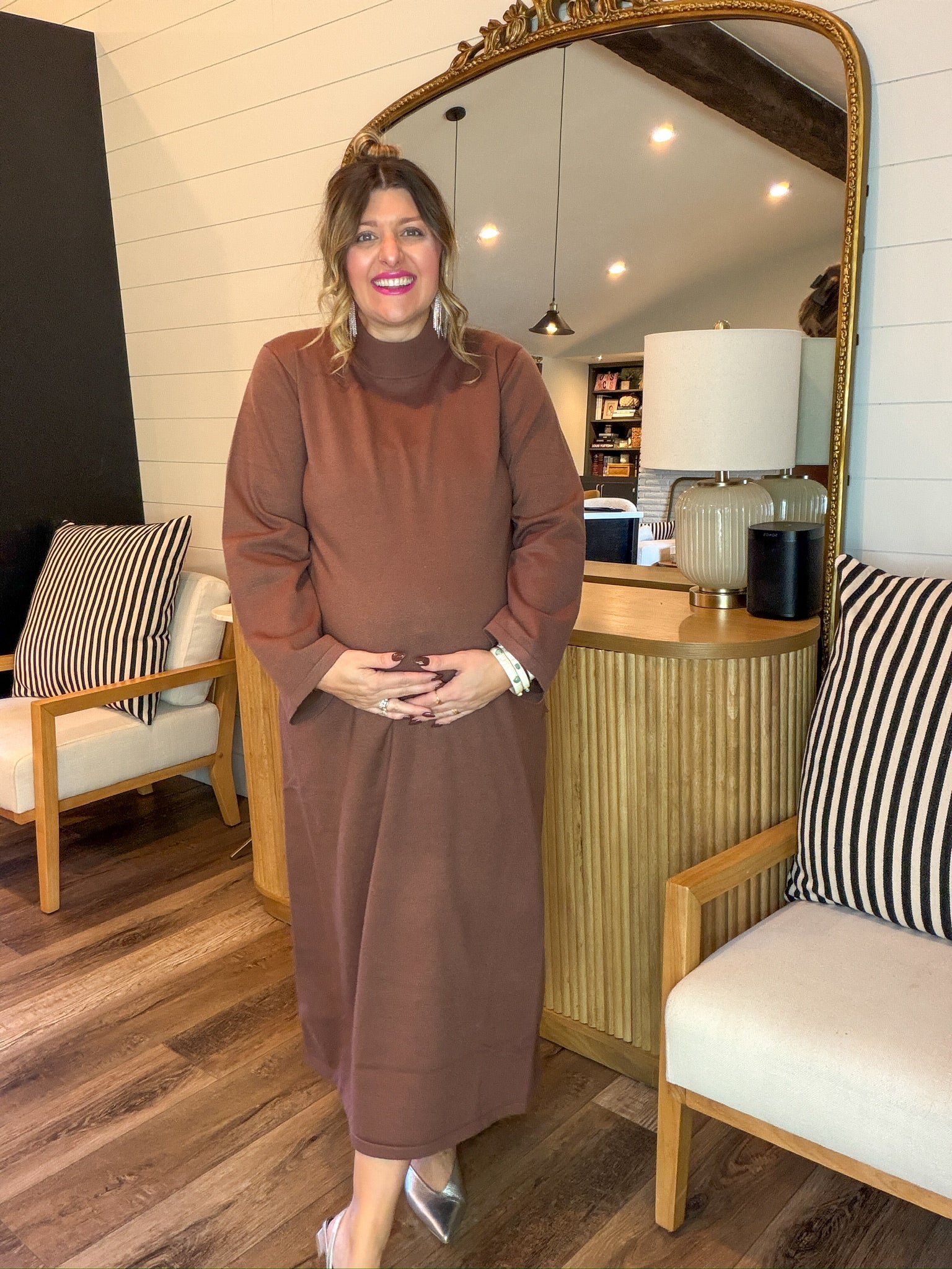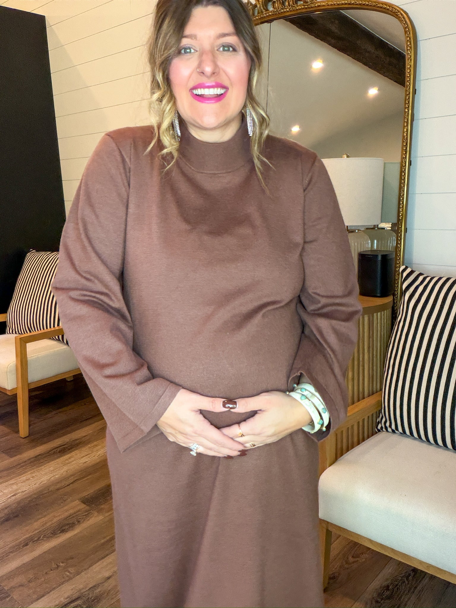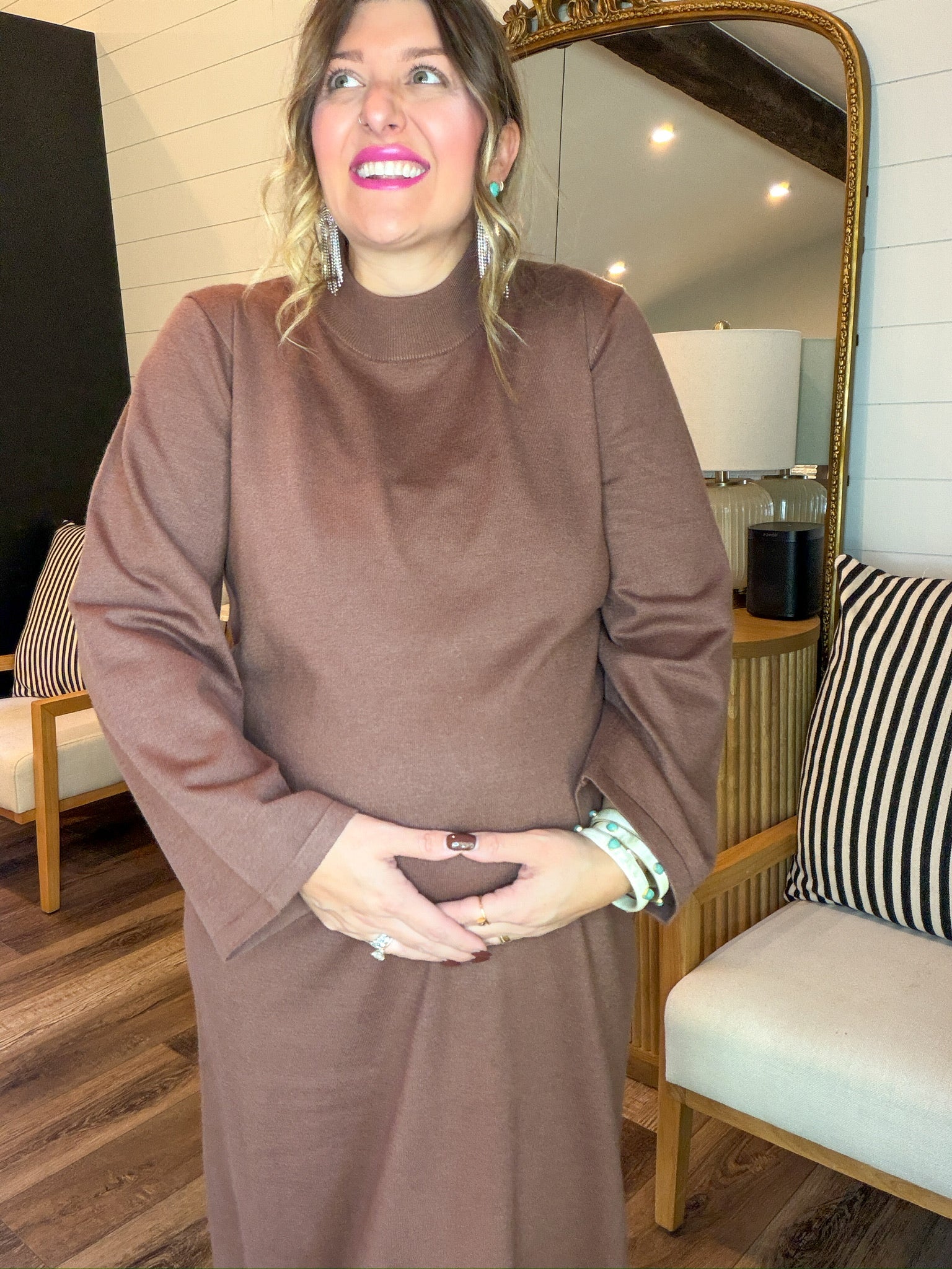 There’s something about this shade that just hits. Soft cocoa vibes. Warm latte energy. The kind of cozy-chic dress you throw on when you’re feeling like a calm, grounded icon who definitely reads self-help books but also gatekeeps her favorite coffee shop. It’s minimal, plush, and secretly the comfiest power move in your closet. This is your “I woke up serene and I’m choosing softness today” dress.