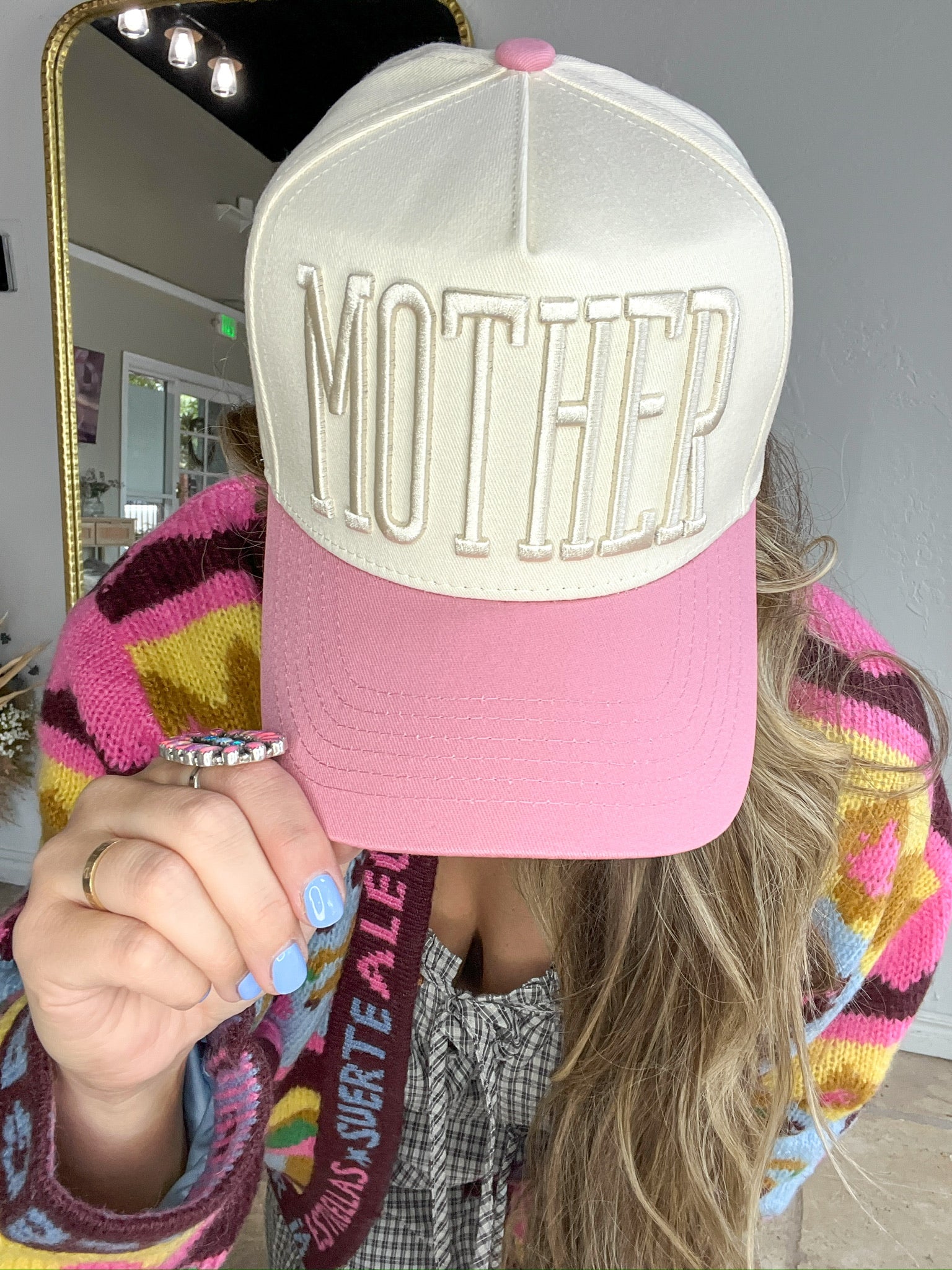 For the moms who do it all—and want the world to know. This cream-and-pink trucker hat is embroidered with bold puff-stitch lettering that reads simply: MOTHER. Because, let’s be honest, that’s a whole vibe in itself. Strong, stylish, and soft in the right places—just like the woman who wears it.