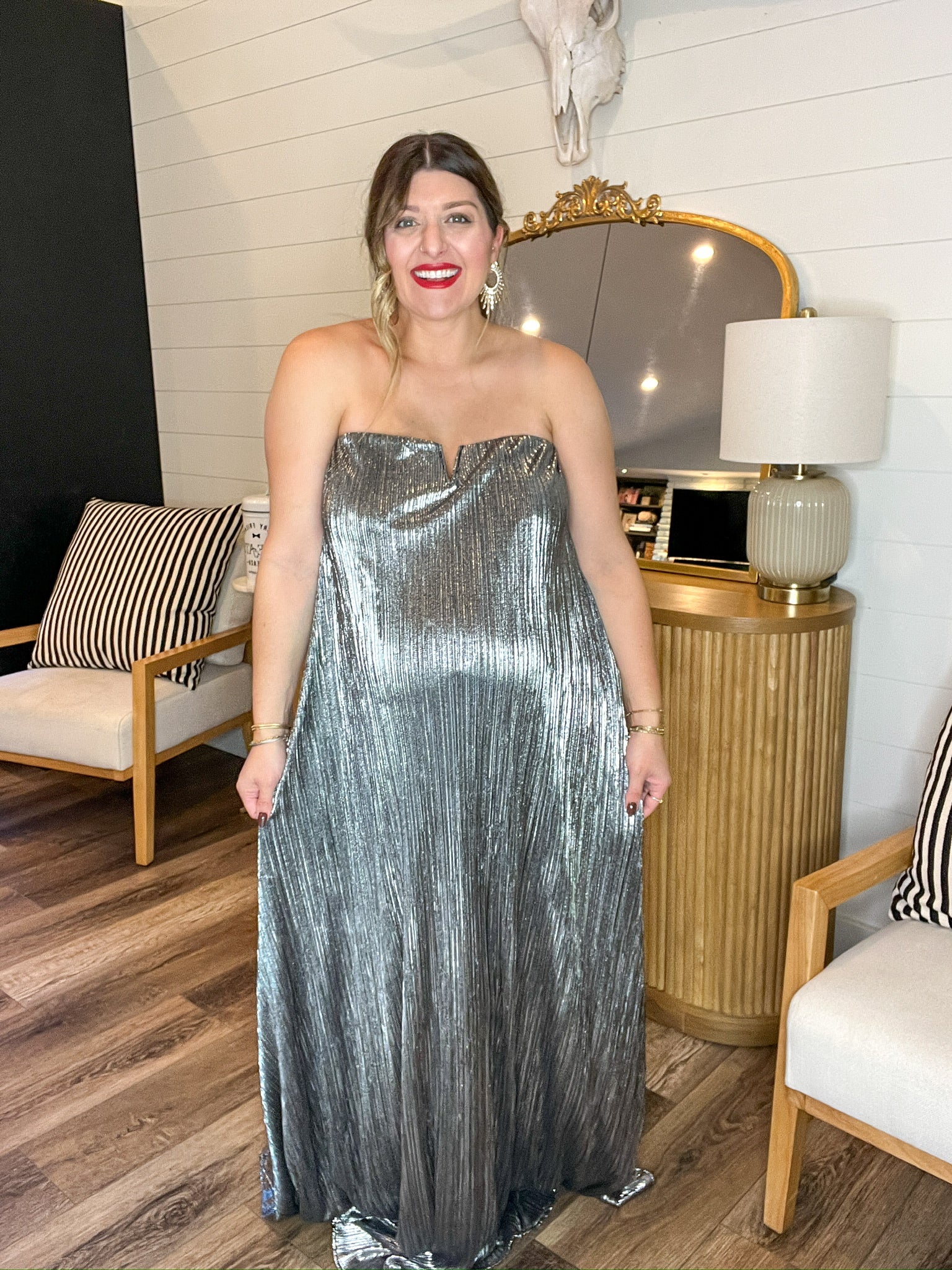 Meet Athena, your go-to for party season! This perfectly draped gown in dreamy pleated silver fabric features a notched strapless neckline and flows like liquid silver - equal parts dreamy and dramatic!