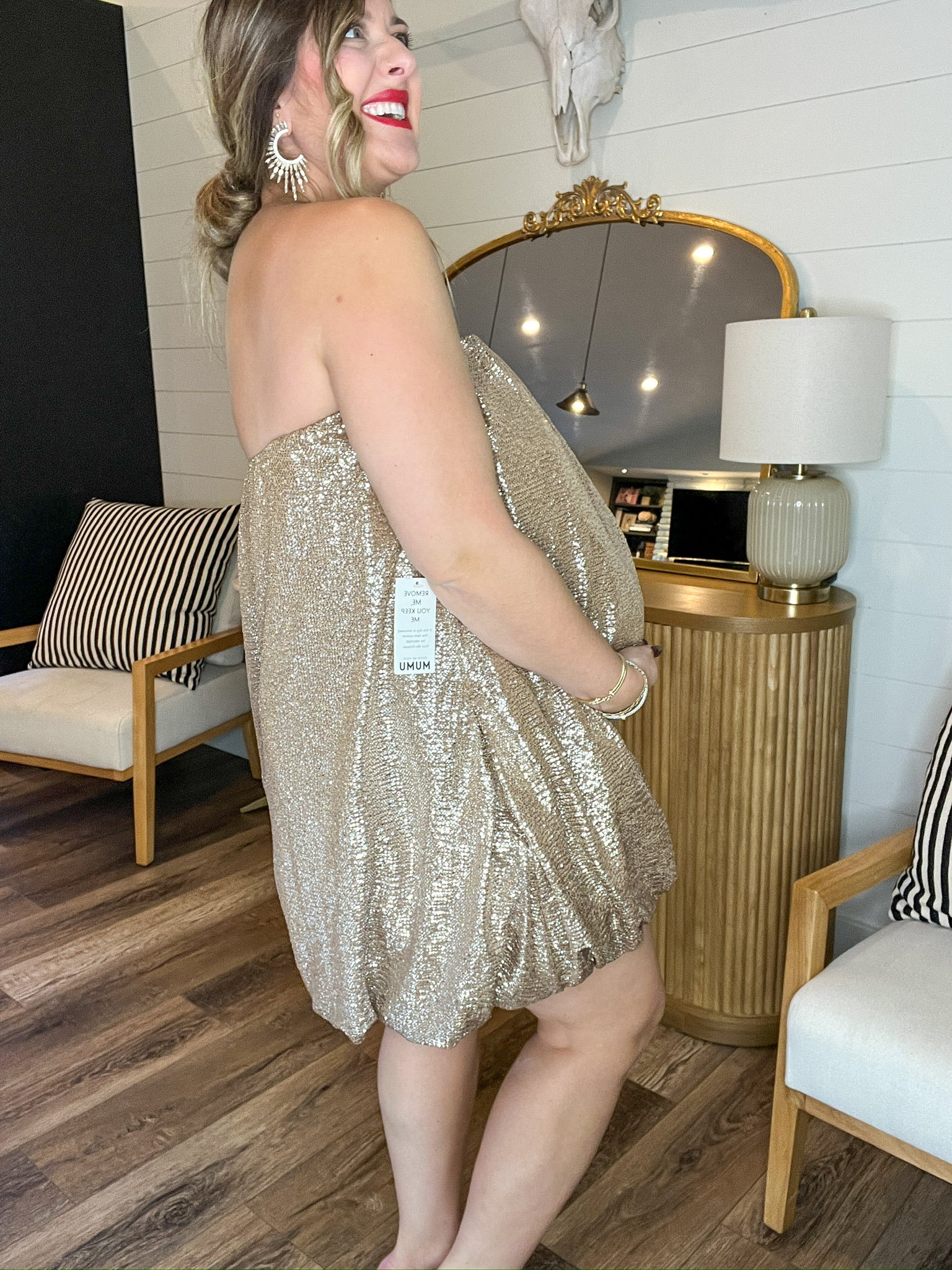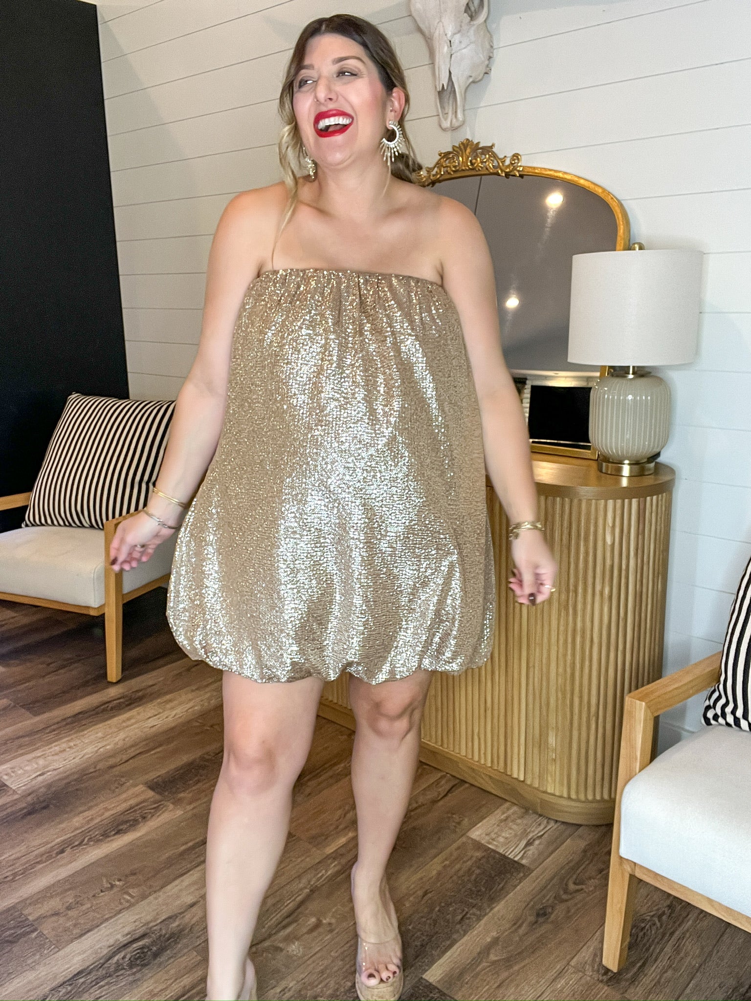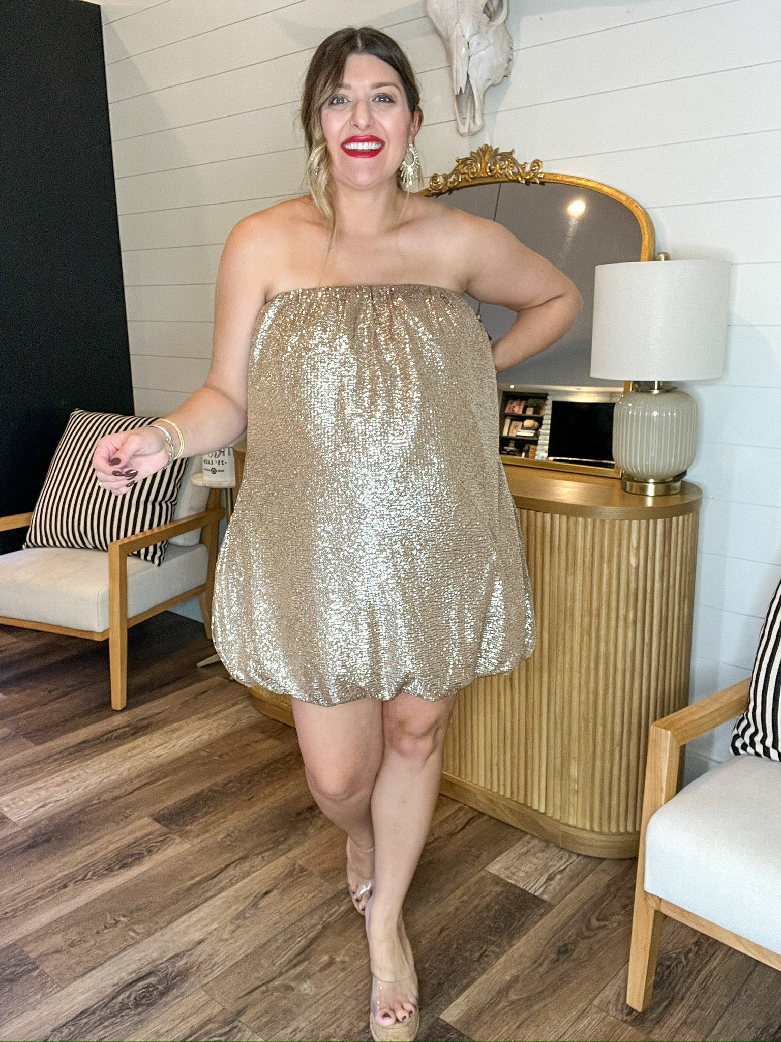 All that glitters really is gold with our Beverly Bubble Dress — the ultimate showstopper for any party, date night, or celebration that calls for sparkle. With a strapless neckline, A-line silhouette, and banded bubble hem, this dress is playful, flirty, and designed to catch the light (and attention).