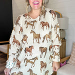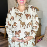 A little bit wild, a whole lot cozy — the Bonfire Sweater is made for slow mornings, starry nights, and everything in between. Its galloping horse print brings that western wanderlust vibe, while the soft knit and relaxed fit keep it comfy enough to live in. Basically, it’s your new go-to for every “throw on and go” moment.