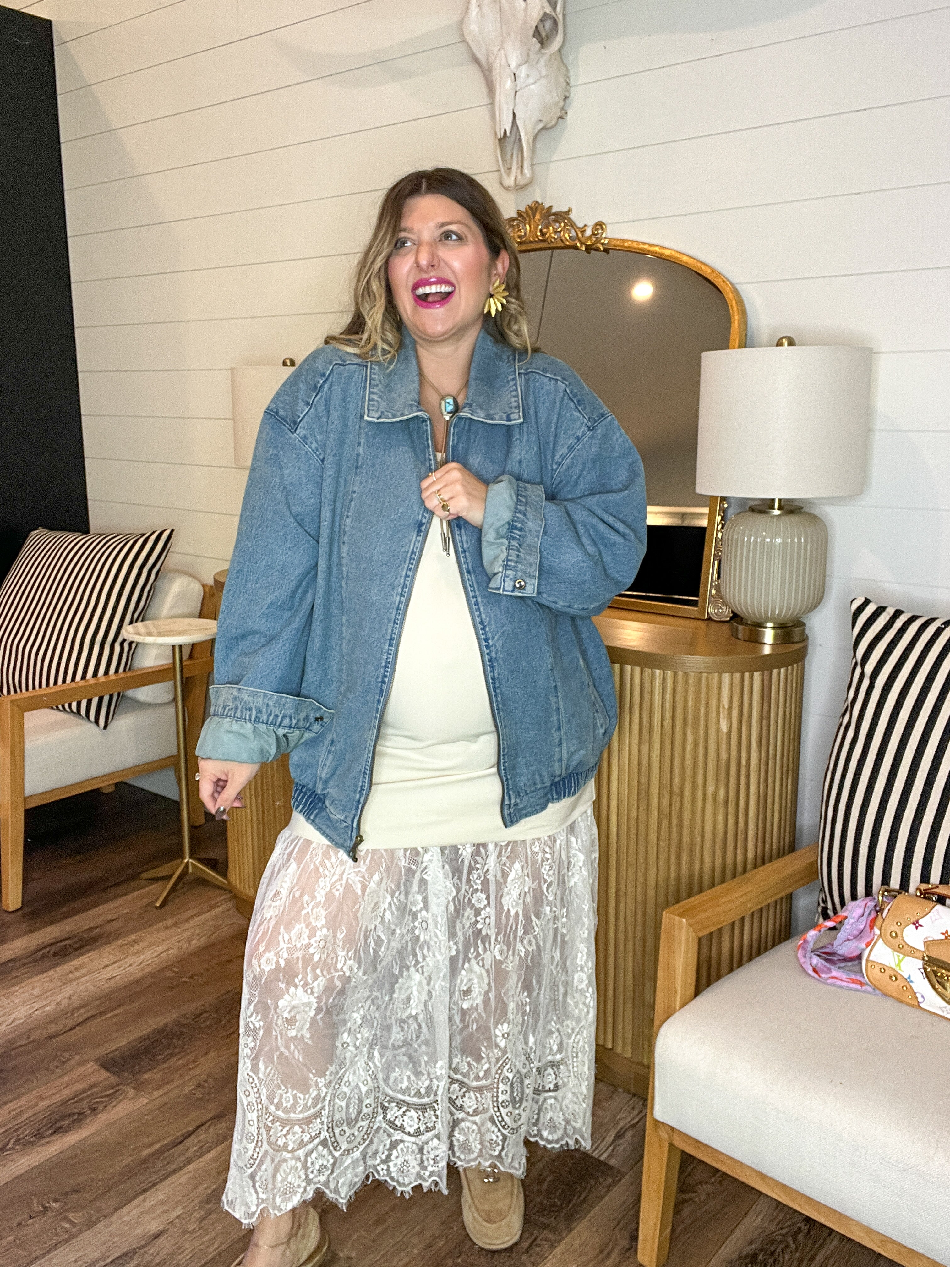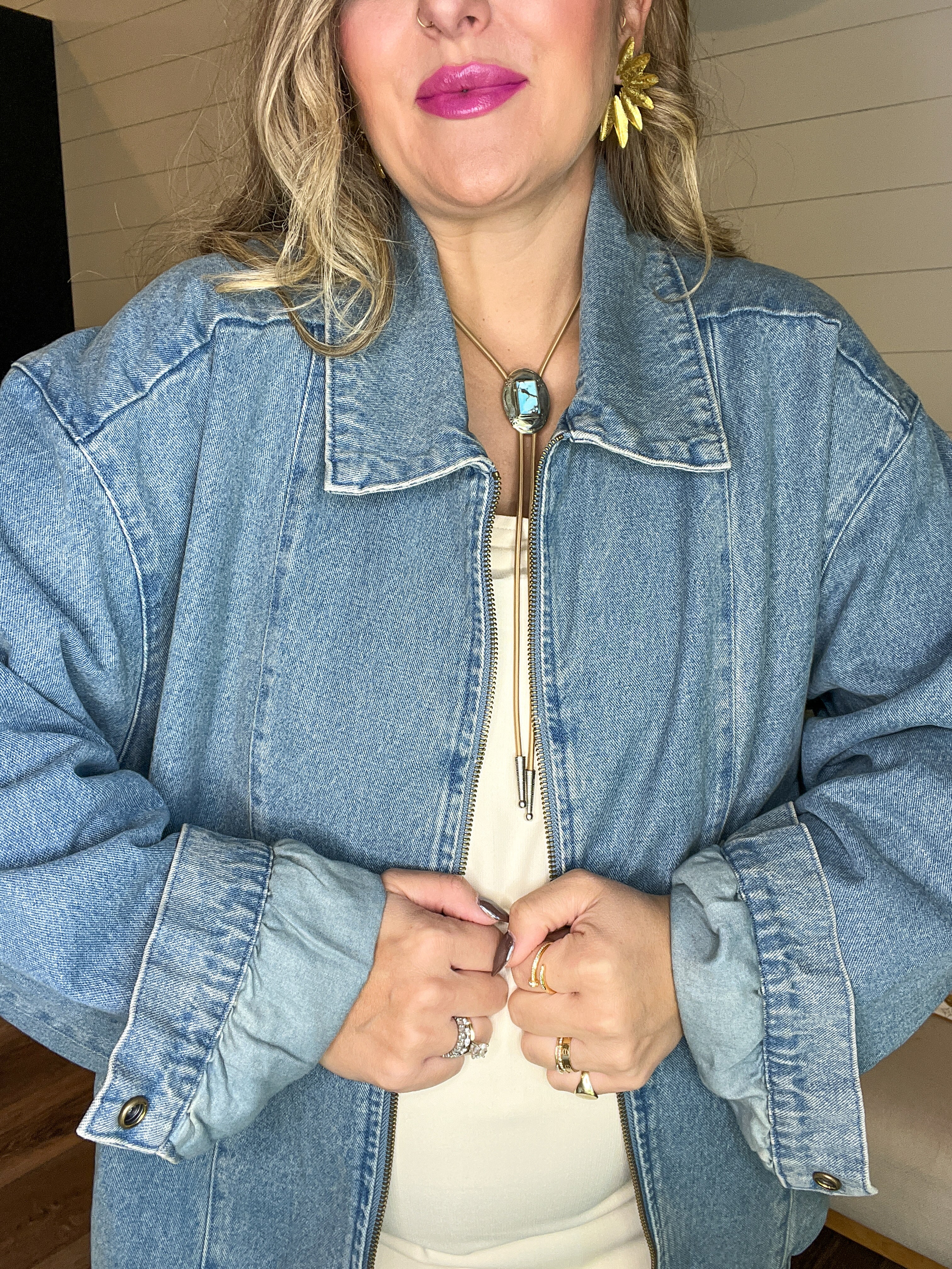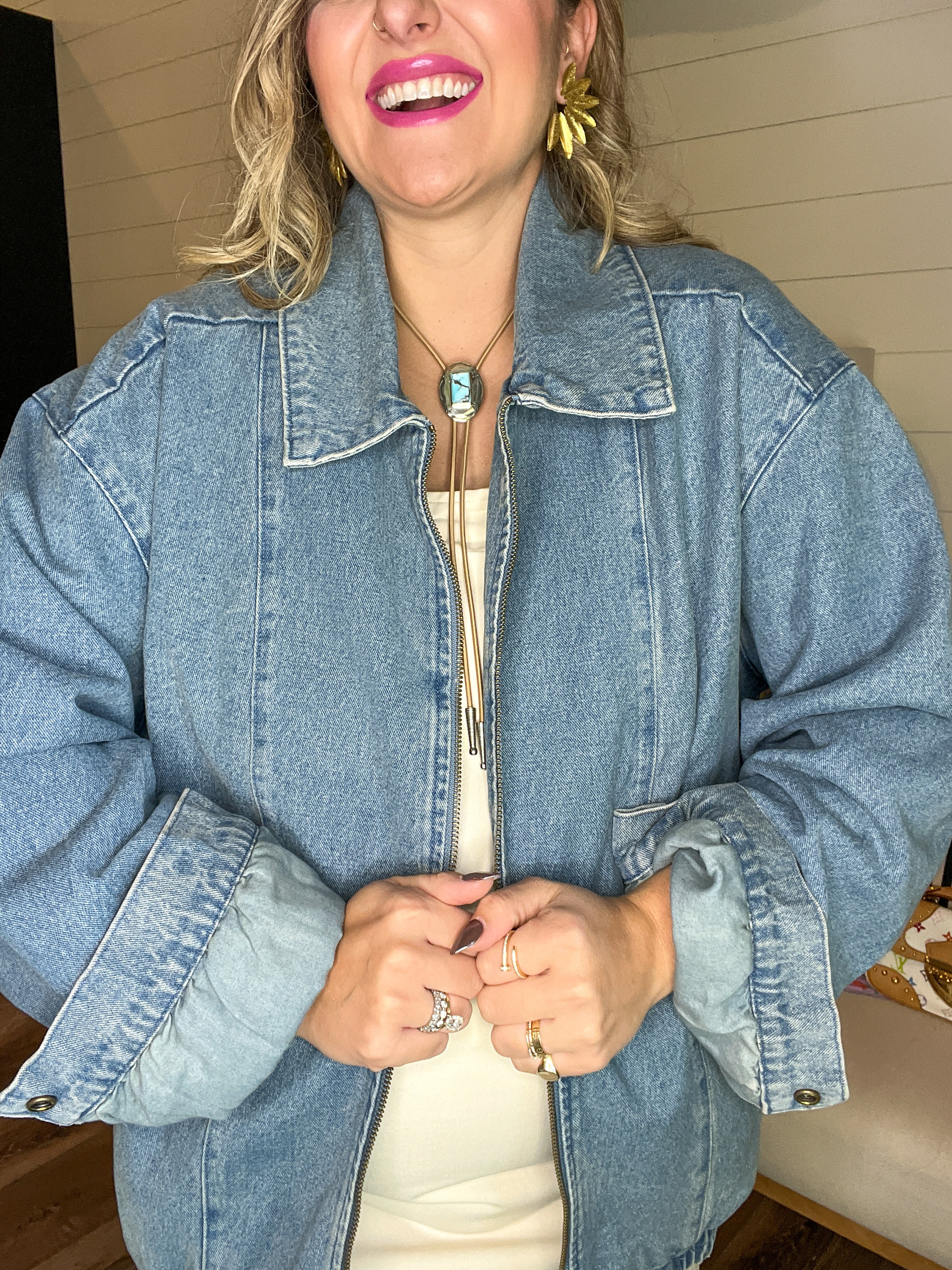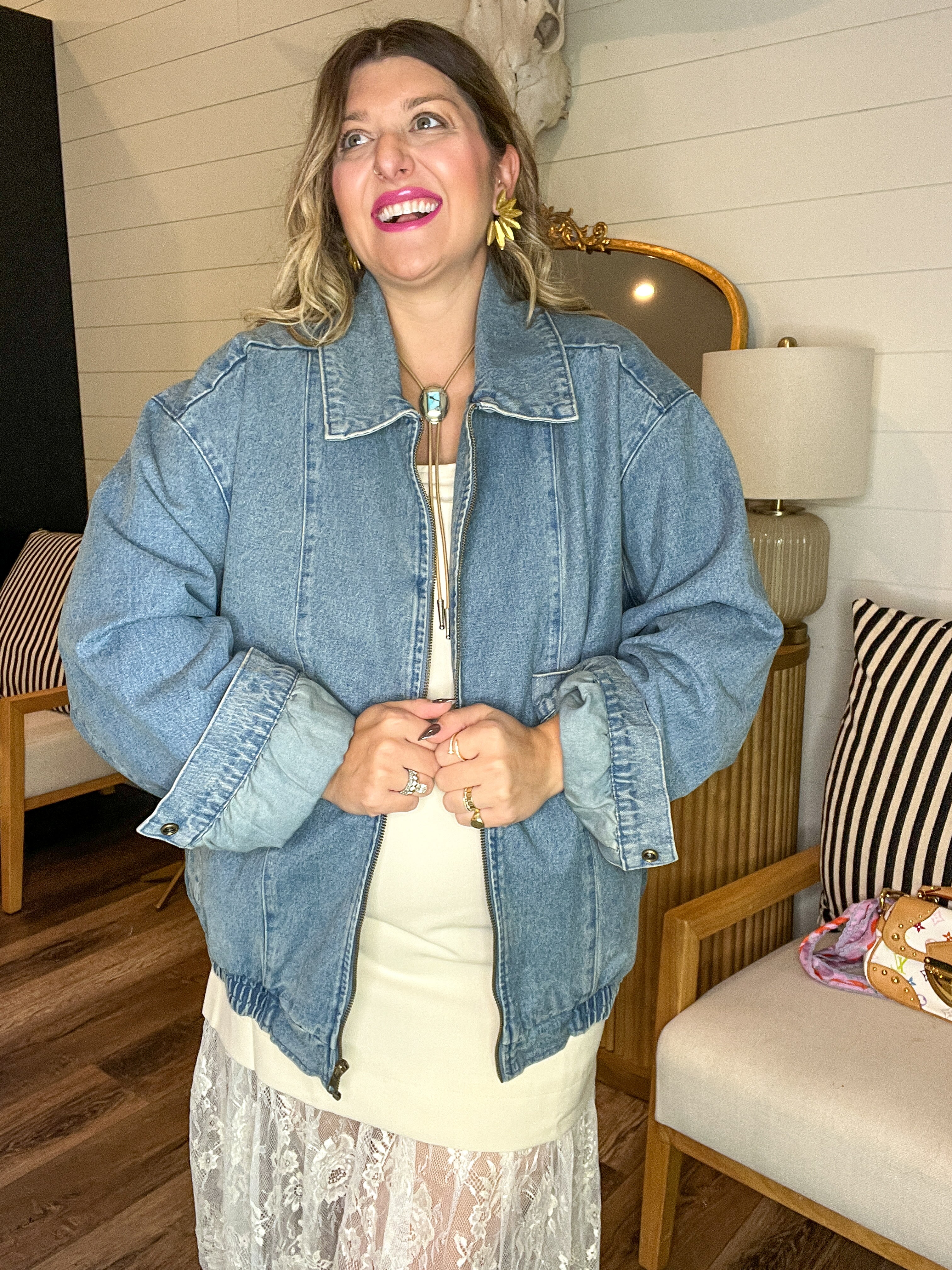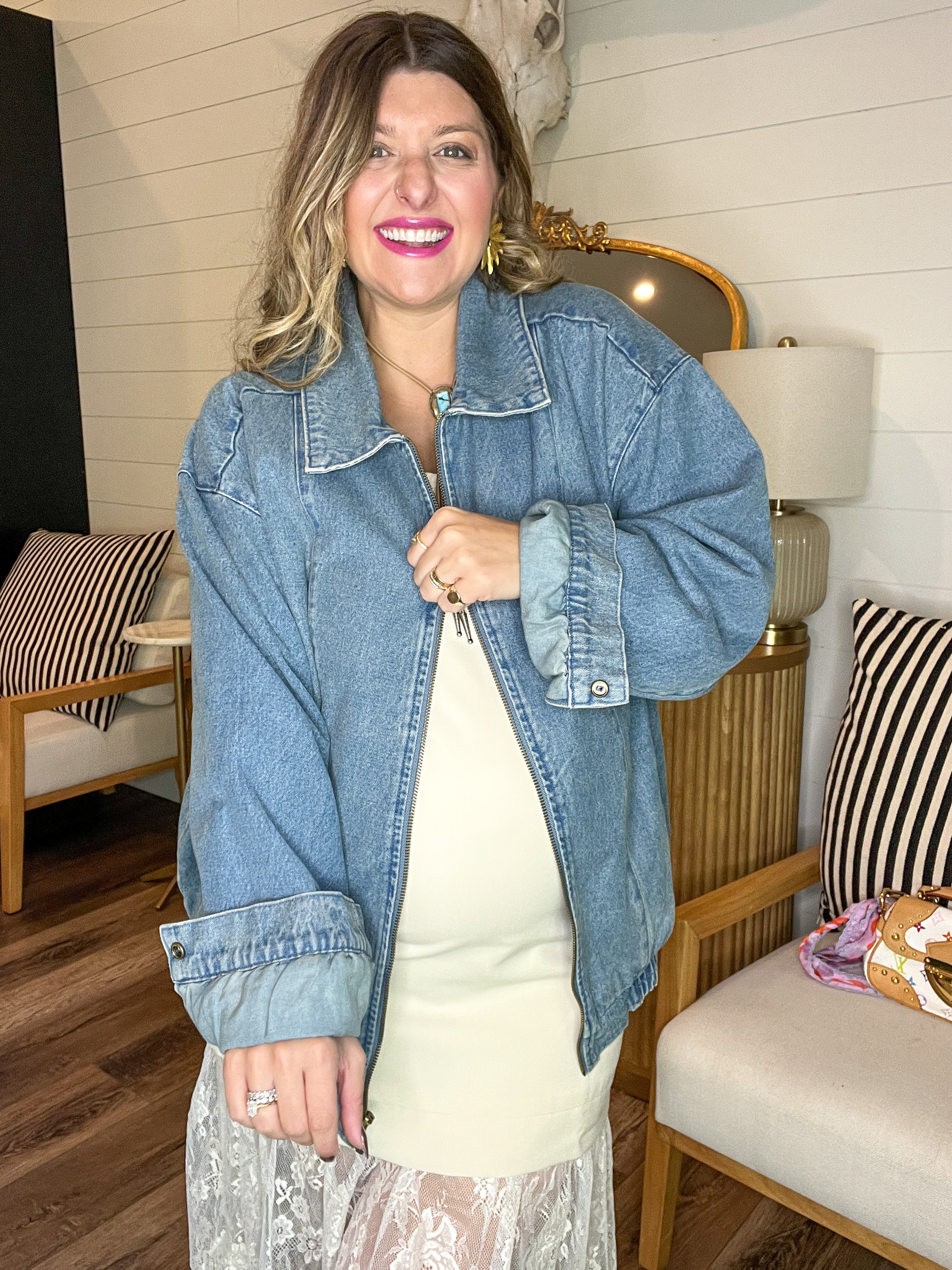 The Carter Bomber Jacket is serving all the vintage vibes. With its collared neckline, zip-up front, side slip pockets, and elastic hem, it’s got that throwback 90s feel you’ll keep reaching for. An effortless layer that looks just as good tossed over a slip dress as it does with your favorite denim.