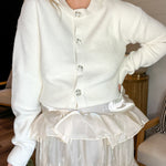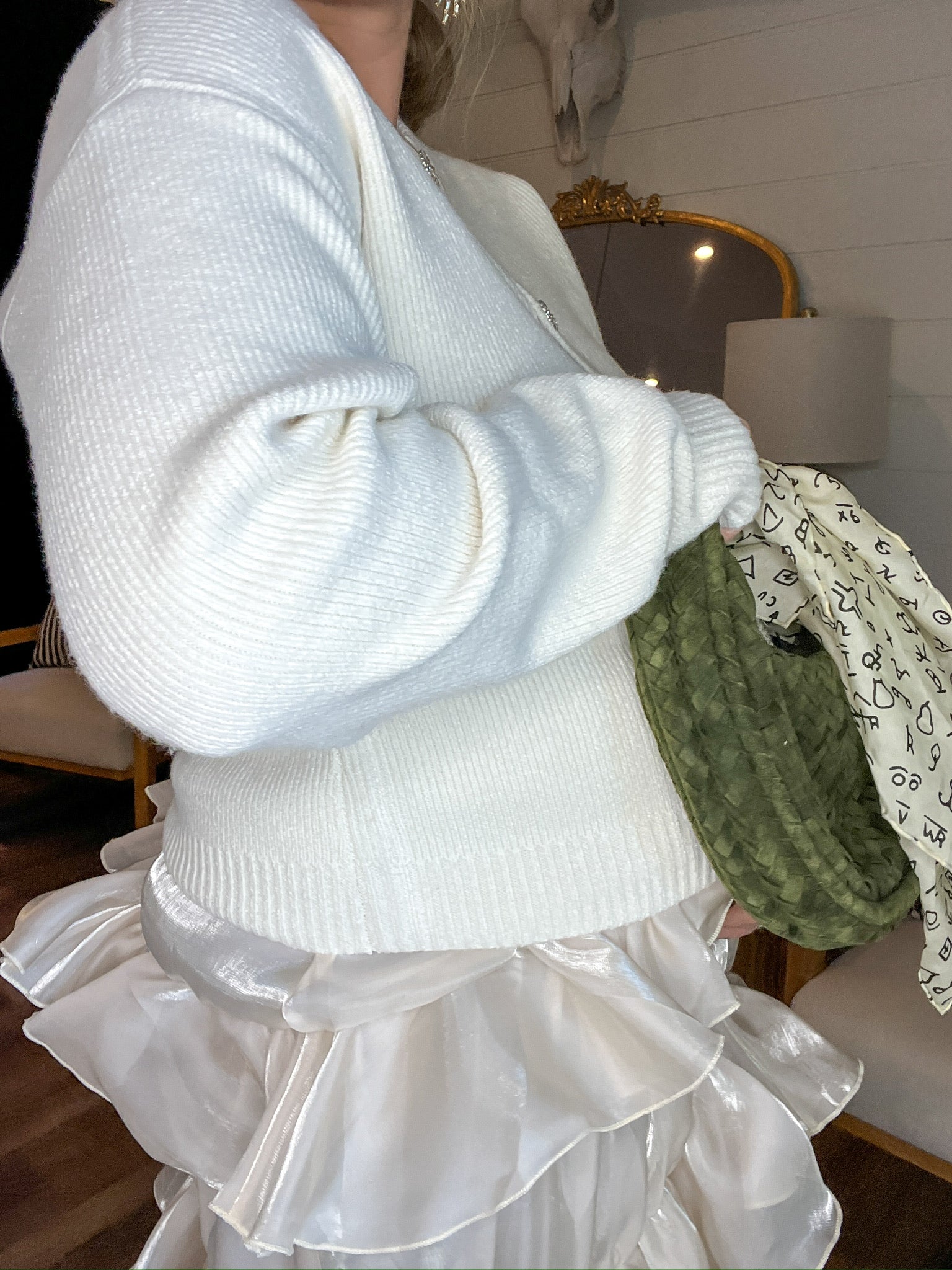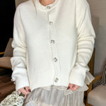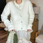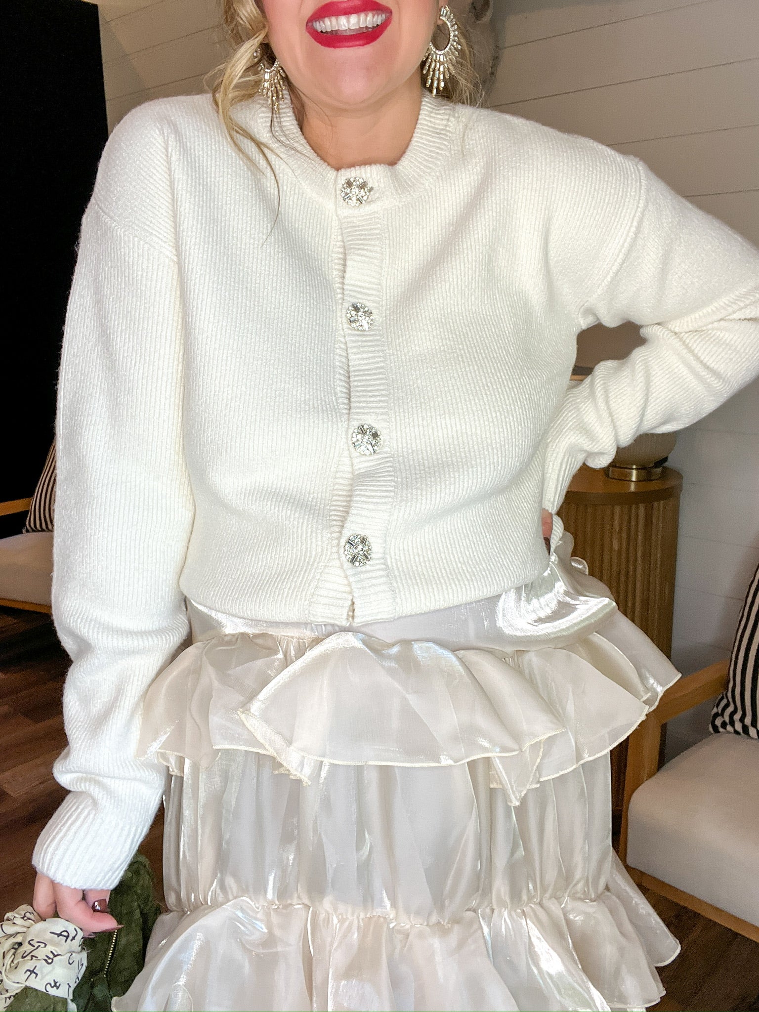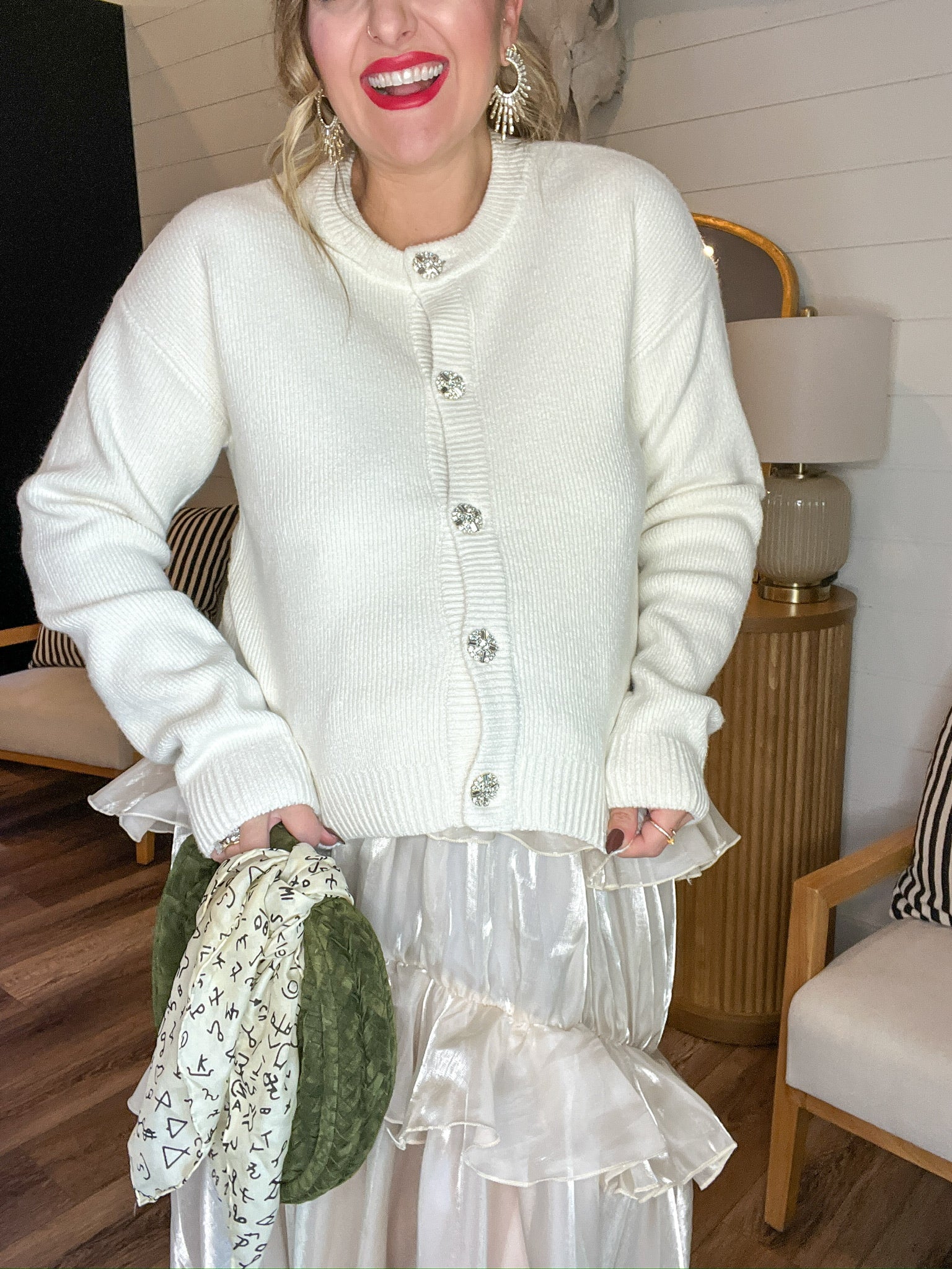 Add a touch of glam to any look with the Maggie Cardigan! This cream knit gets a playful upgrade with rhinestone-encrusted buttons that bring just the right amount of sparkle. Perfect with high-waisted skirts, denim, or layered over a slip dress, it’s the versatile piece that instantly makes any outfit more polished.