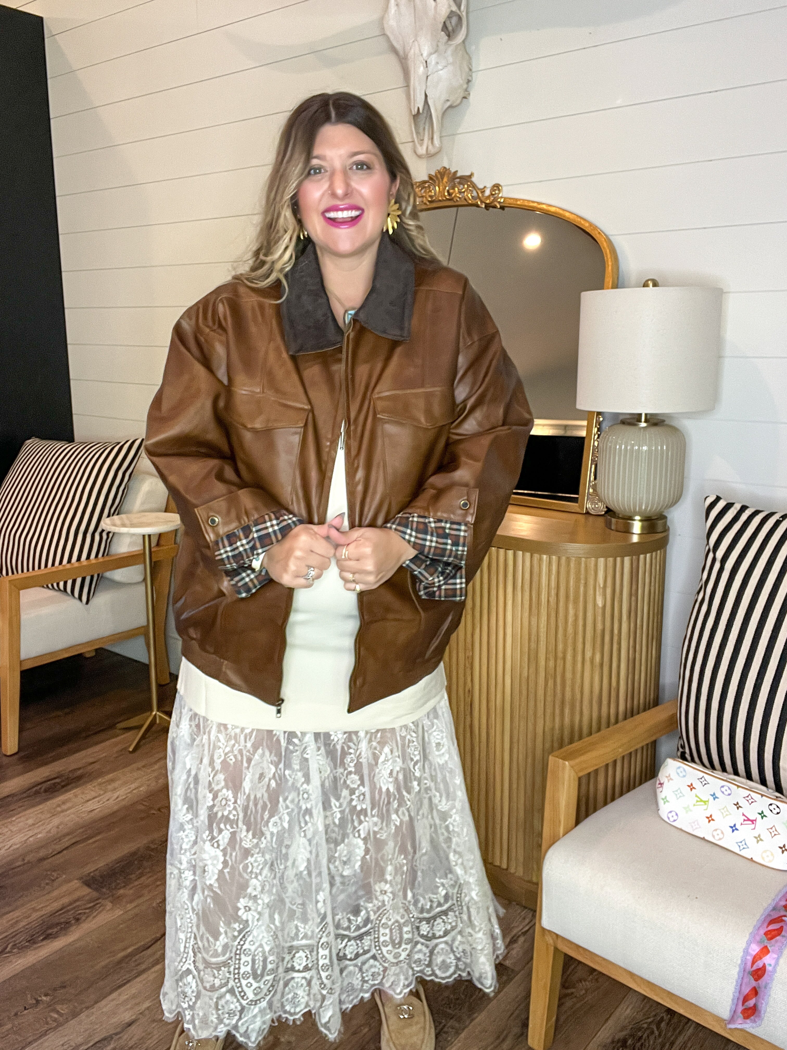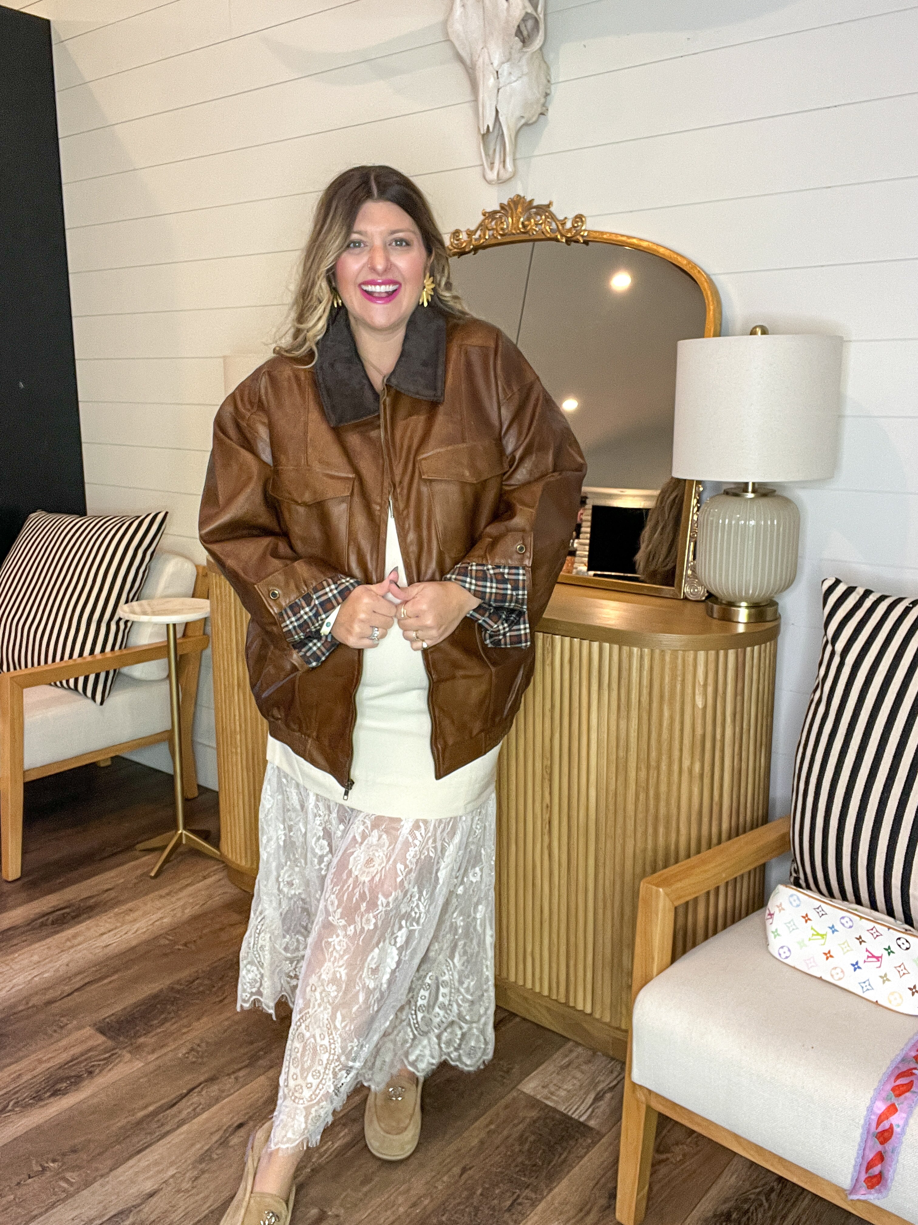 The jacket that steals the spotlight — meet the Maverick Bomber. Crafted in a buttery chestnut faux leather with a structured, oversized fit, this piece nails that cool-girl western edge with city polish. With functional pockets, a soft contrast collar, and just the right amount of attitude, this one’s built to turn heads.