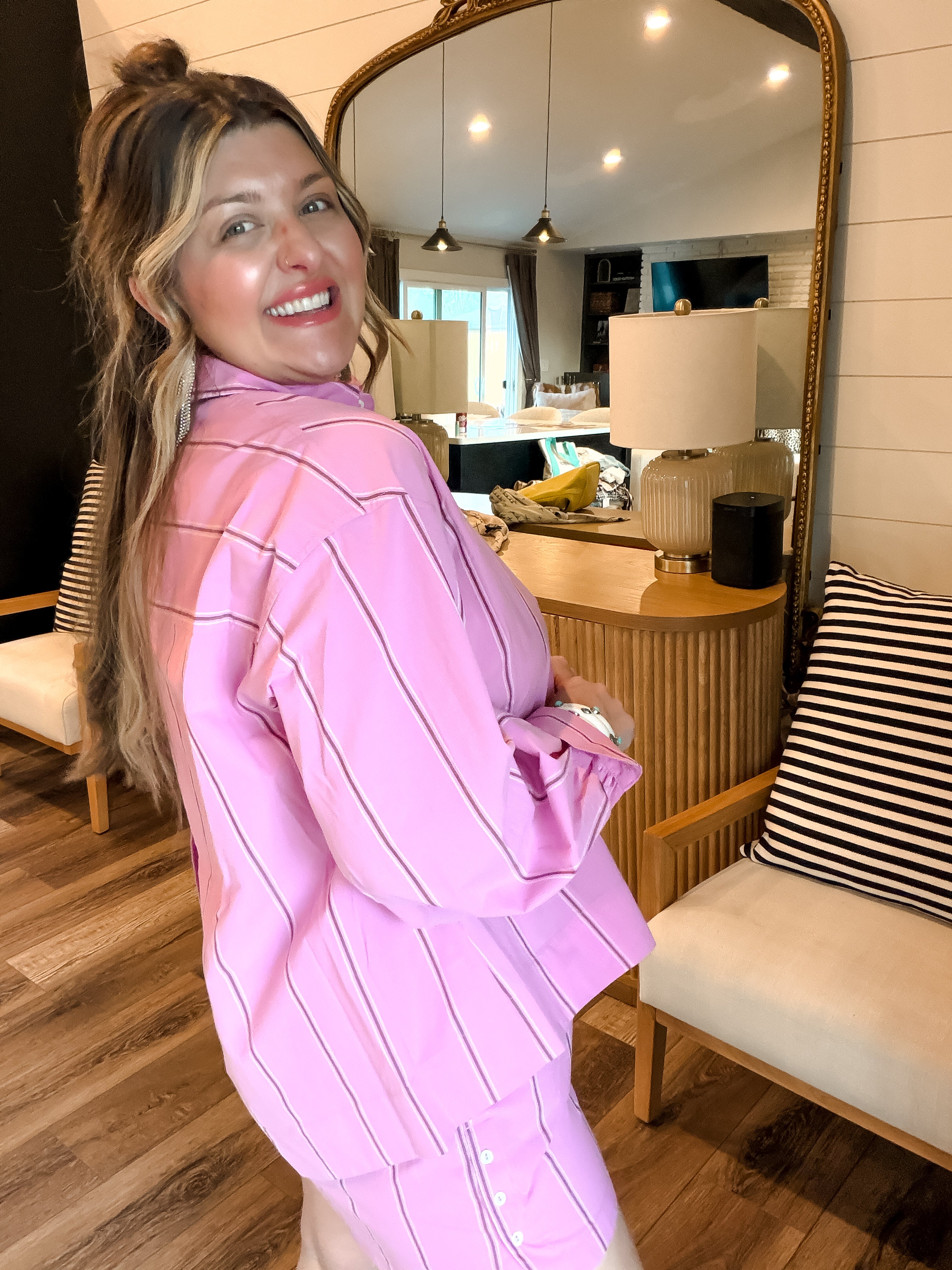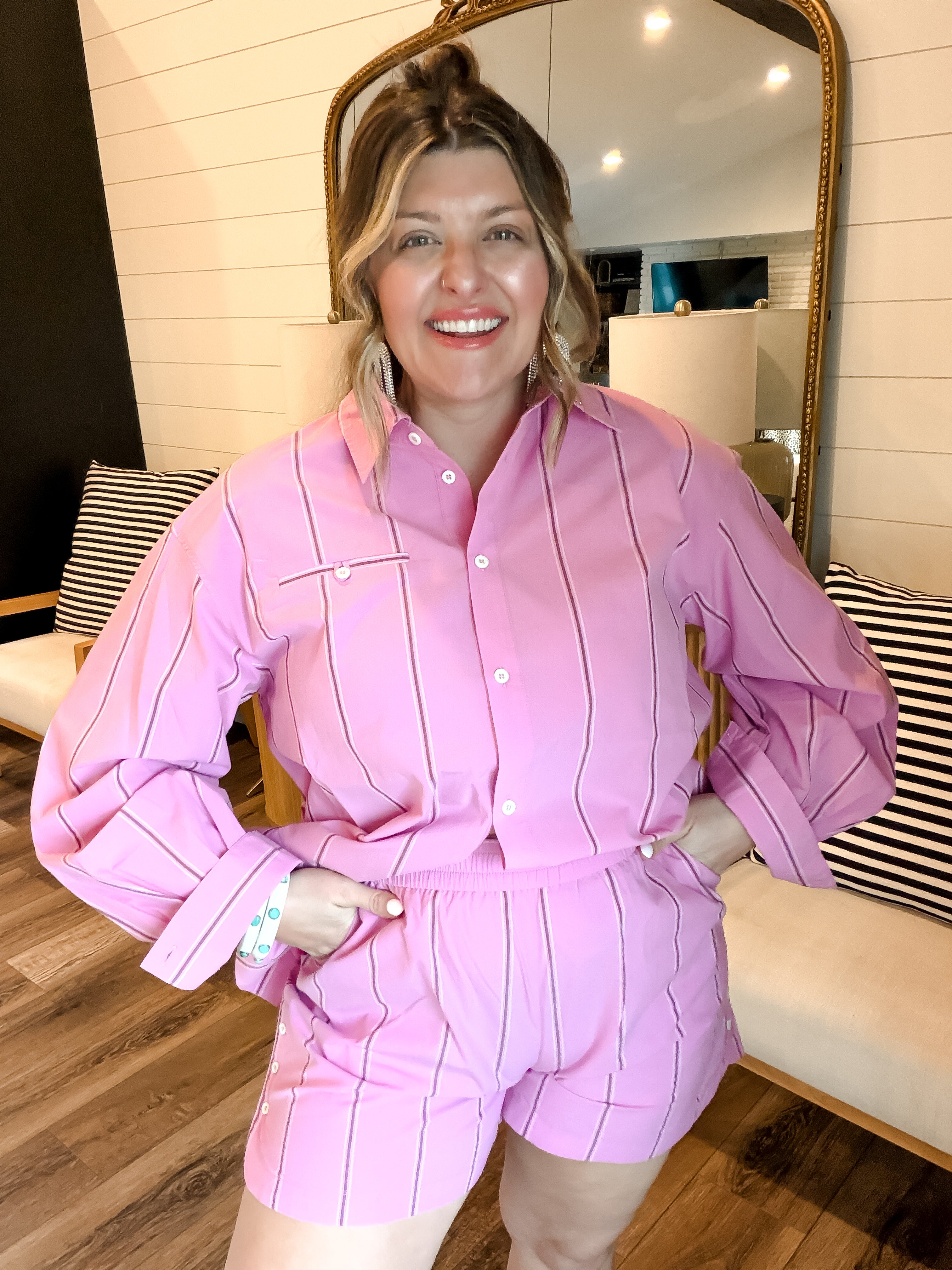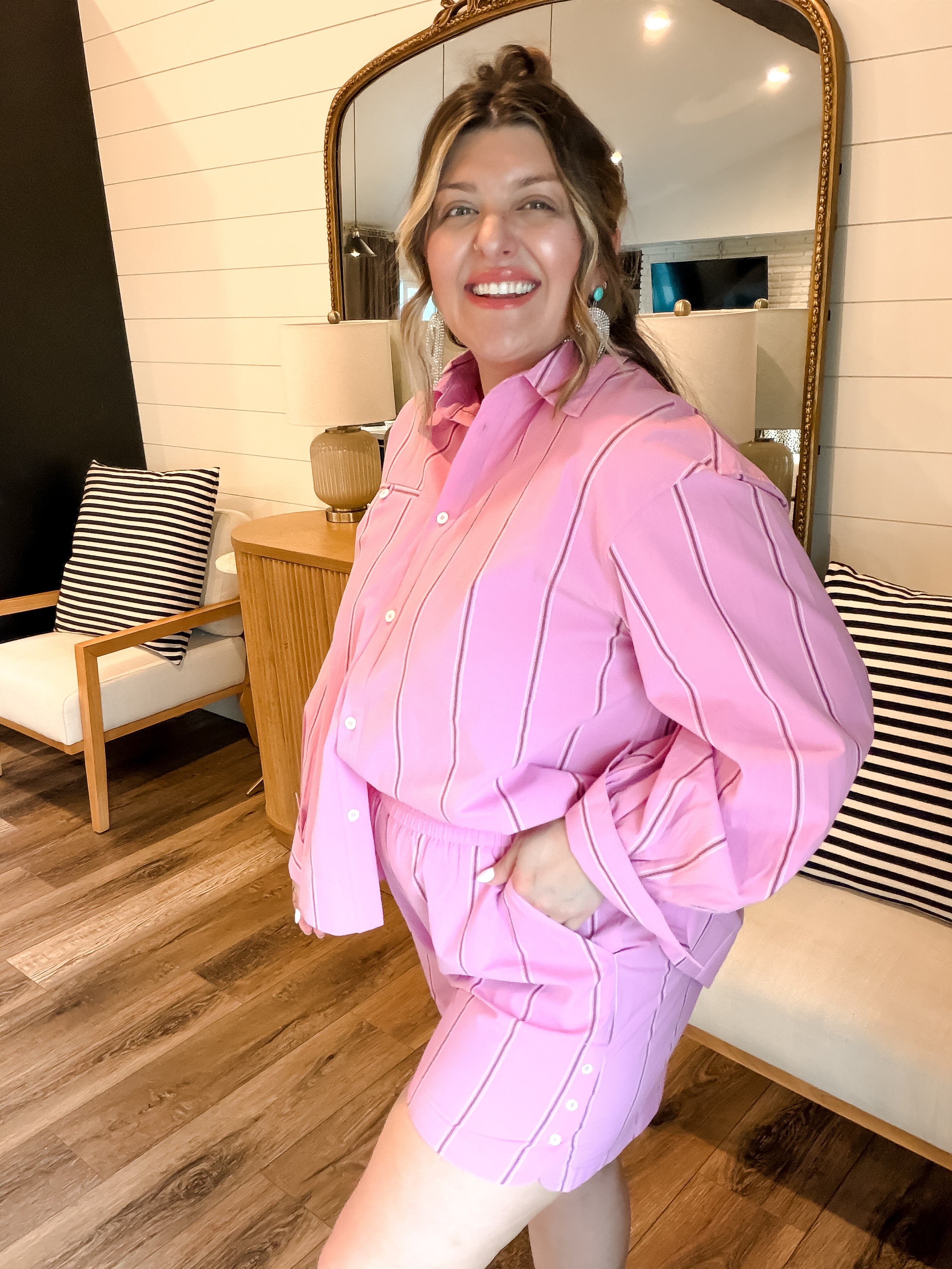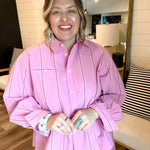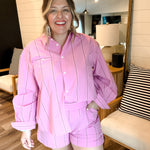 Bright, playful, and effortlessly polished — the Strawberry Stripes Shirt brings a fresh pop of color to your everyday wardrobe. Featuring soft pink fabric with subtle vertical stripe detailing, this button-down blouse offers a relaxed yet tailored fit that’s easy to style. Designed with a classic collar, front pocket, and lightweight feel, it pairs perfectly with the matching Strawberry Stripes Shorts or your favorite denim for a chic, put-together look.