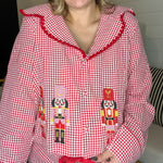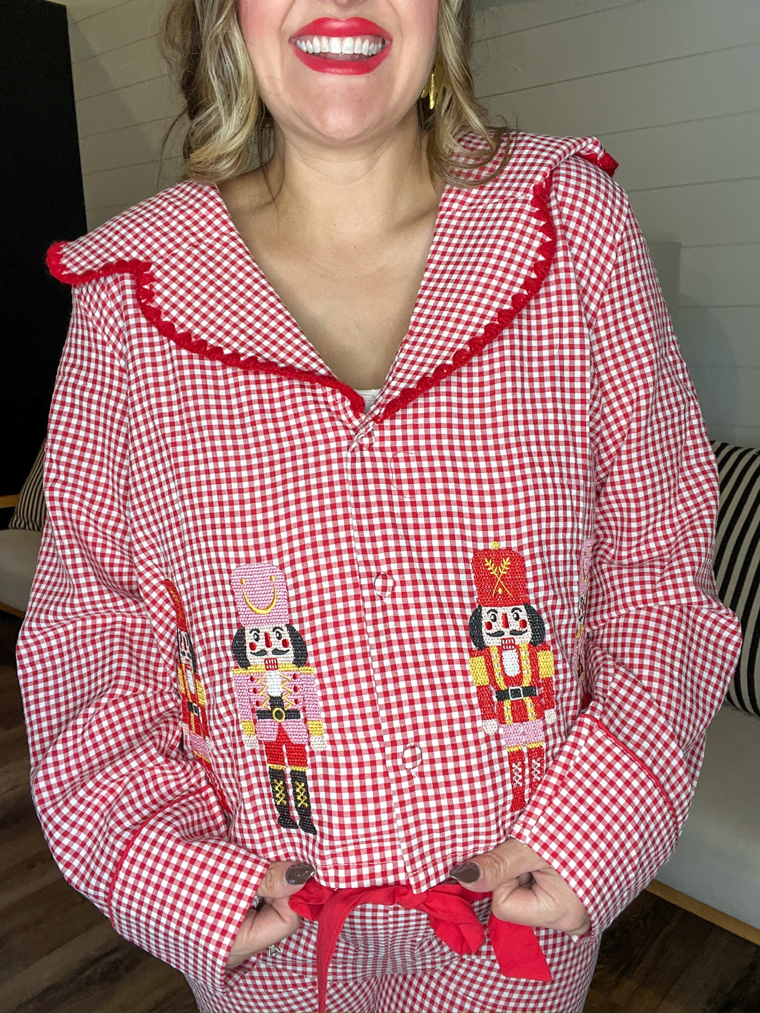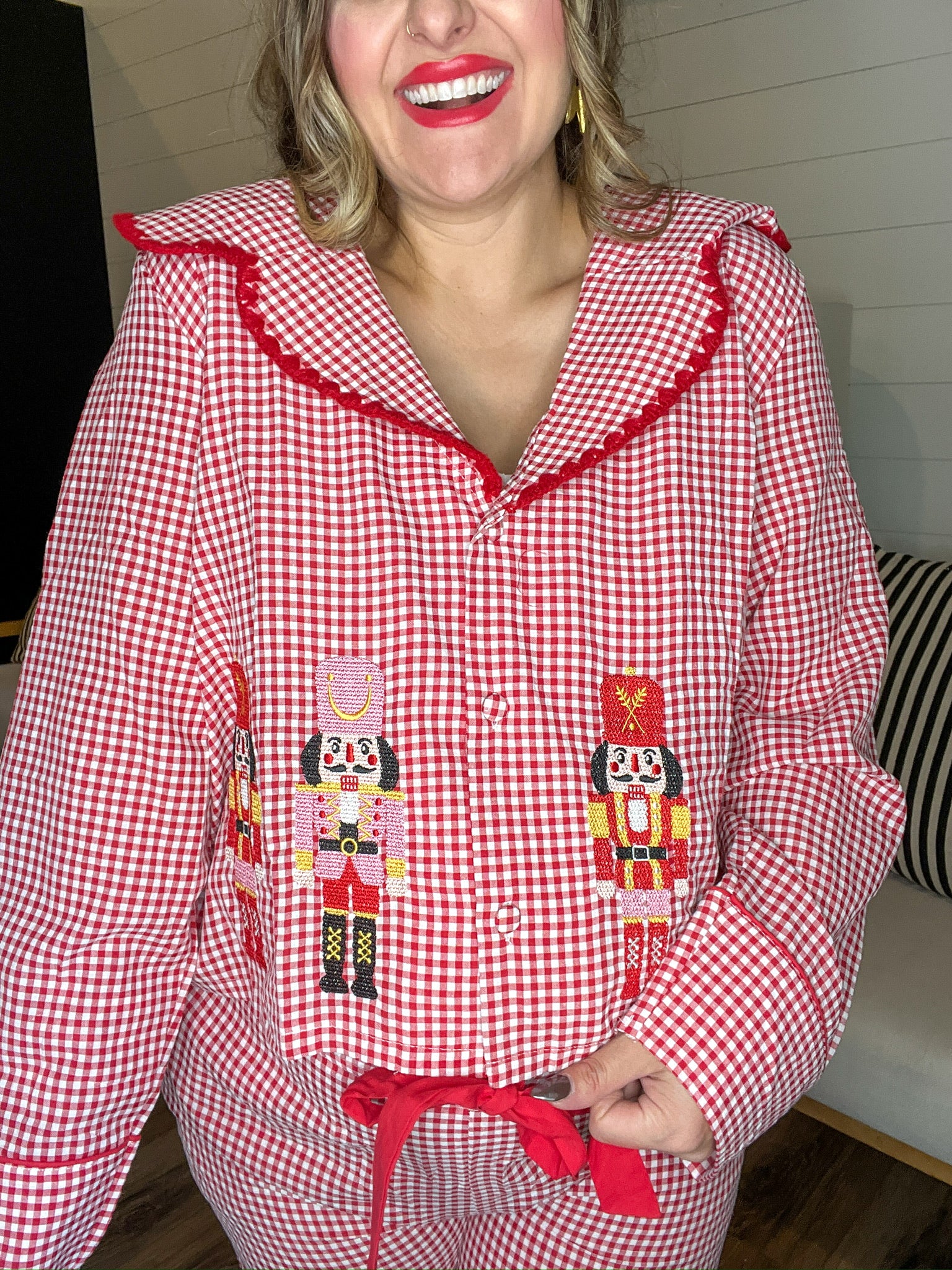 Ready for a little sugar plum slumber party? These red gingham pajamas bring the holiday cheer and the cozy. Embroidered nutcrackers march across the top and pants, ready for cocoa, card games, and cracking up ’til midnight. It’s a whole vibe.