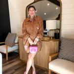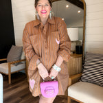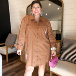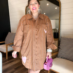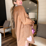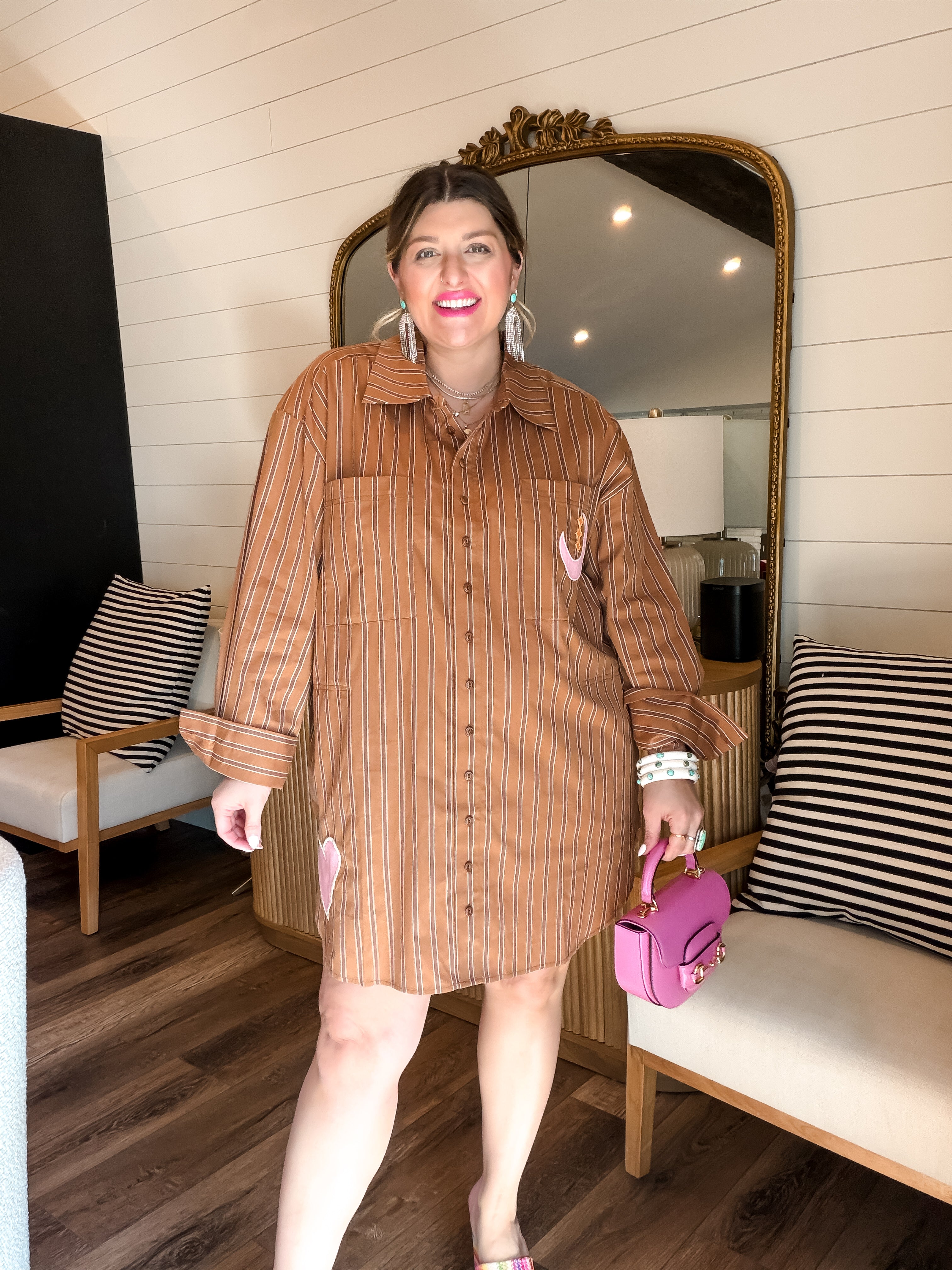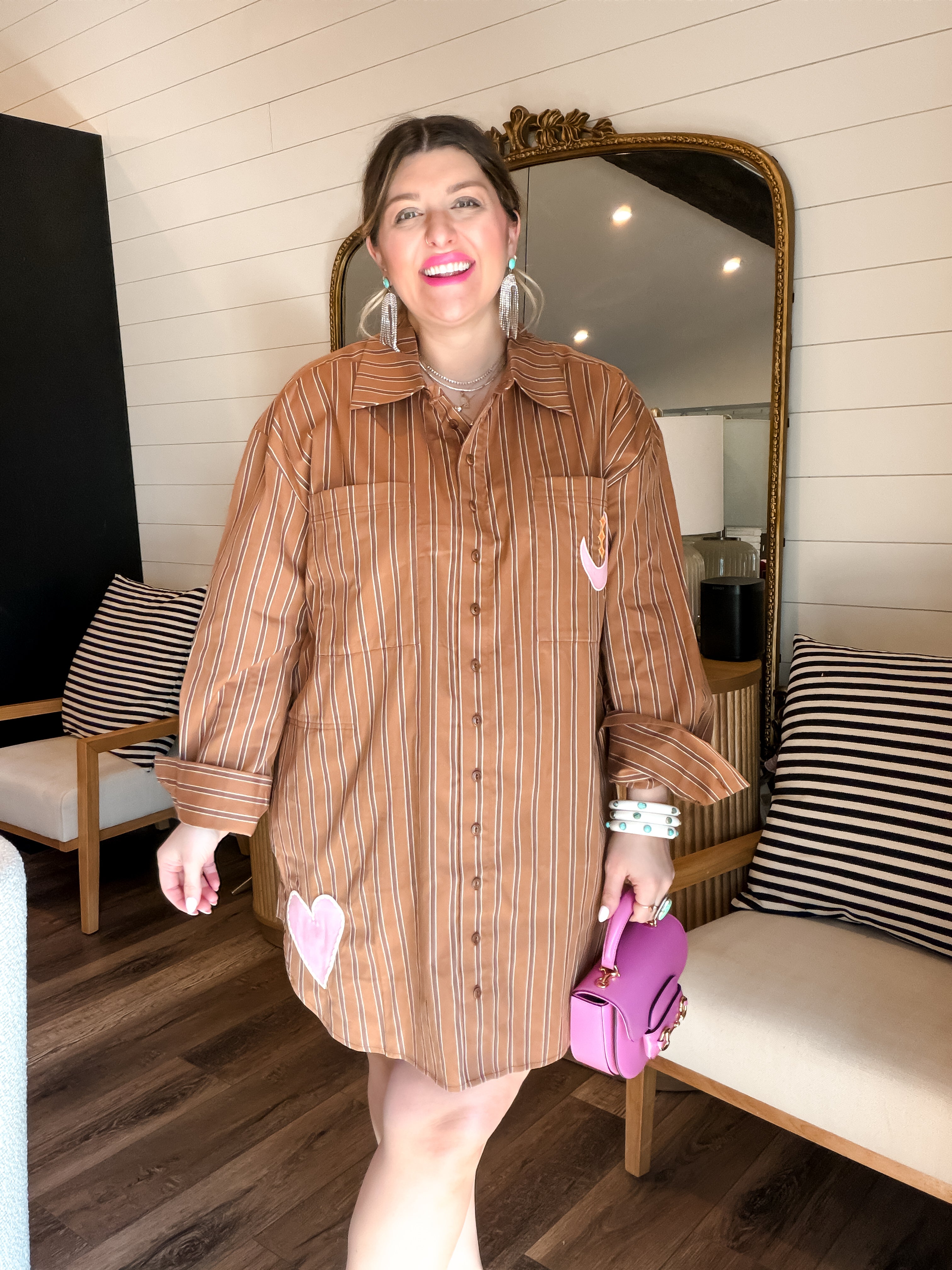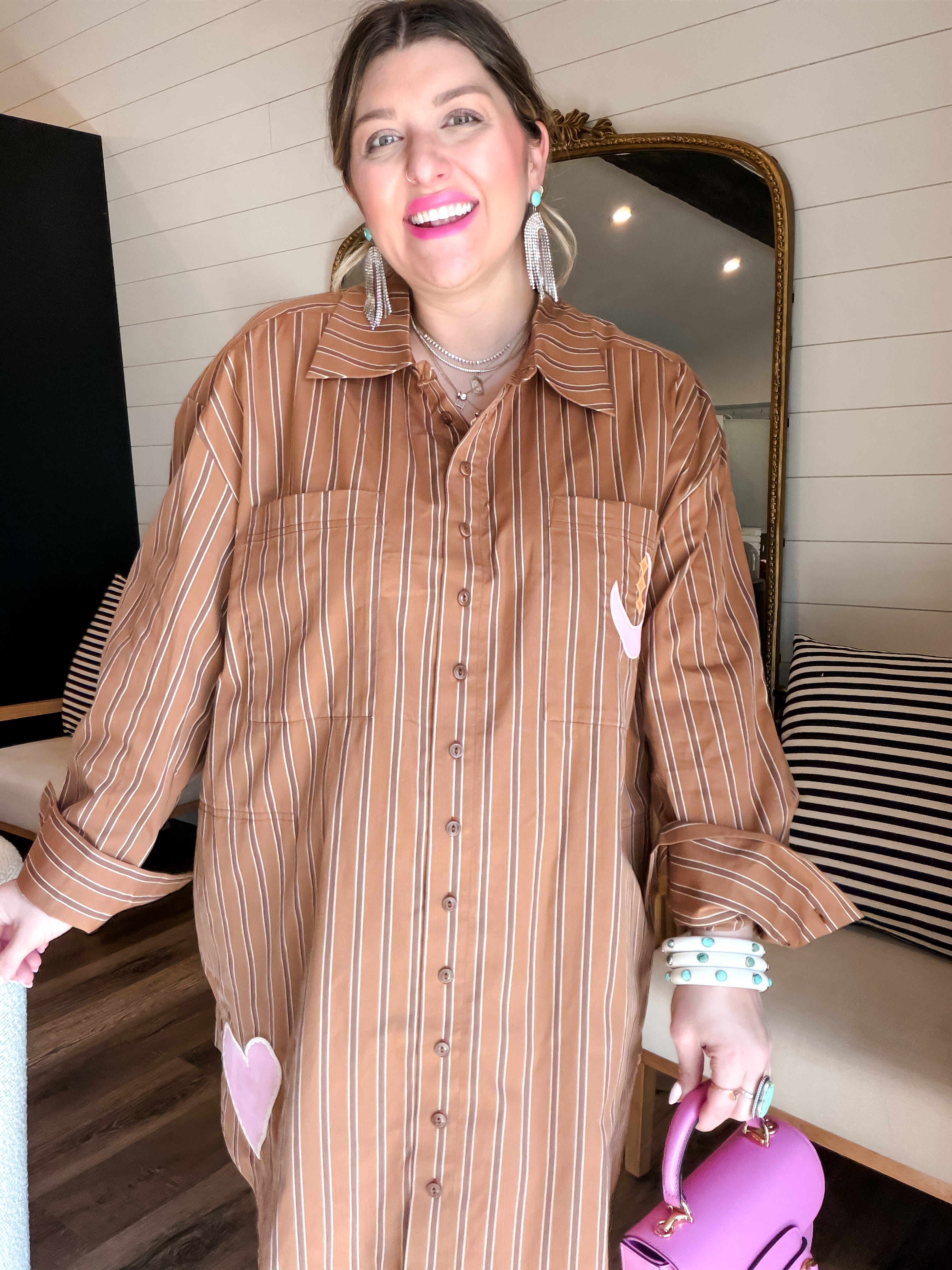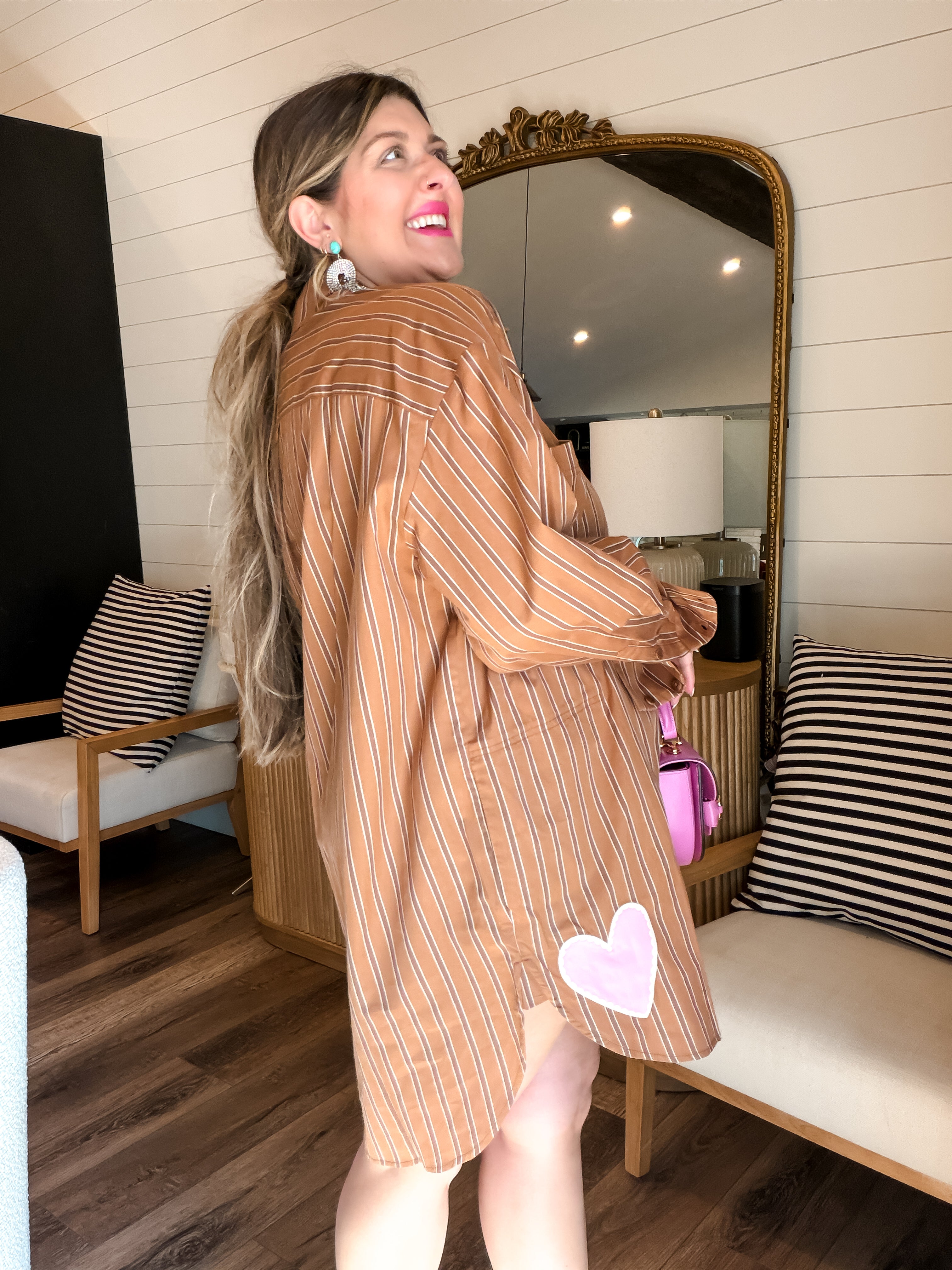 The Off Duty Shirt in Caramel Cafe is crafted from 100% organic cotton with a relaxed oversized fit and dropped shoulders. This piece moves with you from morning coffee to evening plans. The stripe print and custom applique details on the pocket and hem add personality without trying too hard. Long sleeves, front button opening, and an unlined construction keep things light and breezy. Pure comfort, pure cool.