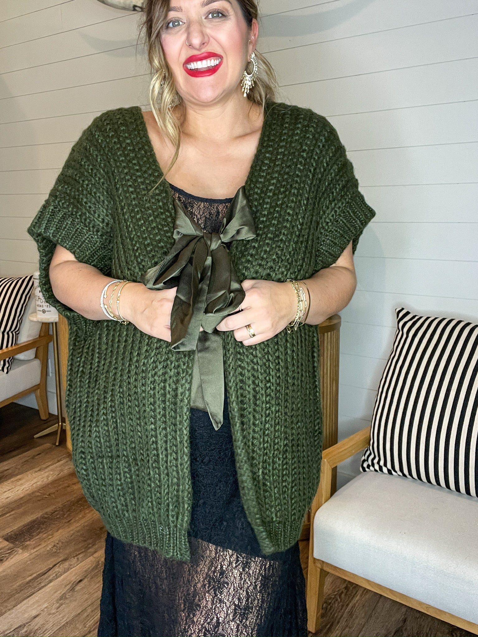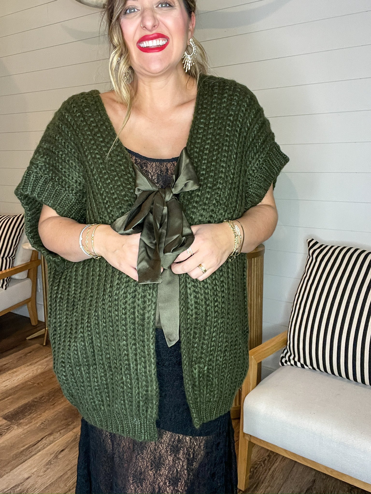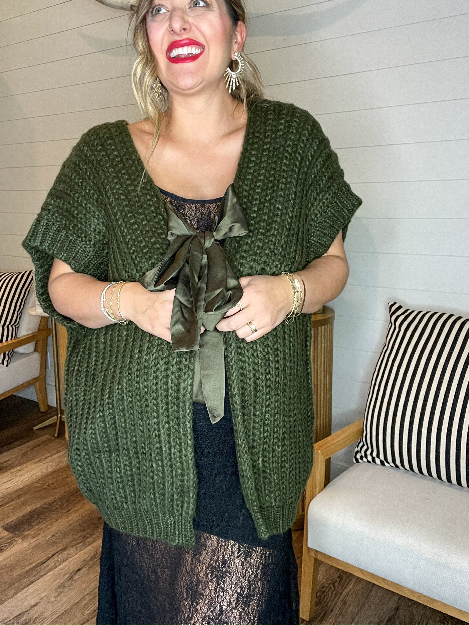 We olive a sweater moment—especially when it comes with a bow. This chunky open-knit vest features a romantic black satin tie and cozy-cool texture that instantly elevates whatever you throw underneath. She’s unexpected, a little earthy, and totally timeless.