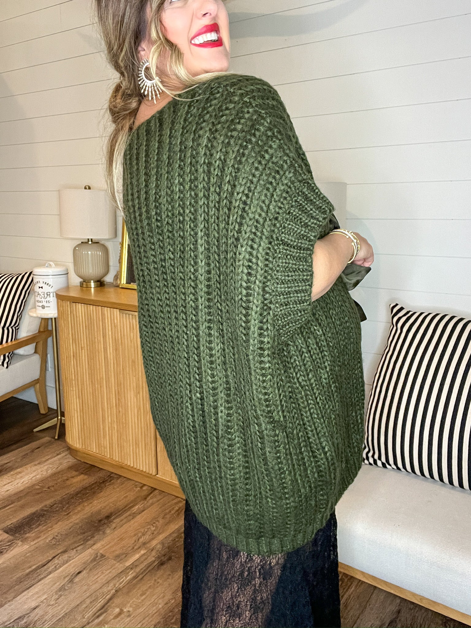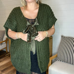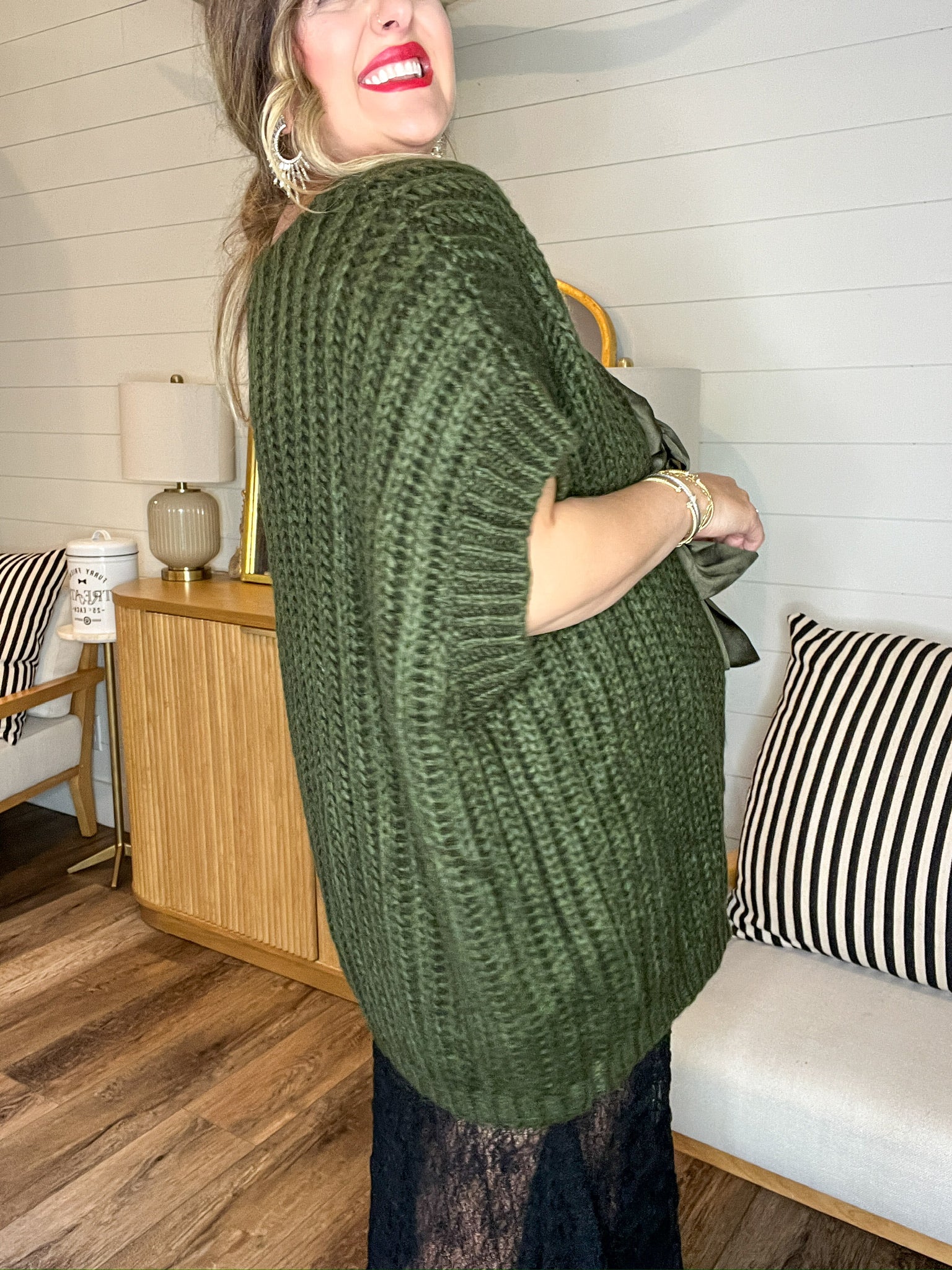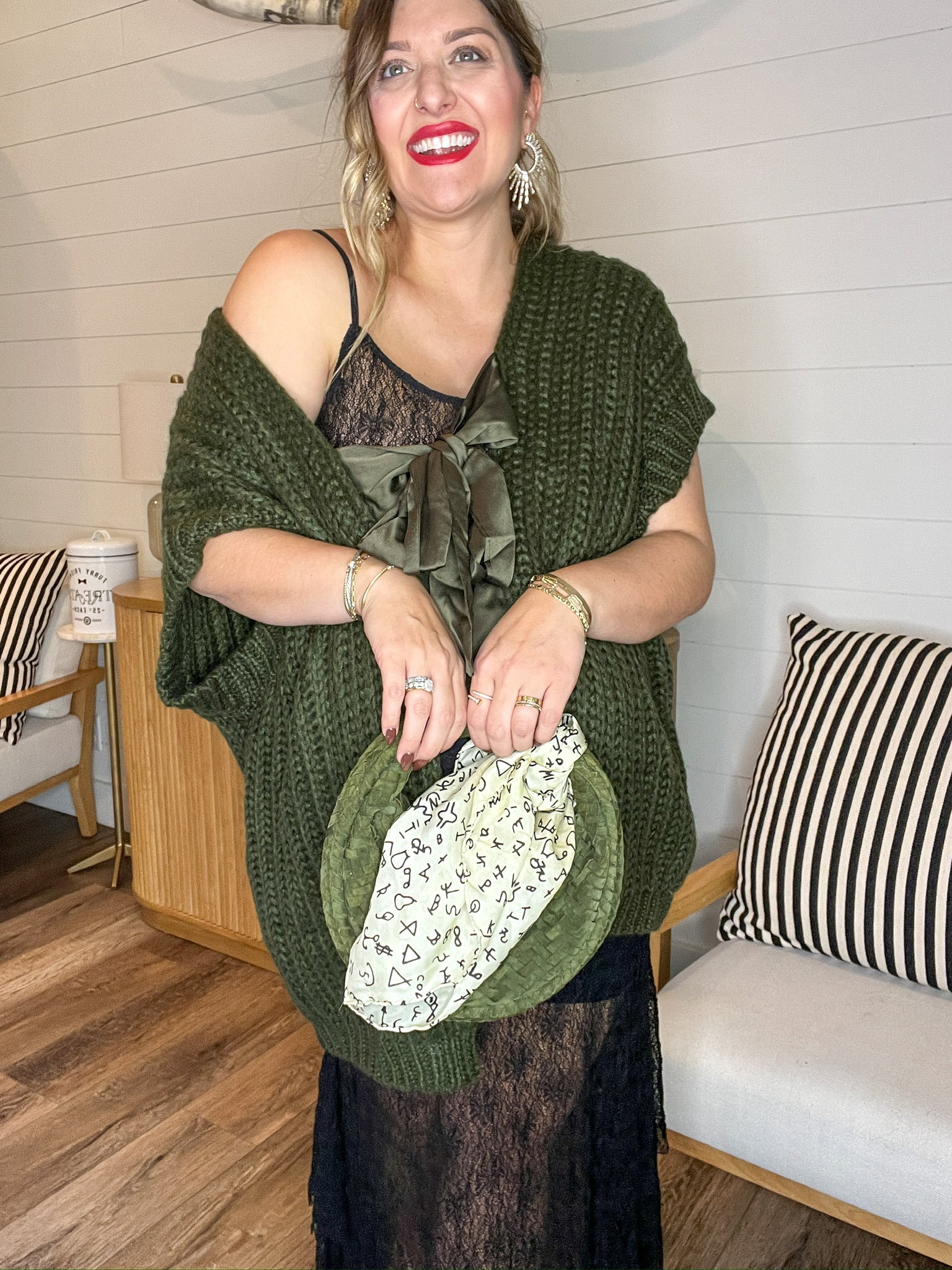 We olive a sweater moment—especially when it comes with a bow. This chunky open-knit vest features a romantic black satin tie and cozy-cool texture that instantly elevates whatever you throw underneath. She’s unexpected, a little earthy, and totally timeless.
