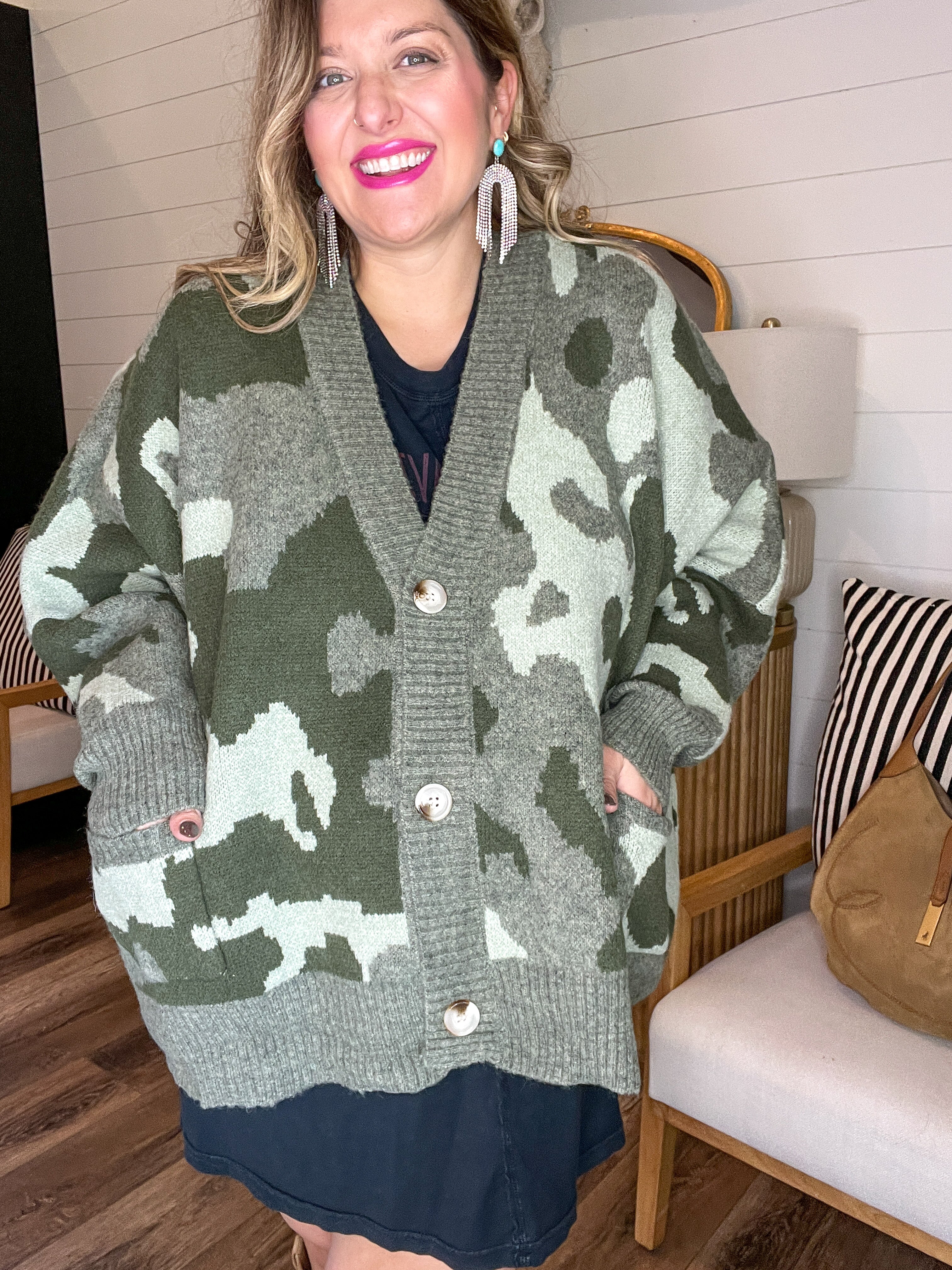 Let the chill hit—you’ve got layers like this. This chunky camo cardigan brings oversized vibes and off-duty cool to your fall rotation. With bold camo in moody greens and a slouchy button-up fit, it’s made for cozy coffee dates, Saturday errands, or curling up on the couch looking like a total style icon. Pockets? Obviously.