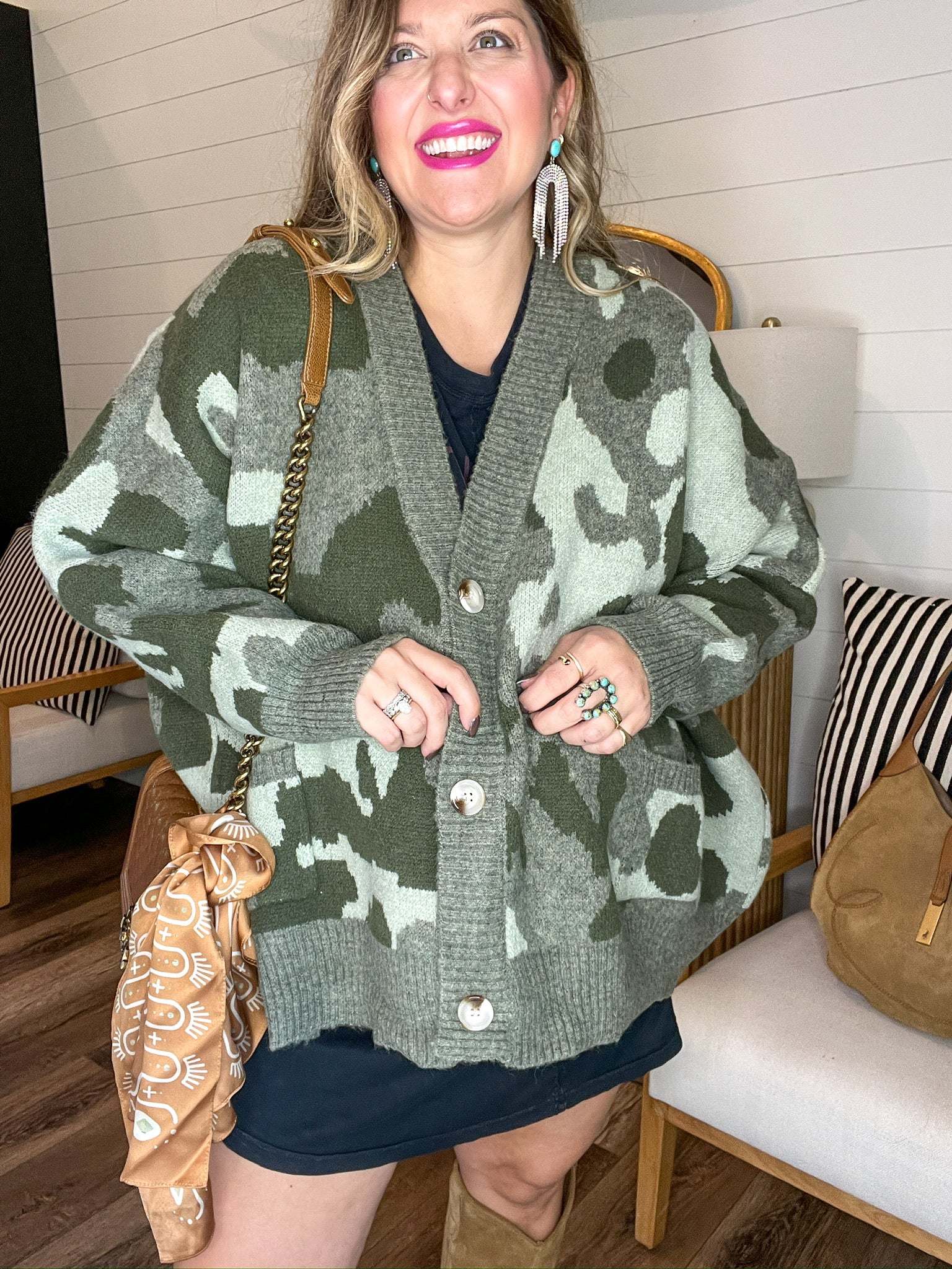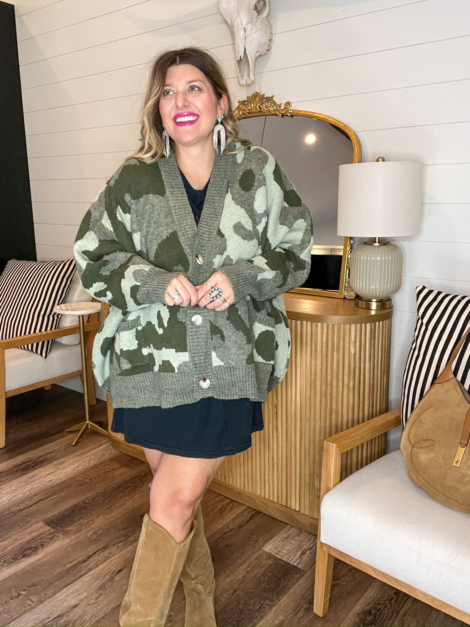 This is not your boyfriend’s camo. This is soft, slouchy, effortlessly undone camo that feels like a cozy fall exhale. The Woodland Daydream Cardigan is that throw-on-and-go layer you’ll keep by the door because it works with literally everything — leggings, denim, minis, messy hair, coffee in hand.
