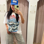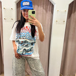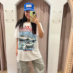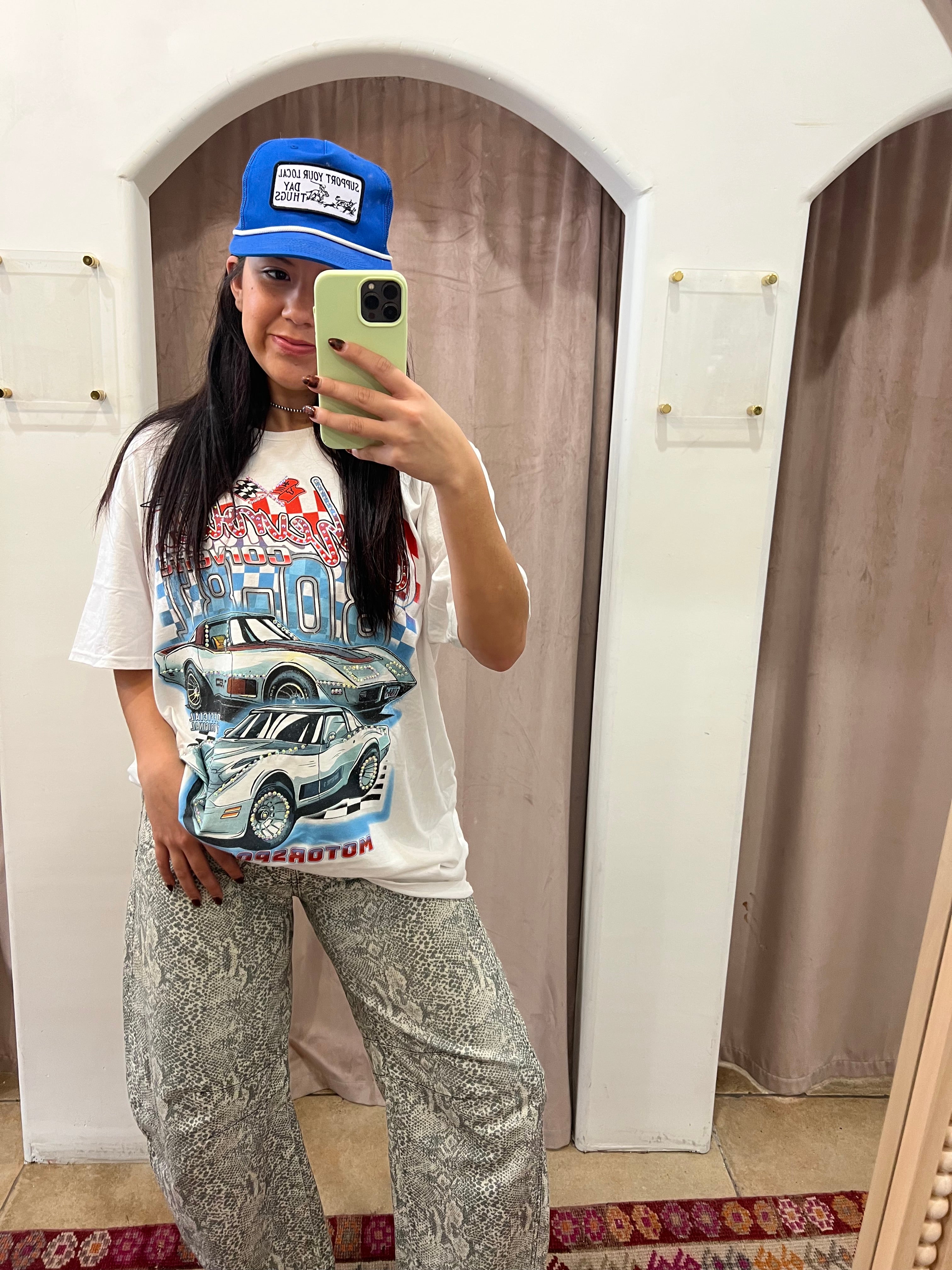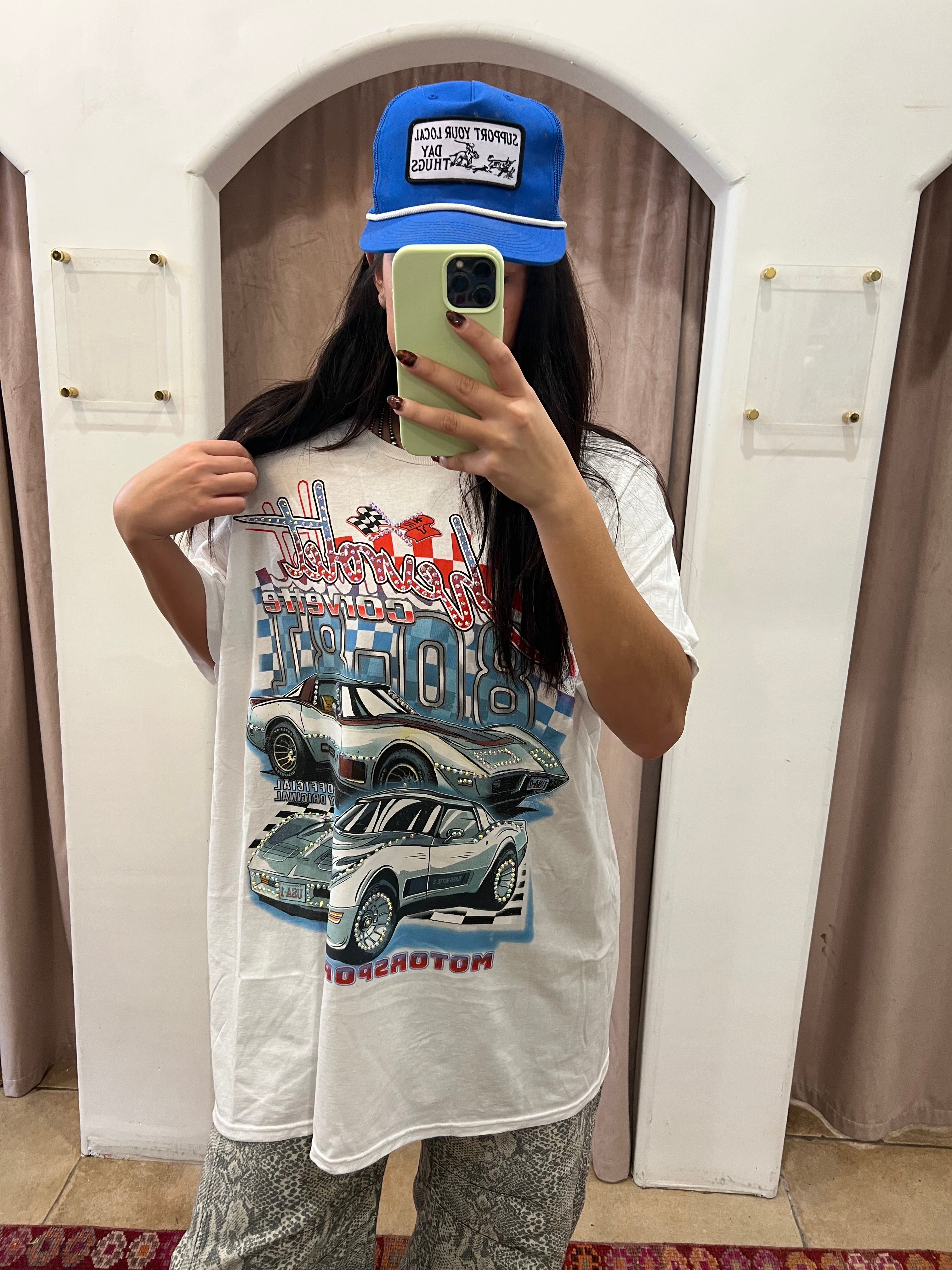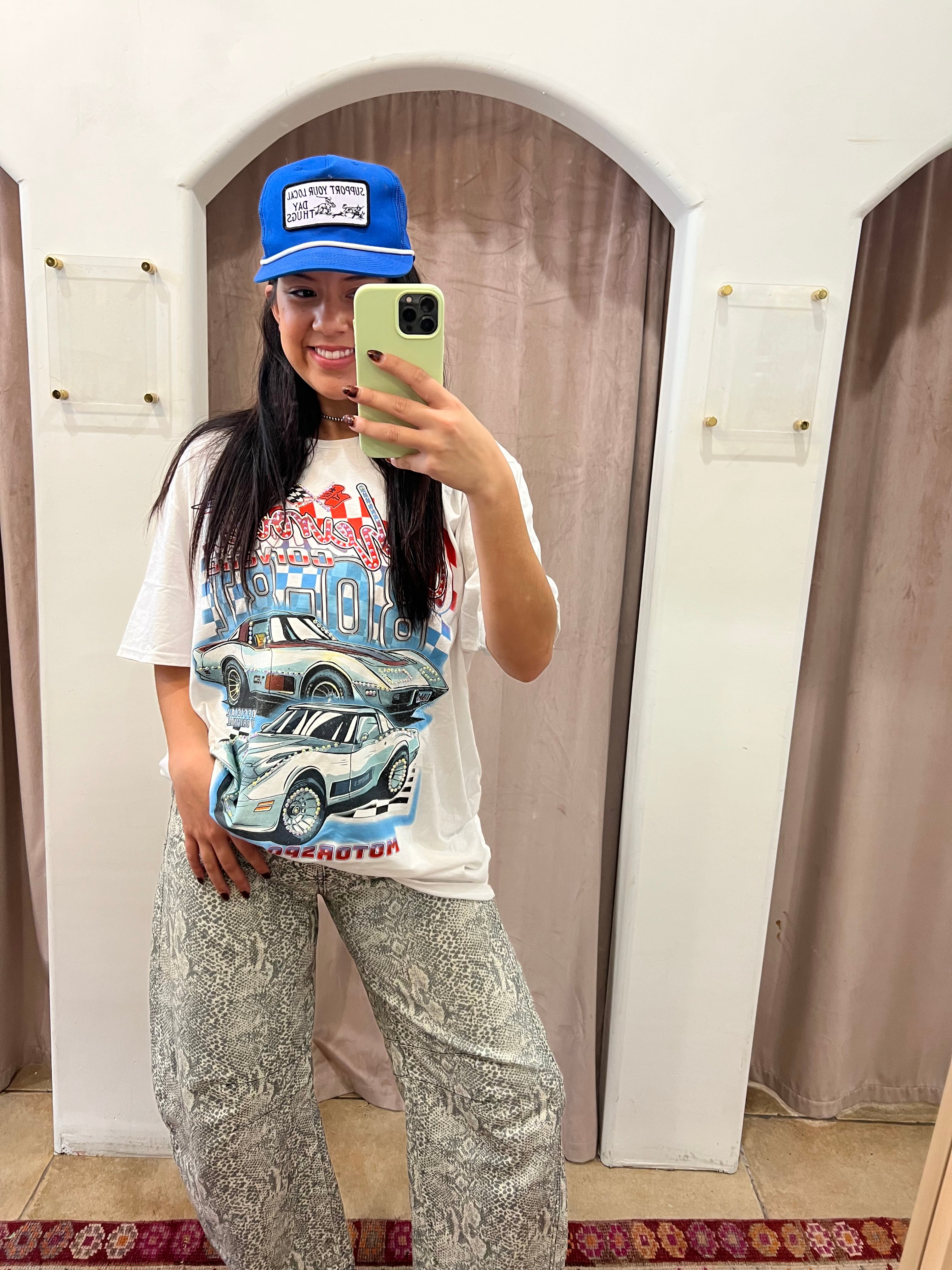Fast lane energy. This oversized tee brings major muscle car nostalgia with a bold Corvette graphic, classic checkered flags, and subtle rhinestone sparkle that catches the light like chrome on a summer day.