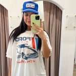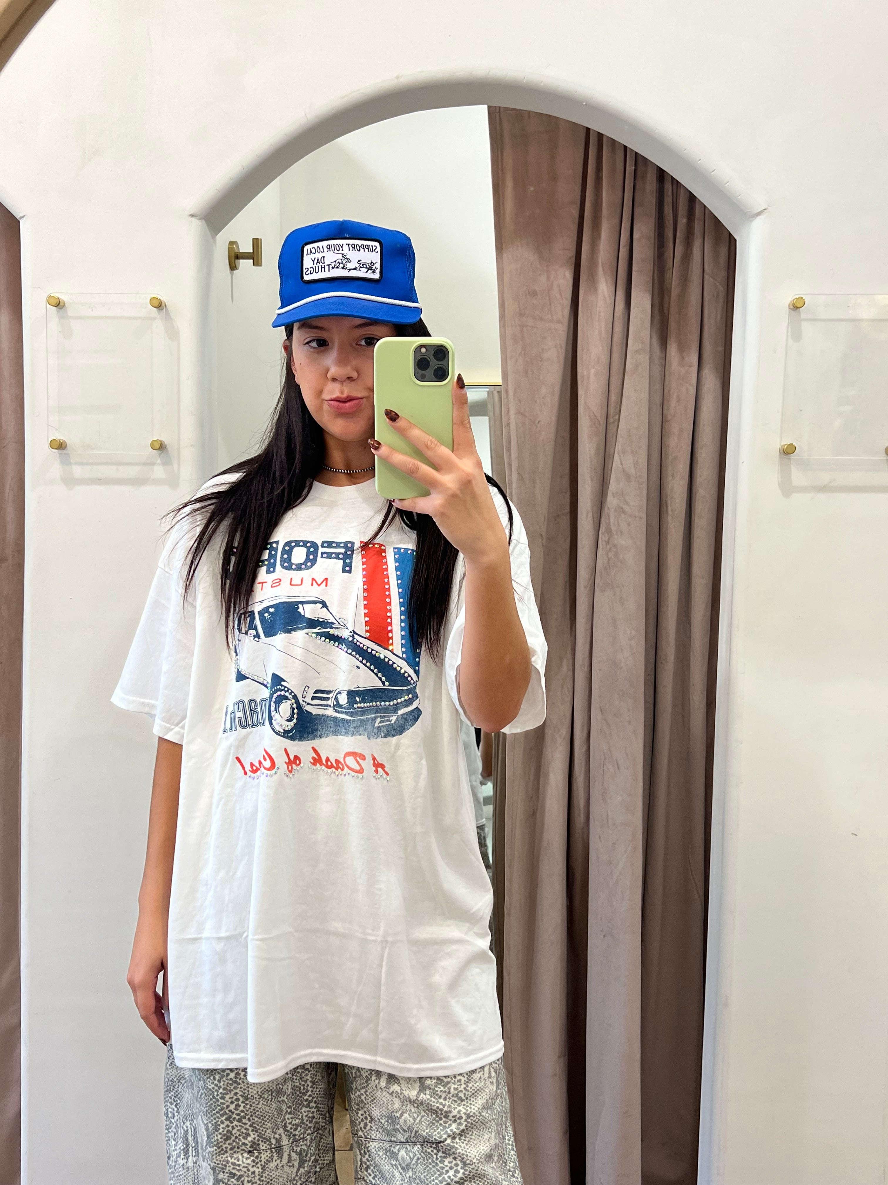 Built for speed. This Ford Mustang graphic tee mixes Americana grit with glam girl energy—oversized for a laid-back fit and sprinkled with rhinestones that shine harder than a chrome bumper at golden hour.